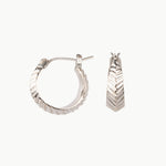Inspired by classic textile patterns, these sterling silver Herringbone hoops feature hand-carved chevron textures that converge to create an elegant peaked profile. The dimensional design catches light beautifully as you move, while the secure click-in hinge closure ensures worry-free wear. Sized perfectly for layered looks, these hoops add architectural interest to your curated ear without overwhelming it. Whether paired with your favorite studs or worn on their own, they bring a refined geometric element to your everyday style. Perfect for the collector who appreciates thoughtful details in their jewelry wardrobe.