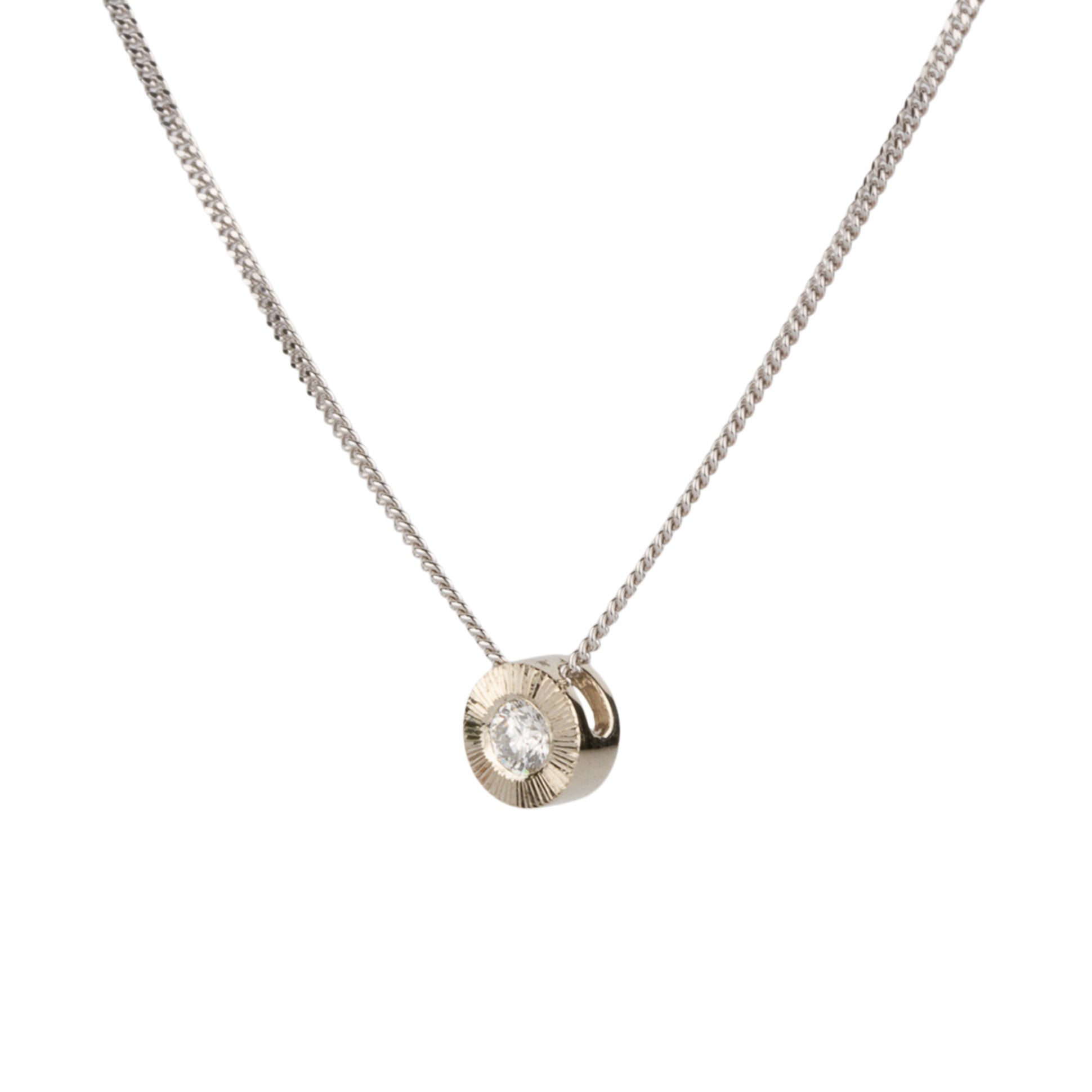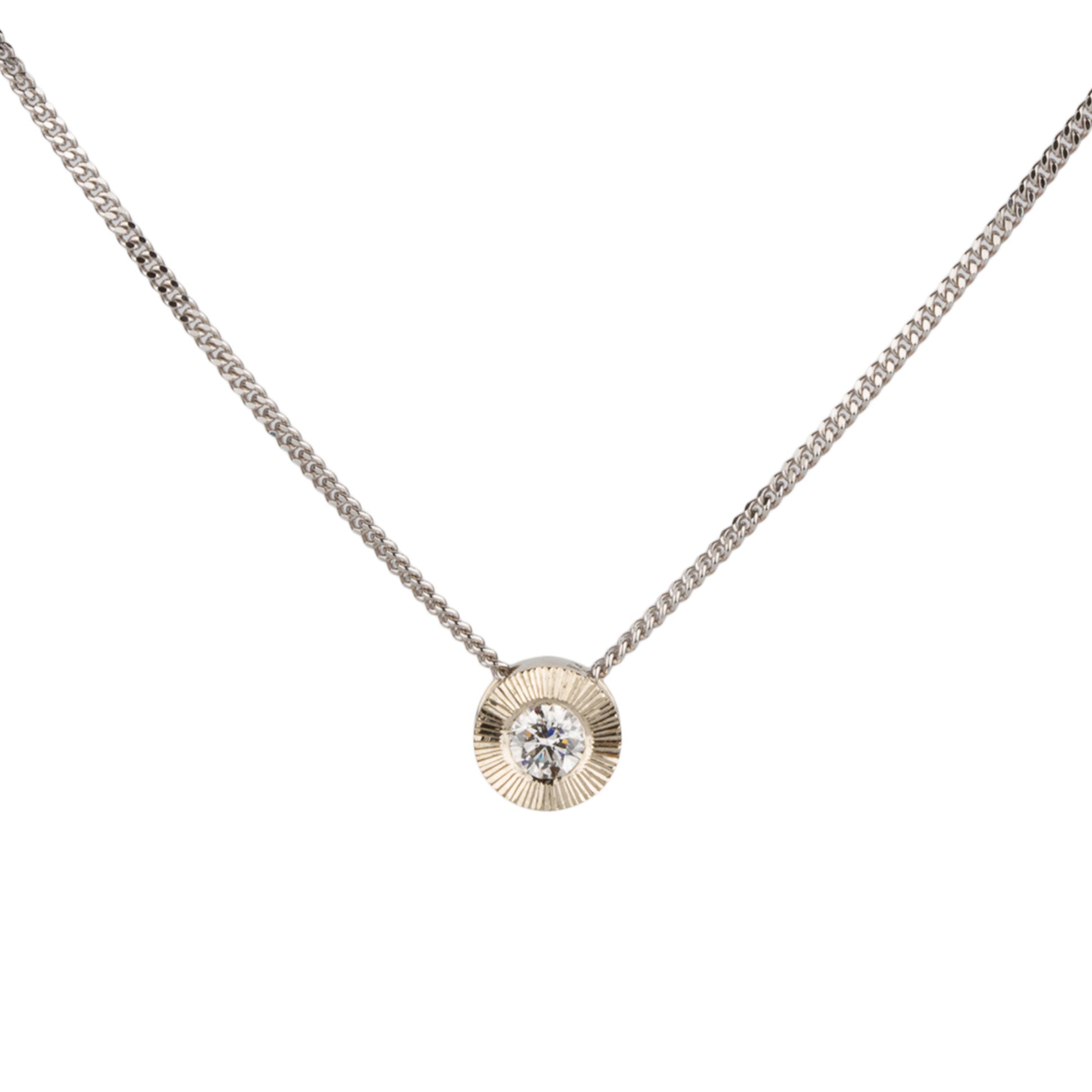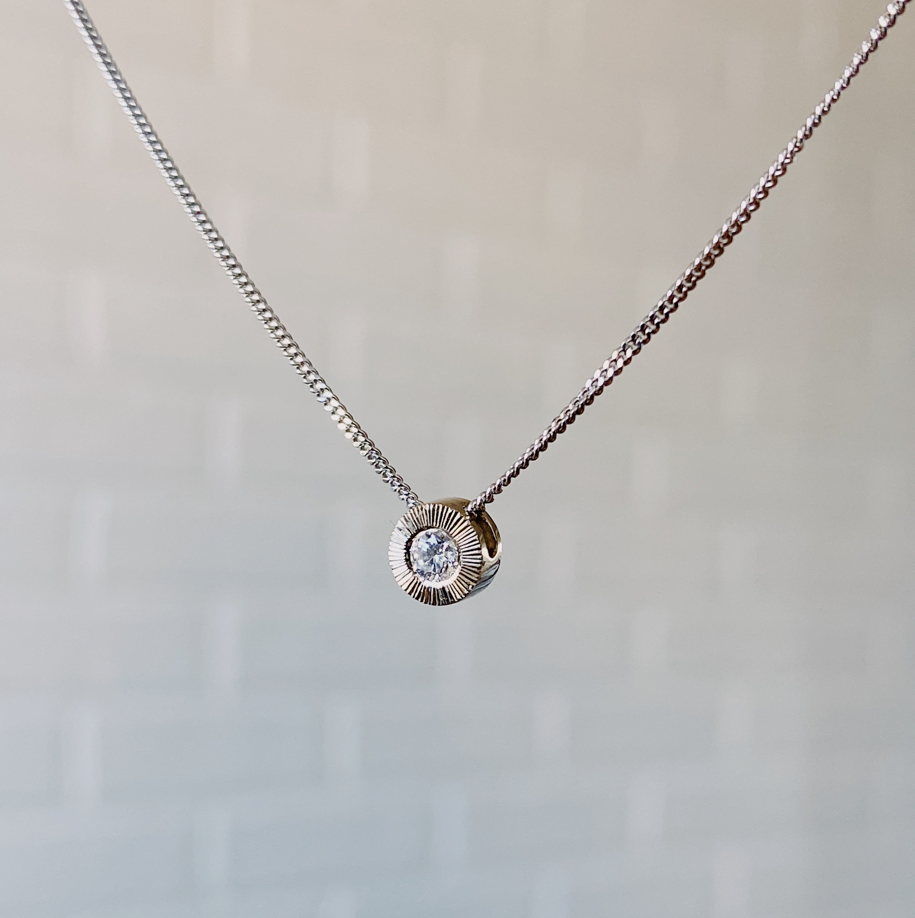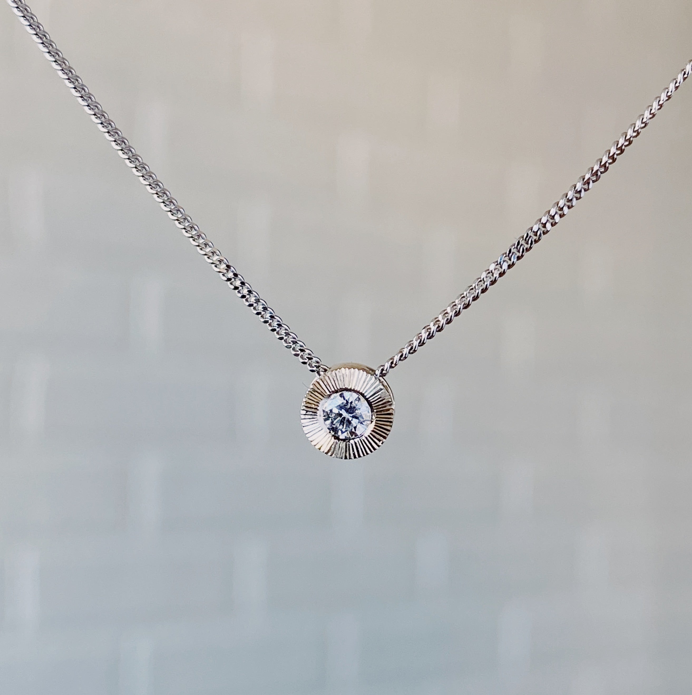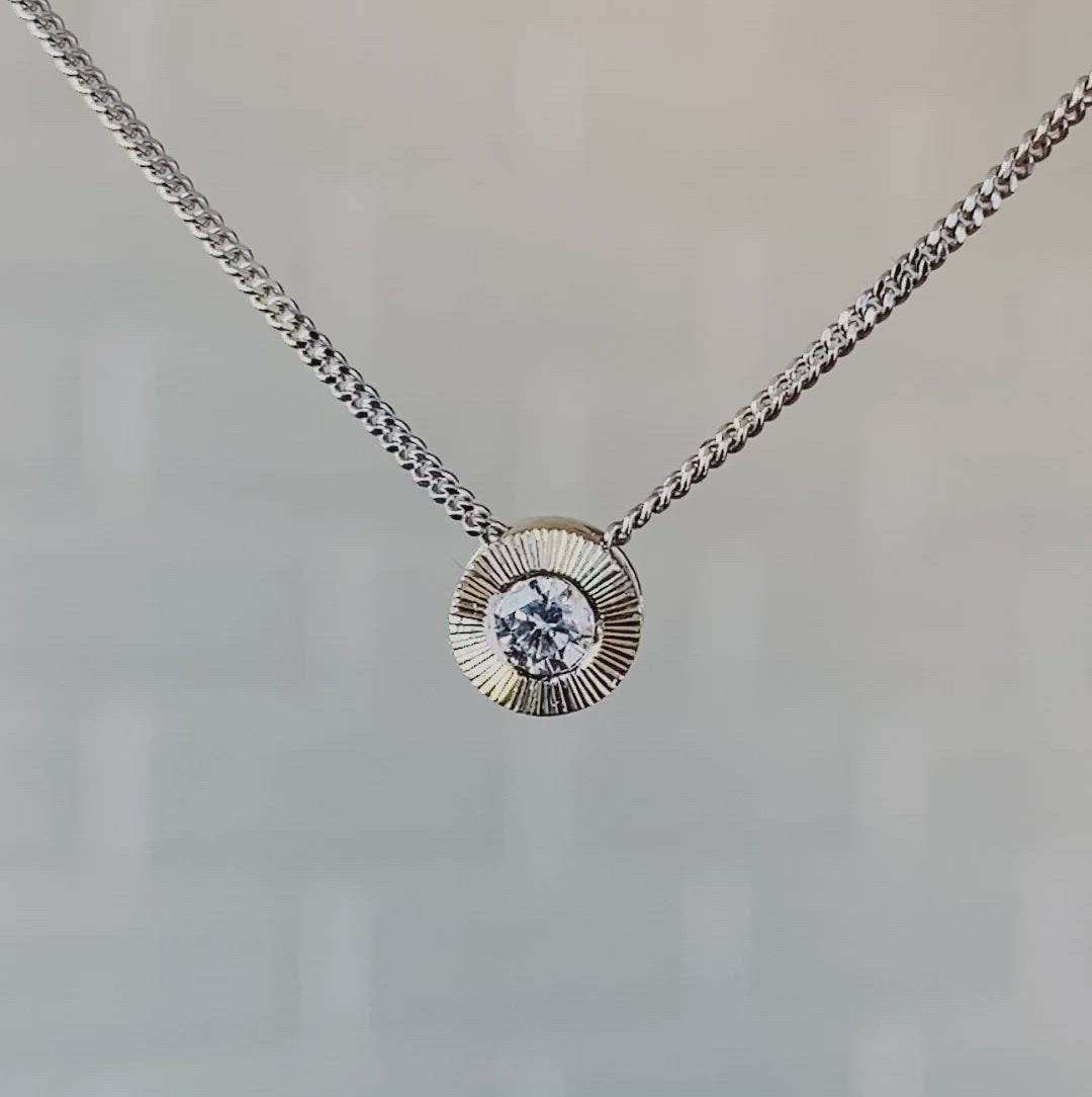 Our signature Aurora design features a recycled diamond nestled within hand-engraved rays that shimmer like sunbeams. This petite pendant slides freely along a silky, sparkling curb chain. Perfect for everyday wear, the small Aurora layers beautifully with other necklaces and can be paired with additional Aurora charms. Choose from 16" or 18" lengths to celebrate life's precious moments.