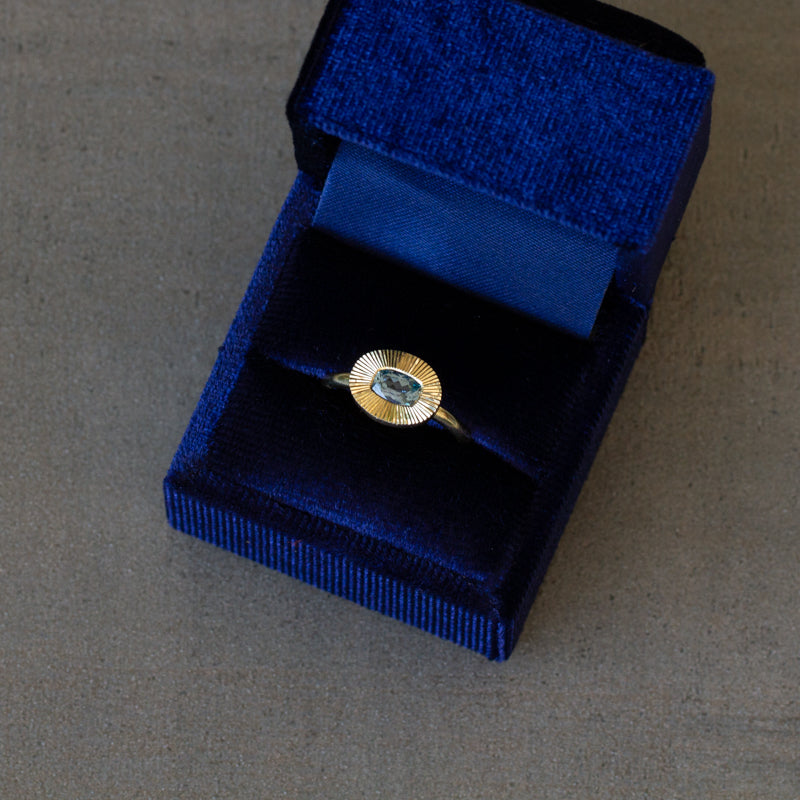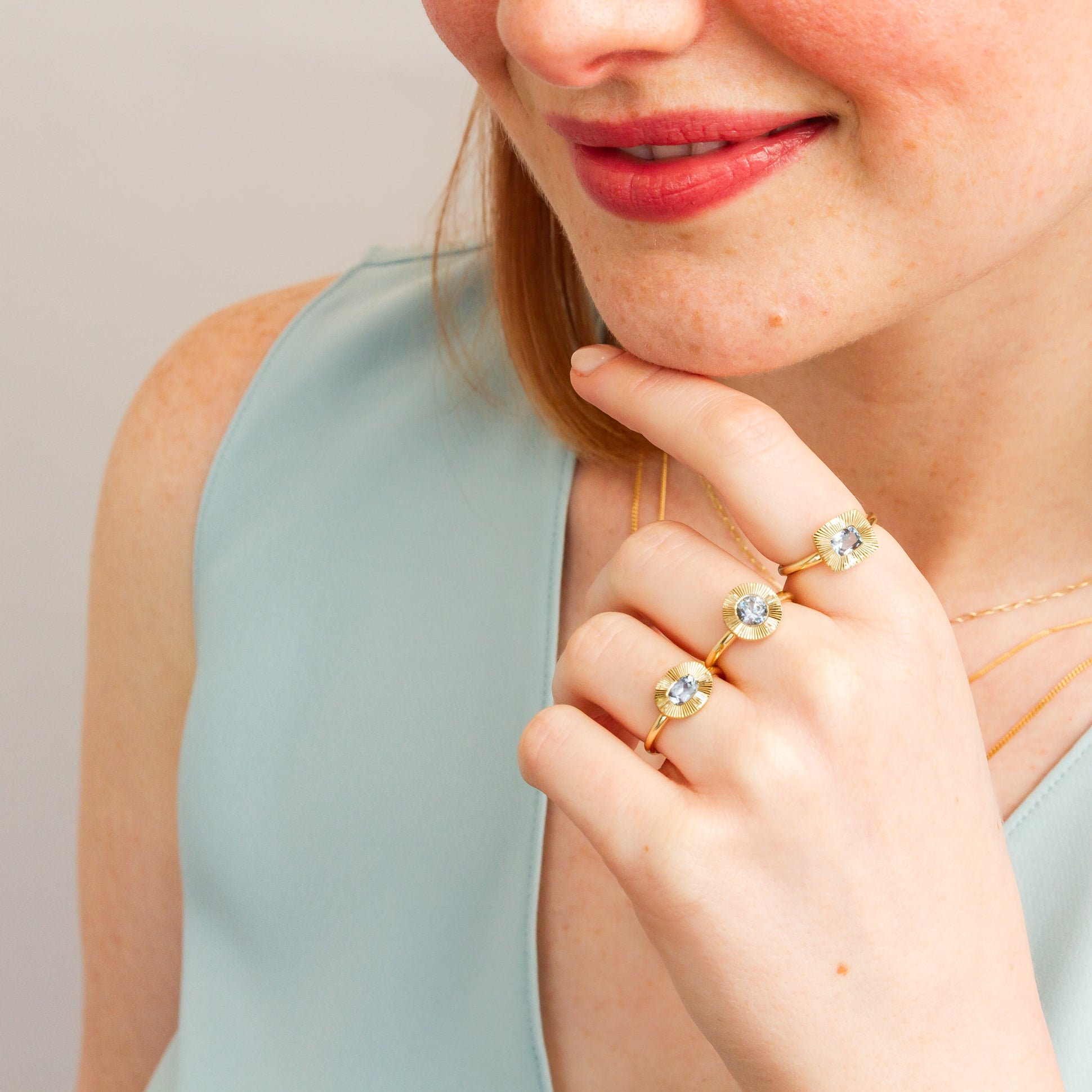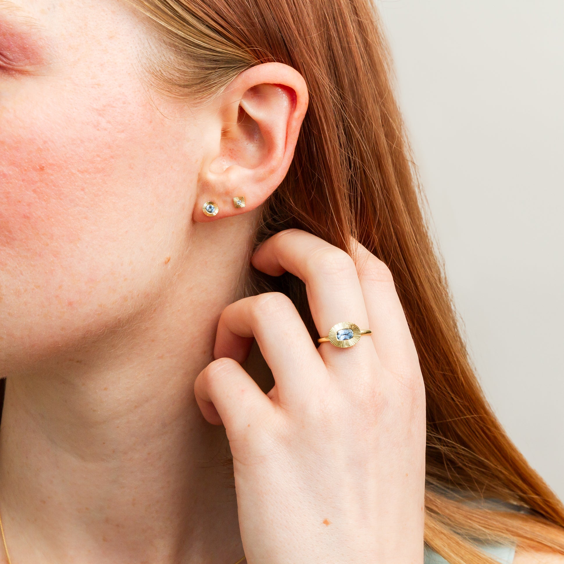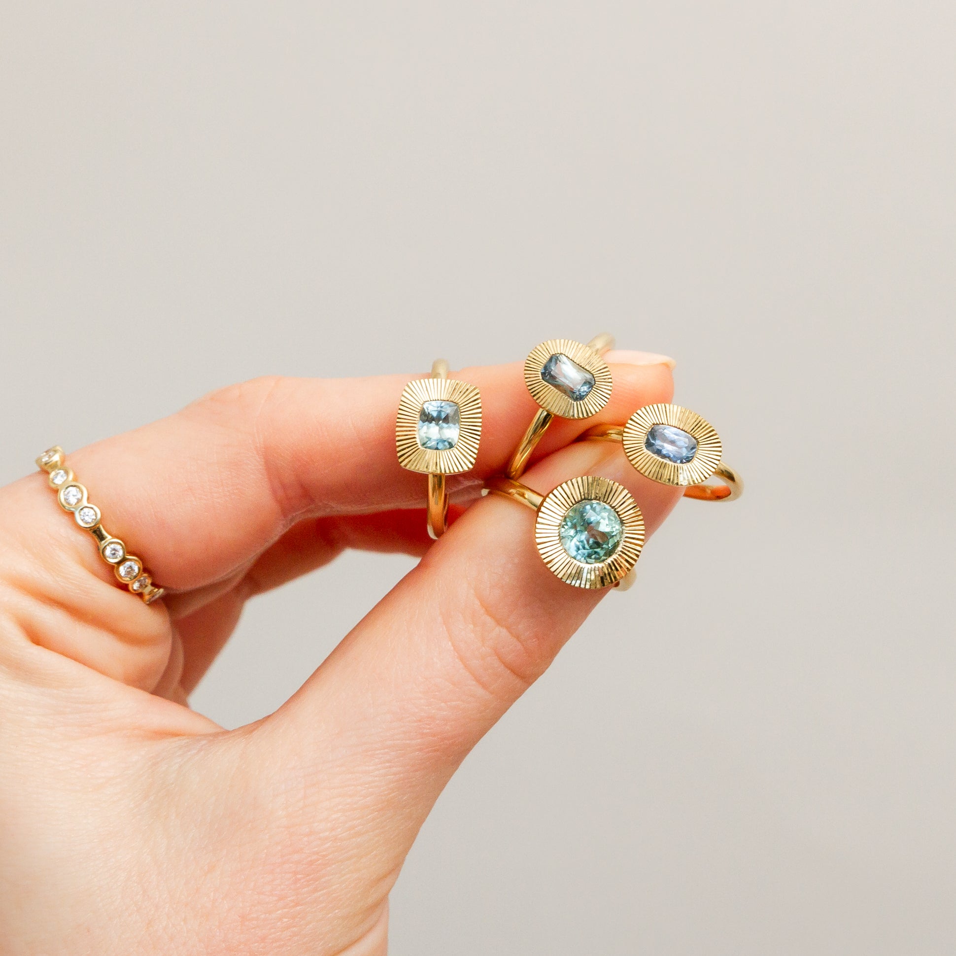 The Aurora Collection features our signature hand-engraved ray design, where meticulously carved ridges create a luminous halo that captures and reflects light like sunbeams around each gemstone. Available in engagement rings, necklaces, and earrings, each piece showcases artisanal hand-engraving that elevates ethically sourced Montana sapphires and carefully curated diamonds. Each hand-engraved ray is individually carved, making every Aurora piece a work of wearable art.