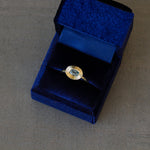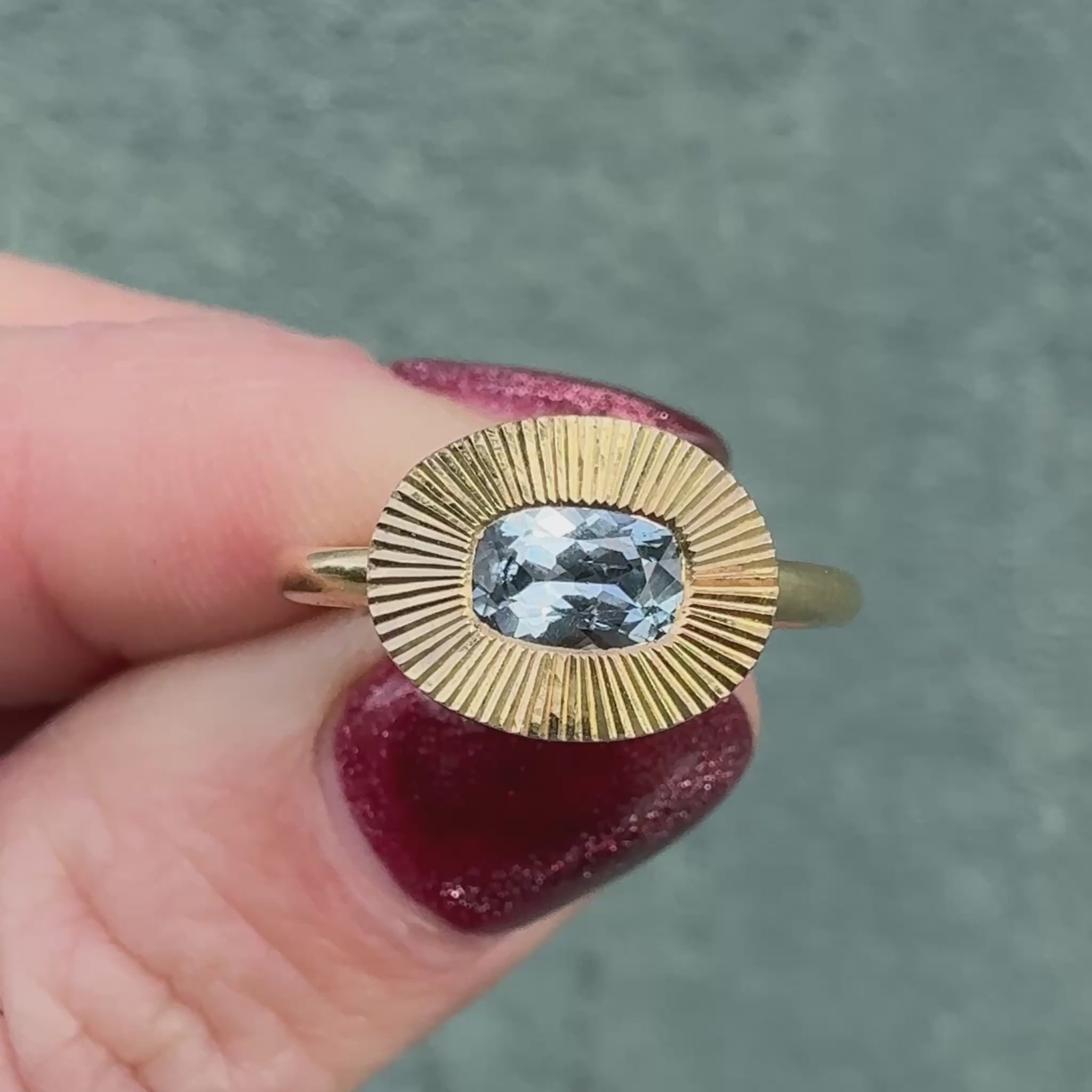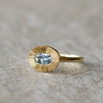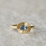 Our signature Aurora design showcases a striking .60ct Montana sapphire in a contemporary east-west orientation, nestled within hand-engraved rays that shimmer like sunbeams. The artful radial pattern in warm 14k gold creates an elegant frame for this cushion-cut gem, while the elevated setting allows light to dance through the stone from all angles.