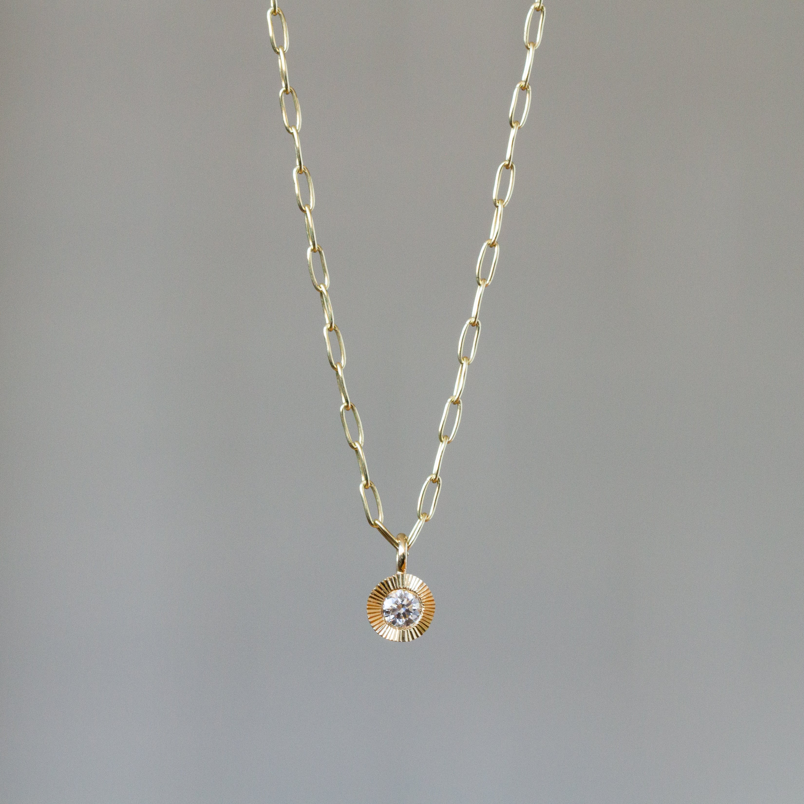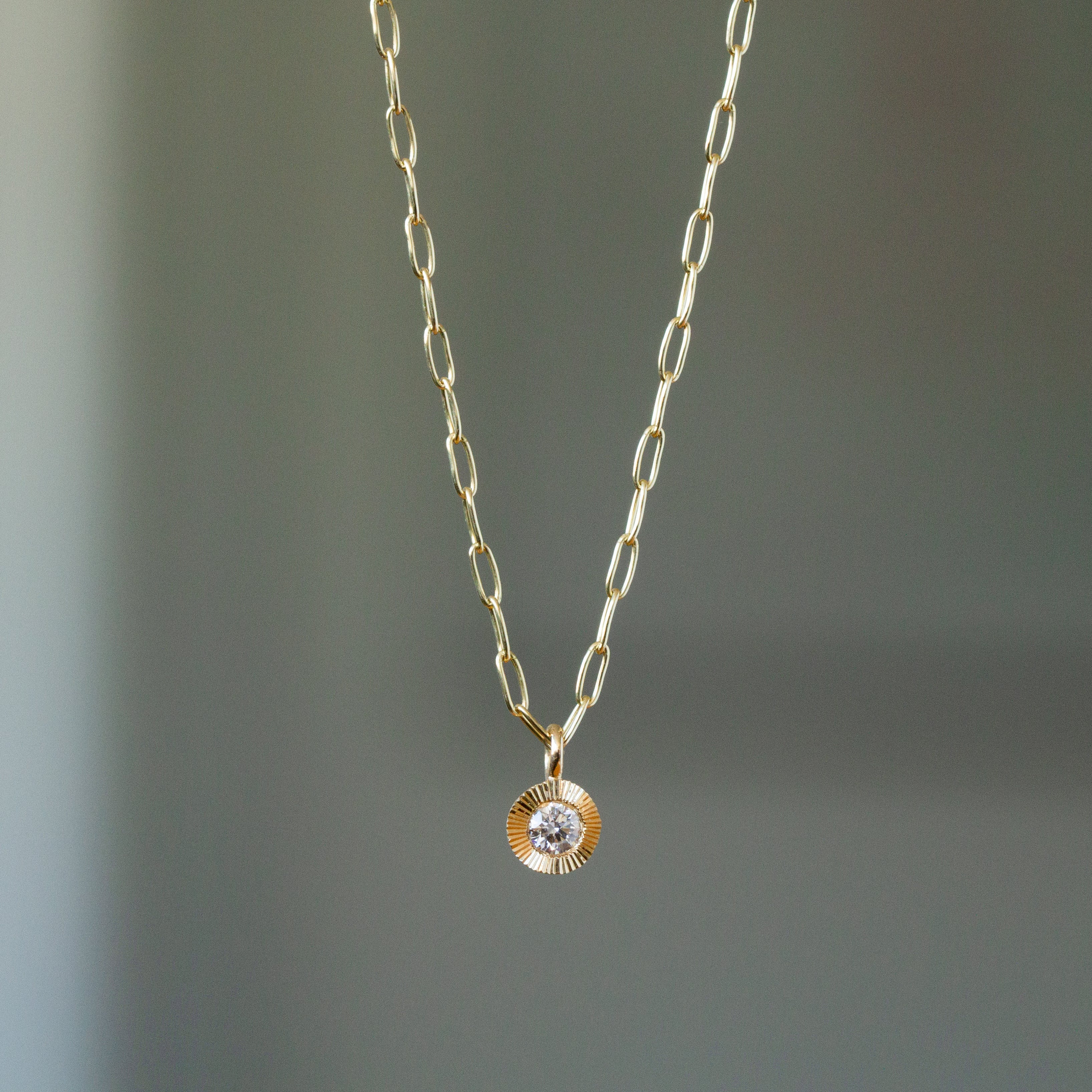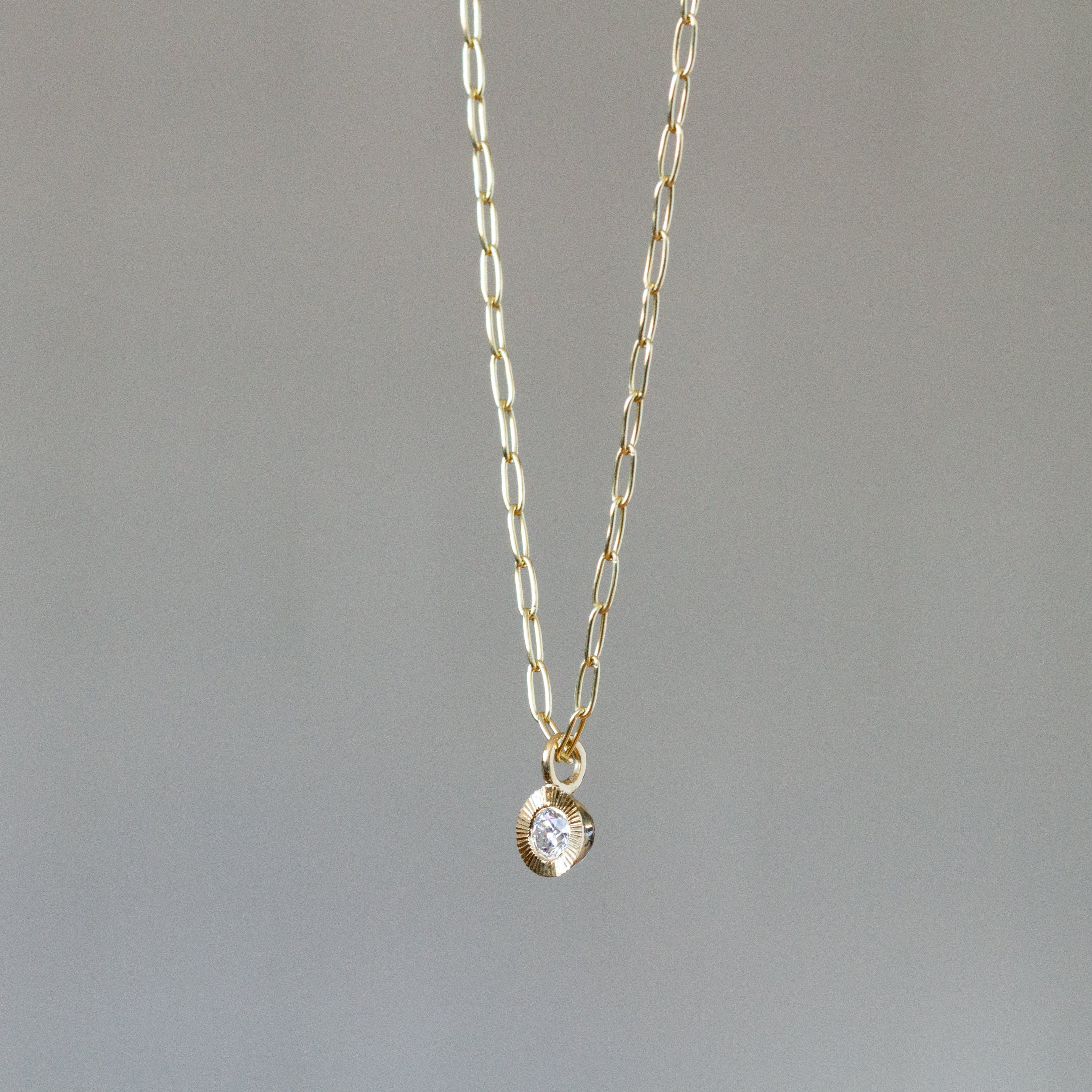 The Aurora Drop Pendant captures the radiance of dawn in 14k yellow gold, featuring a thoughtfully sourced recycled diamond that catches light from every angle. A meticulously hand-engraved sunburst pattern encircles the stone, creating an organic play of light and shadow that makes this piece both a statement and everyday essential.