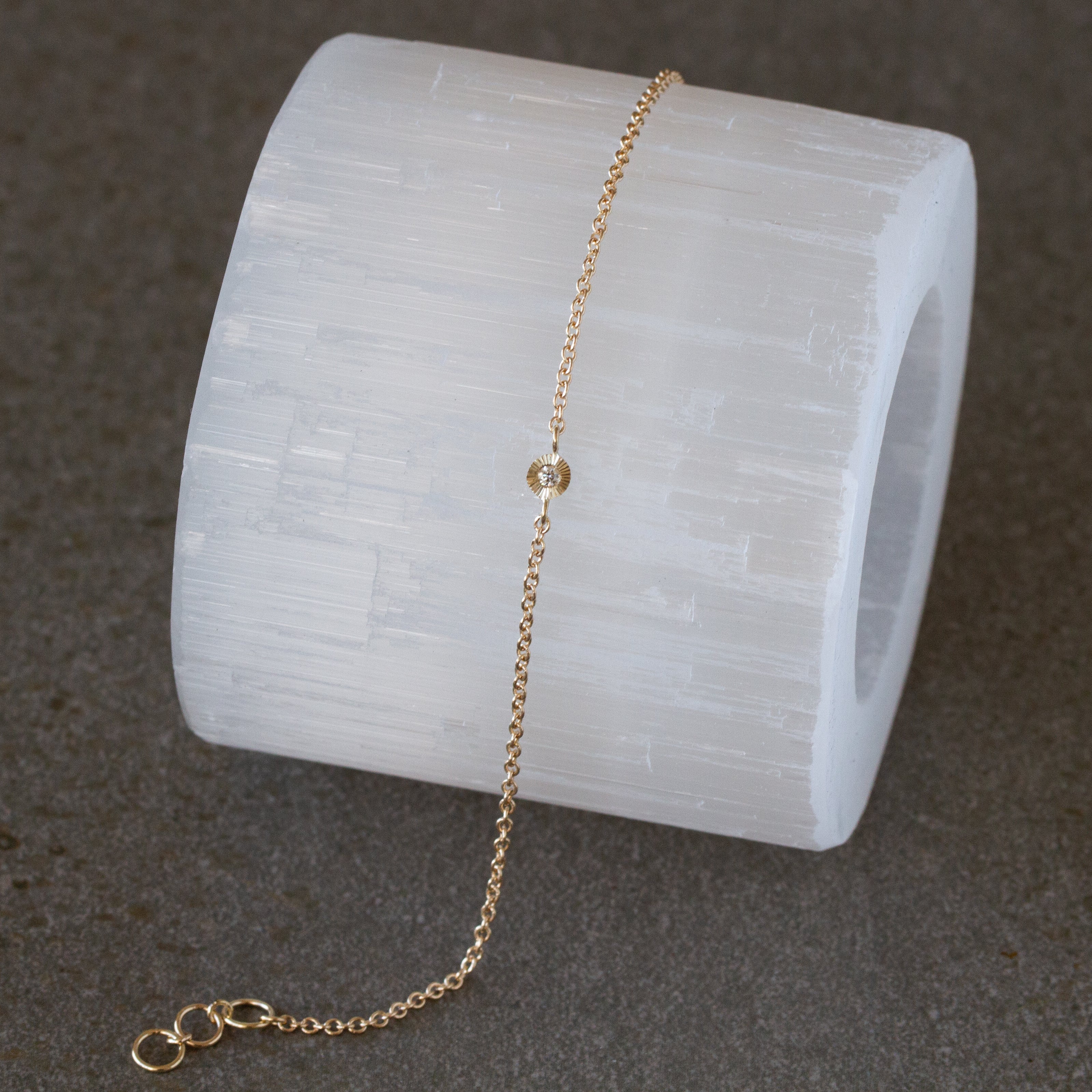 Add a little delicate sparkle to your wrist. This chain bracelet features an aurora charm in the center with a white diamond center that's encircled by a border of engraved lines. This bracelet attaches with a secure lobster clasp or can be converted to a permanent bracelet.