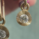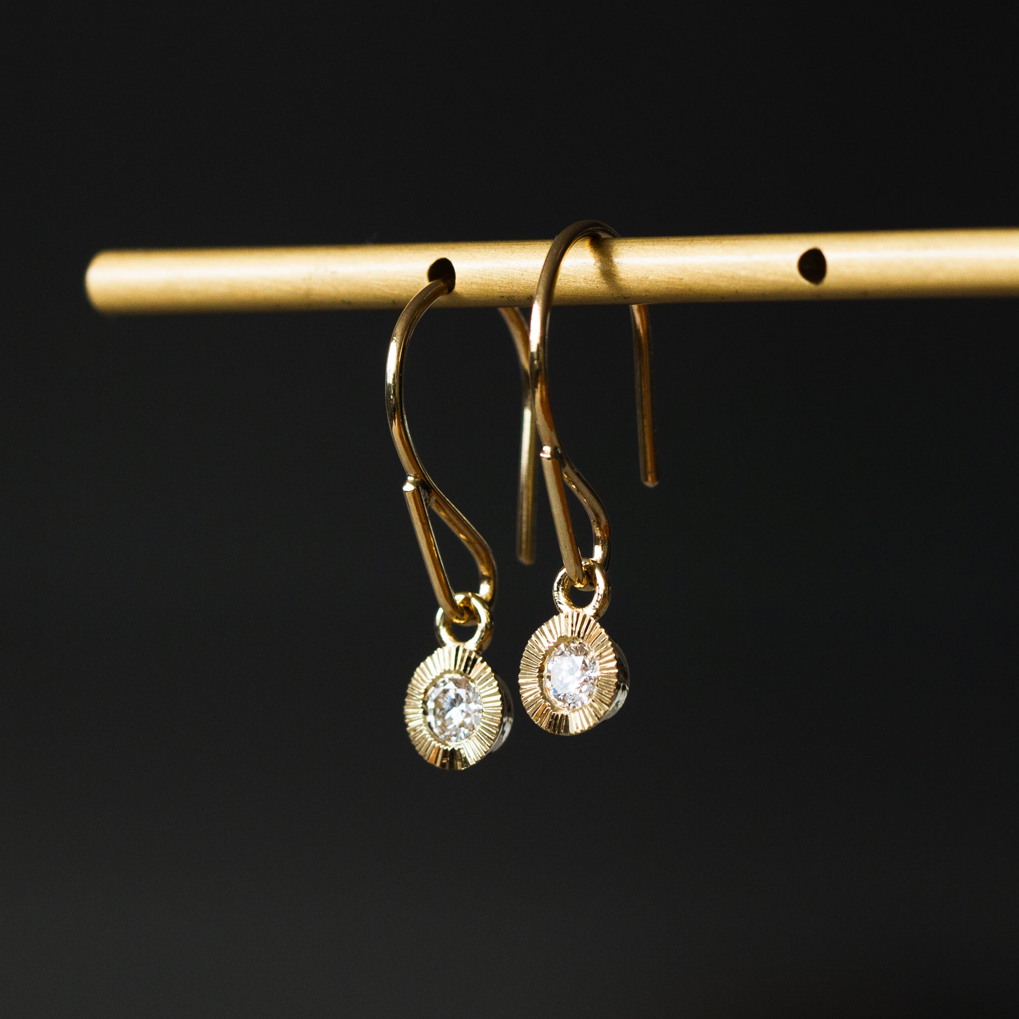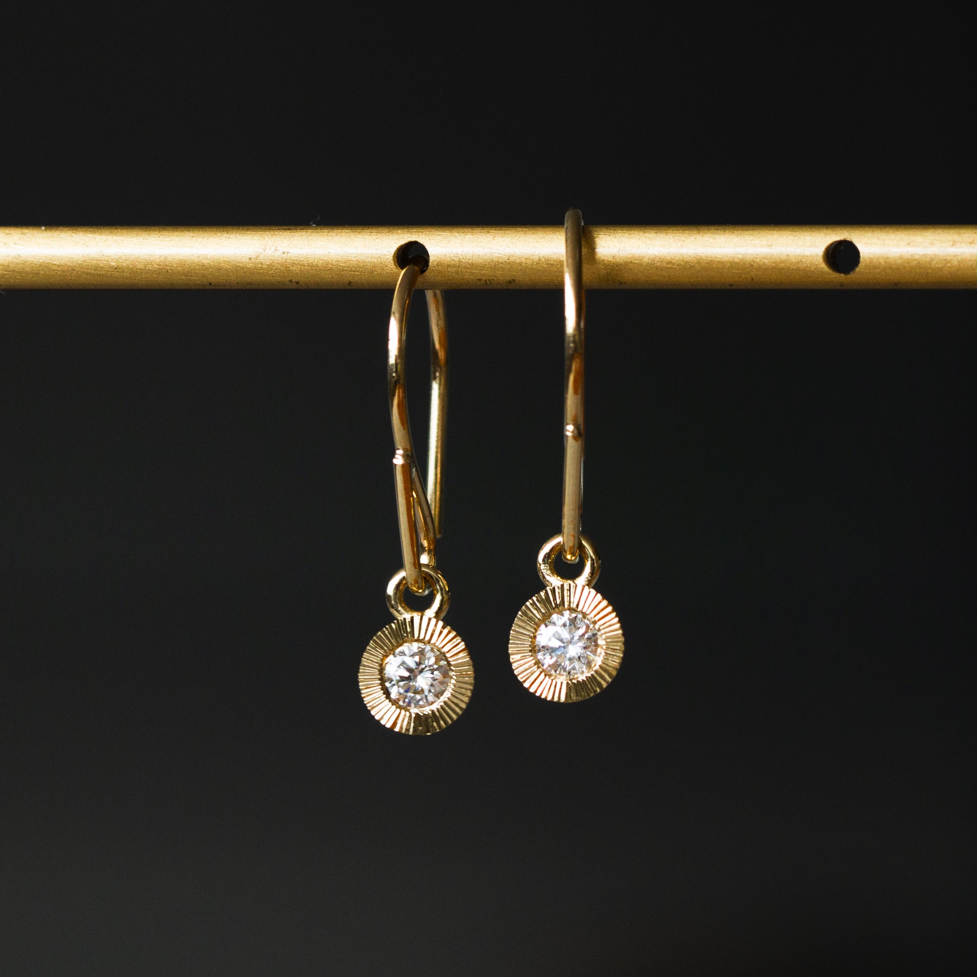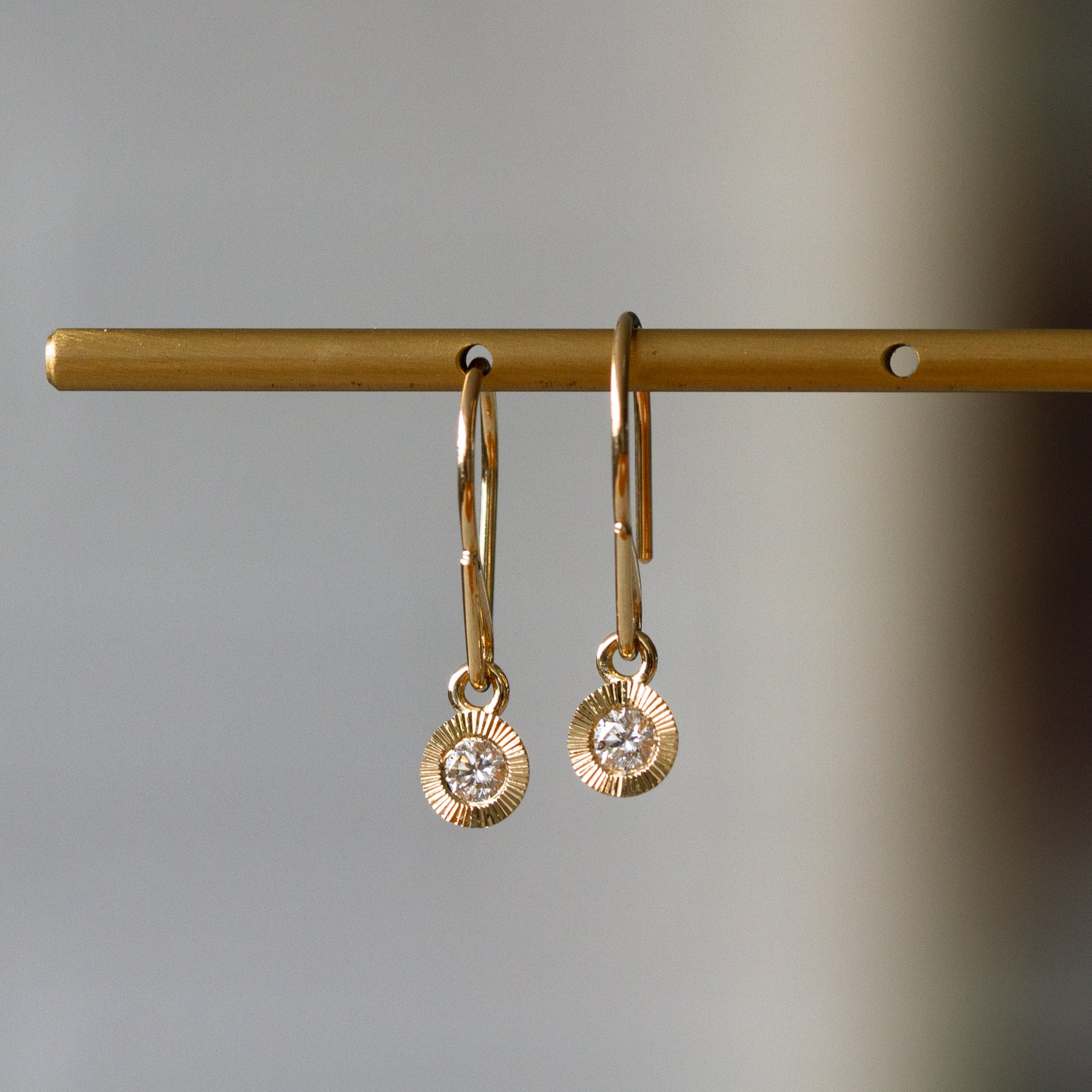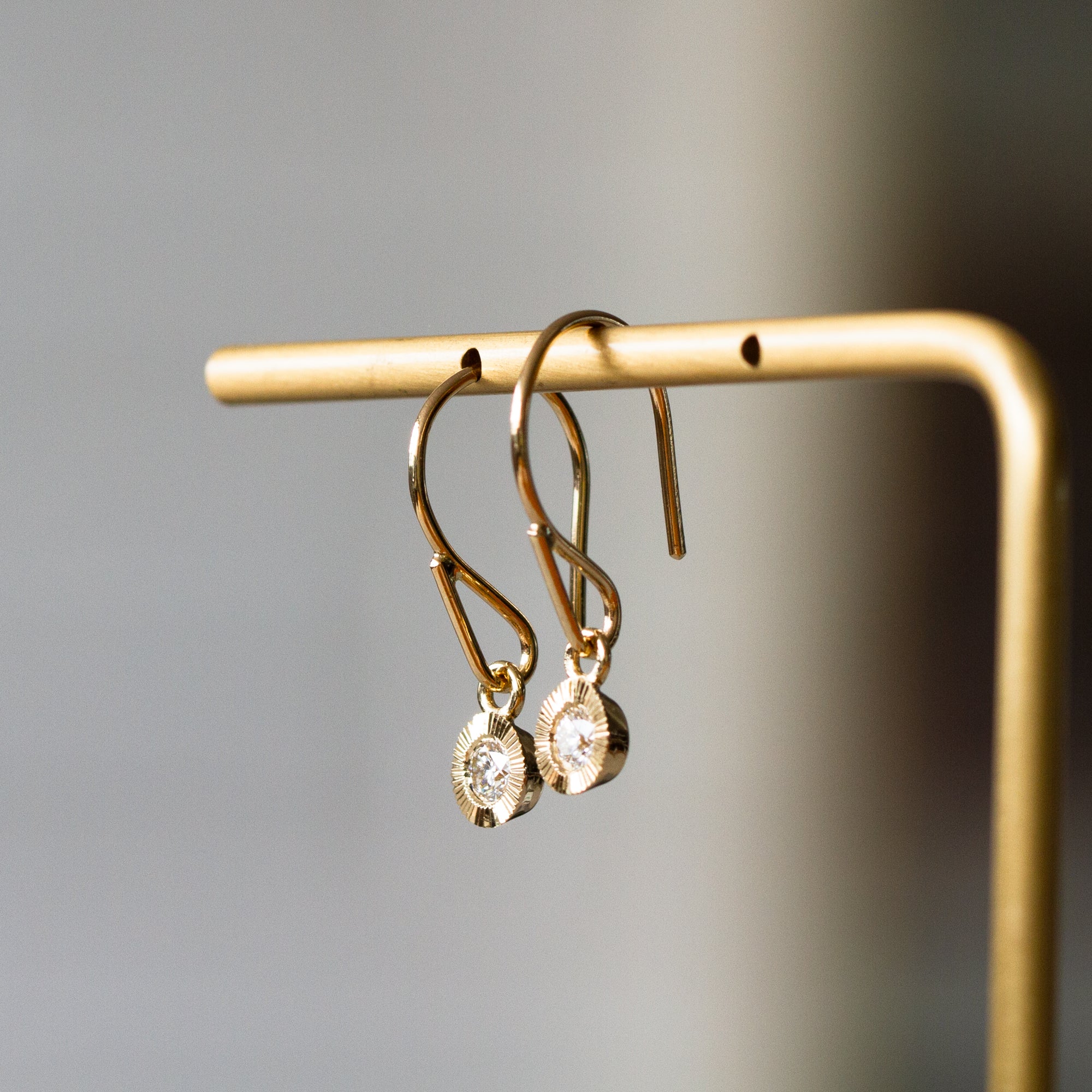 Our signature Aurora design takes flight in these elegant dangle earrings. Sparkling diamonds are surrounded by an impressive sunburst, with hand-engraved rays that create a bold radial pattern. Set on graceful ear wires, these earrings dance with every movement, catching and reflecting light from all angles.