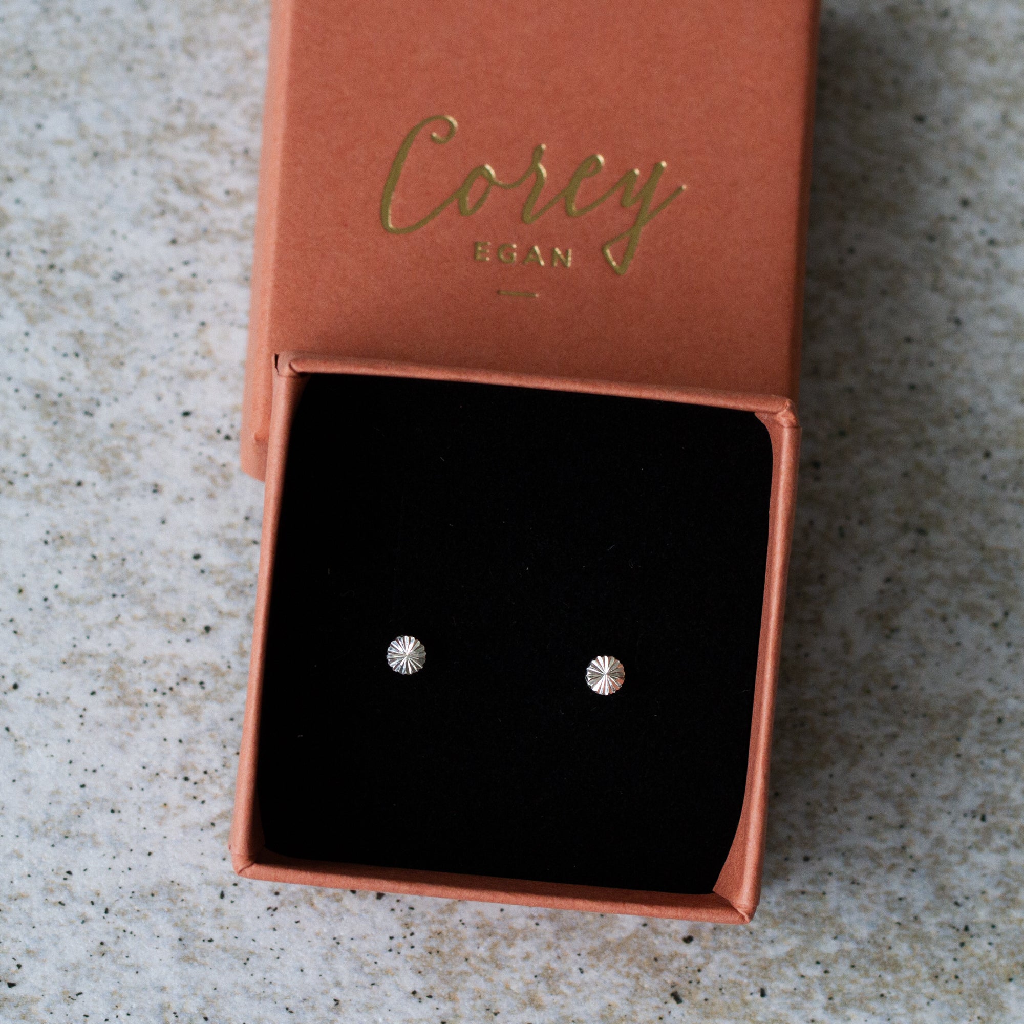 Adorn your earlobes with the delicate Rise studs that shimmer with a tiny sunburst circle. Each stud is meticulously hand-engraved and crafted to reflect light as you move, creating a subtle yet eye-catching effect. Wear these studs to spread joy and positivity, radiating a happy glow wherever you go.