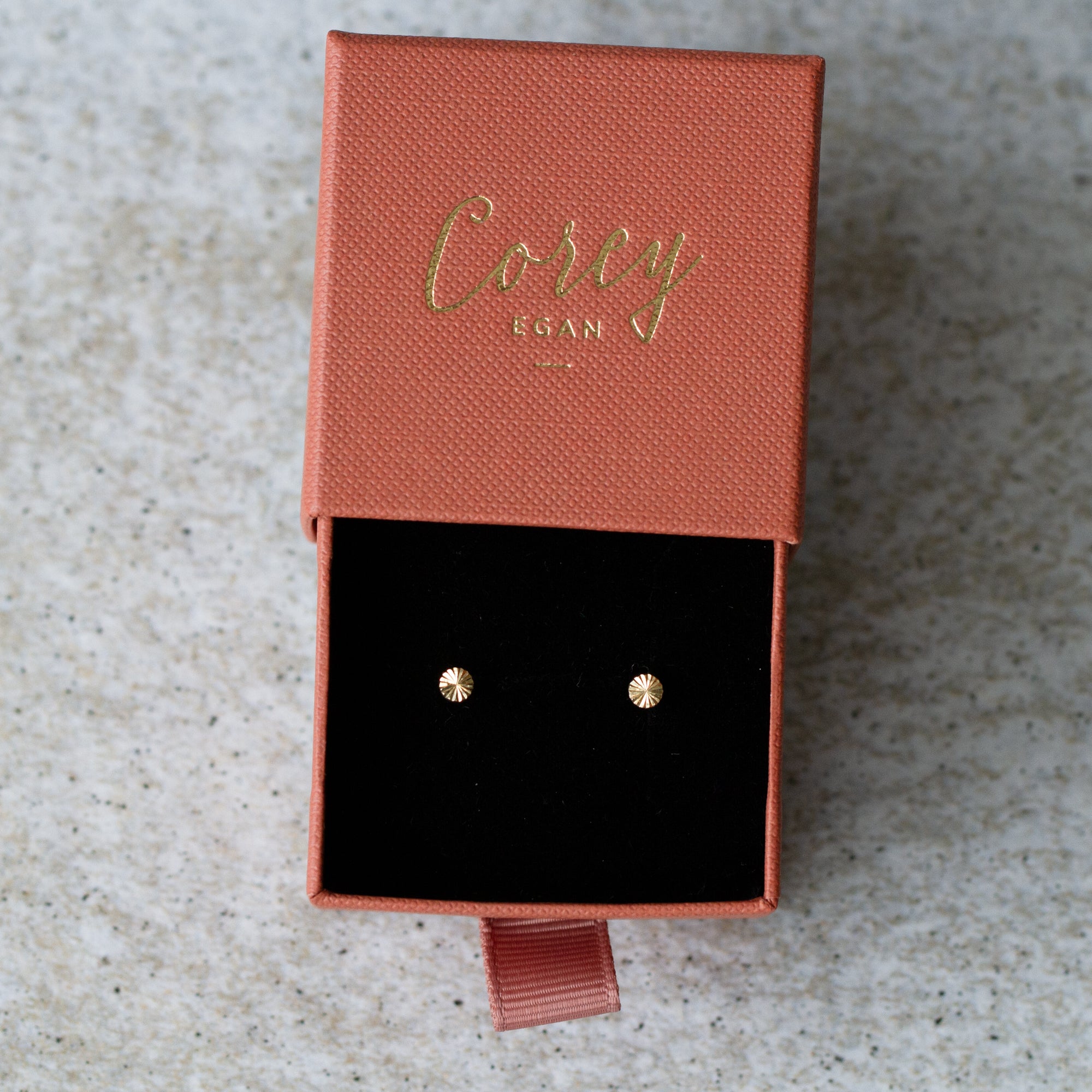 Adorn your earlobes with the delicate Rise studs that shimmer with a tiny sunburst circle. Each stud is meticulously hand-engraved and crafted to reflect light as you move, creating a subtle yet eye-catching effect. Wear these studs to spread joy and positivity, radiating a happy glow wherever you go.