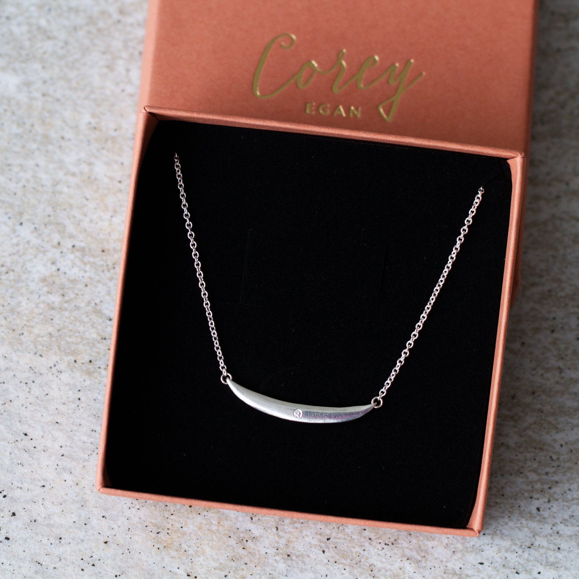 Capturing the fluid sweep of water flowing around smooth stones, the hand-carved Current Necklace moves gracefully across your neckline. Its gentle arc echoes the natural path of flowing creeks, while a single recycled diamond marks the center like a point of light reflecting off moving water. The sleek silhouette feels modern yet timeless, making it perfect for layering with other necklaces or wearing solo for understated elegance. From boardroom meetings to weekend escapes, this refined pendant is perfect for someone who is always on the move.