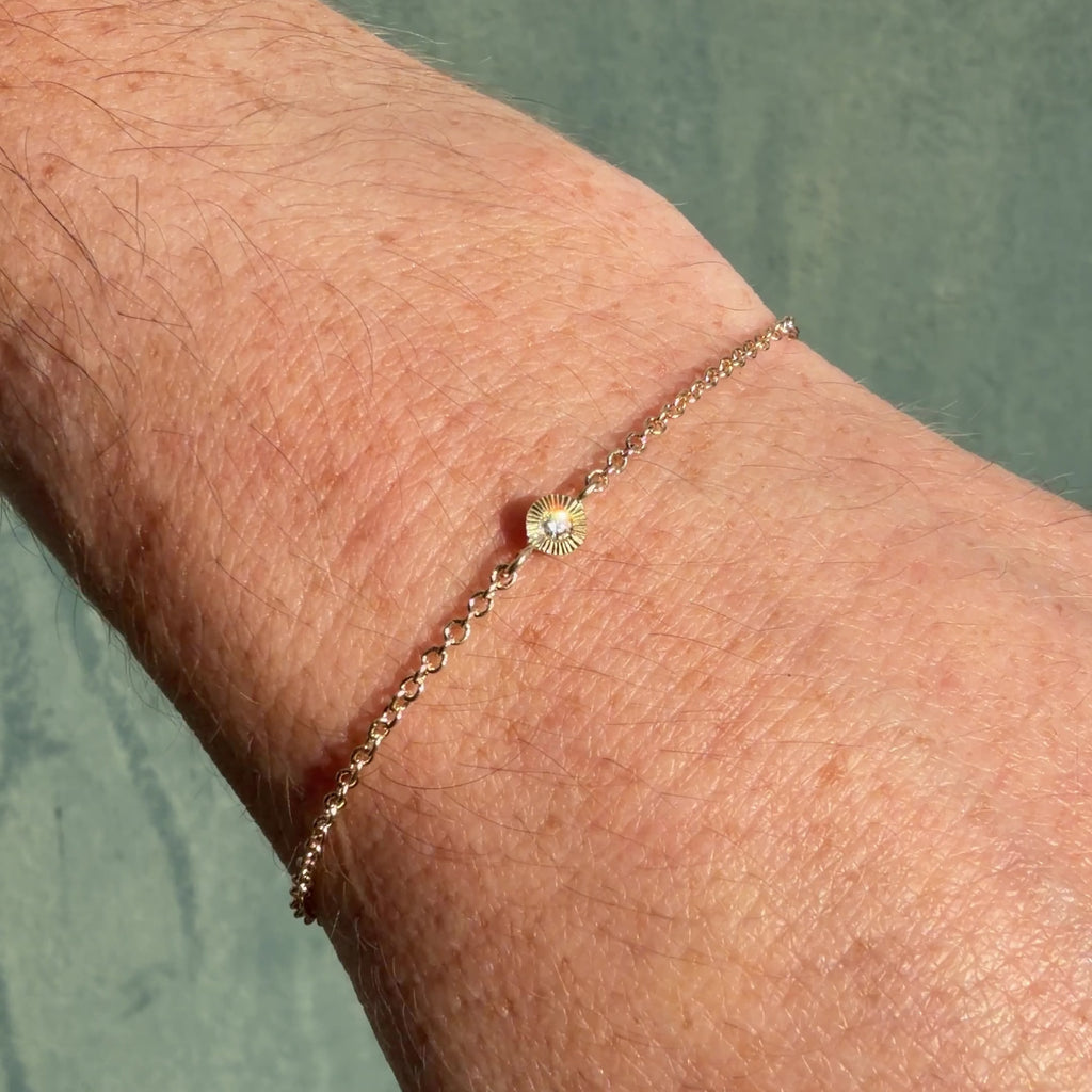 Add a little delicate sparkle to your wrist. This chain bracelet features an aurora charm in the center with a white diamond center that's encircled by a border of engraved lines. This bracelet attaches with a secure lobster clasp or can be converted to a permanent bracelet.