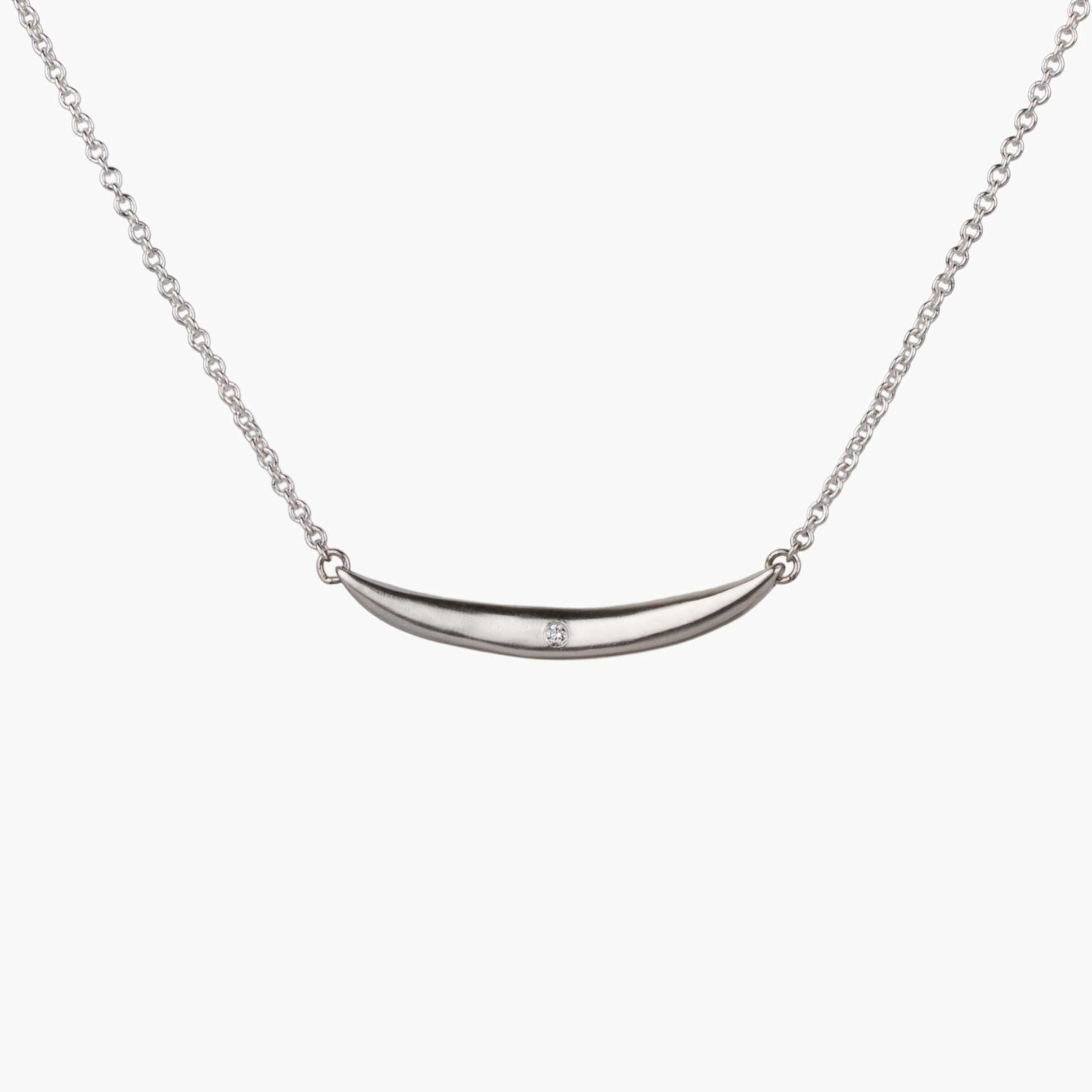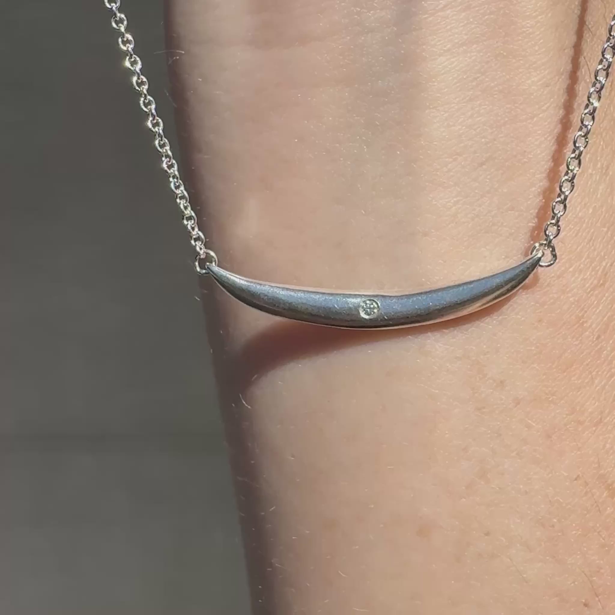 Capturing the fluid sweep of water flowing around smooth stones, the hand-carved Current Necklace moves gracefully across your neckline. Its gentle arc echoes the natural path of flowing creeks, while a single recycled diamond marks the center like a point of light reflecting off moving water. The sleek silhouette feels modern yet timeless, making it perfect for layering with other necklaces or wearing solo for understated elegance. From boardroom meetings to weekend escapes, this refined pendant is perfect for someone who is always on the move.