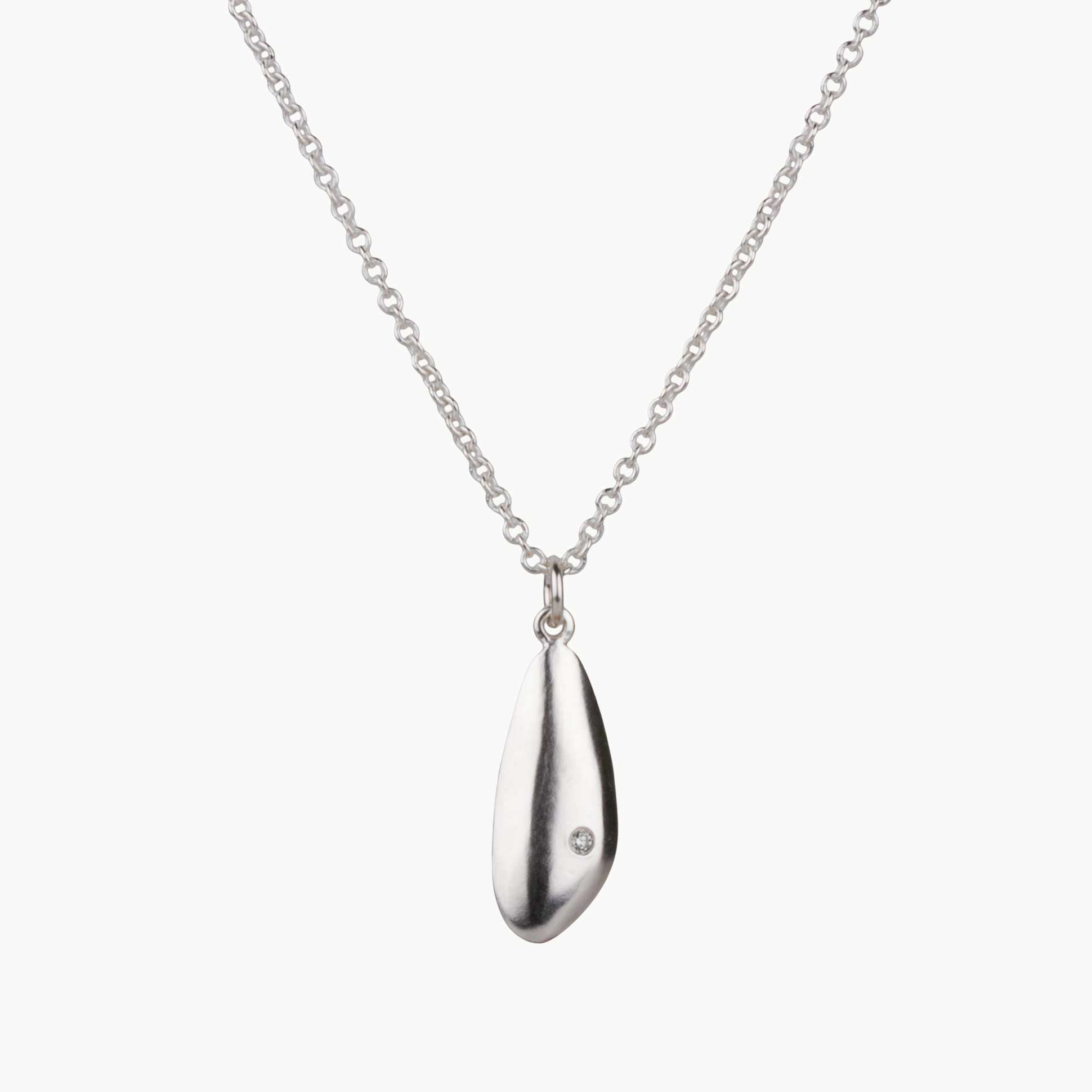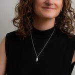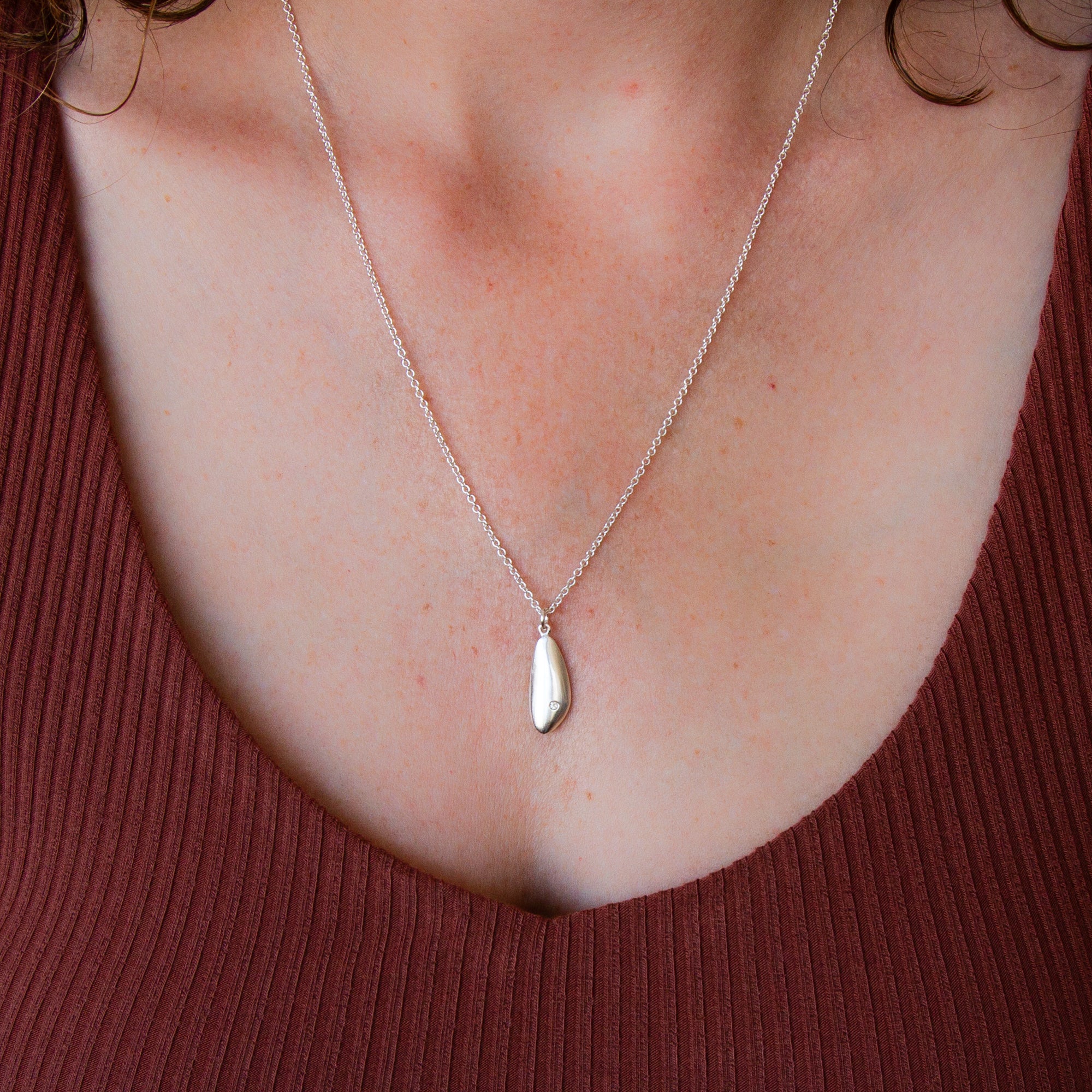 The hand-carved Medium Pebble Necklace captures the beauty of a river stone smoothed by countless seasons of flowing water. A single recycled diamond adds gentle sparkle. The classic cable chain with adjustable length options creates striking impact whether worn alone or layered with delicate pieces. From lunch dates to evening events, this timeless pendant brings nature's quiet sophistication to looks that call for something with a bit more impact.