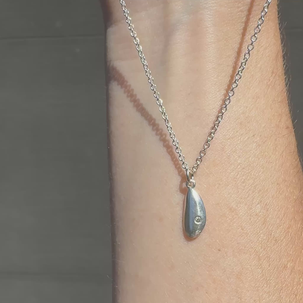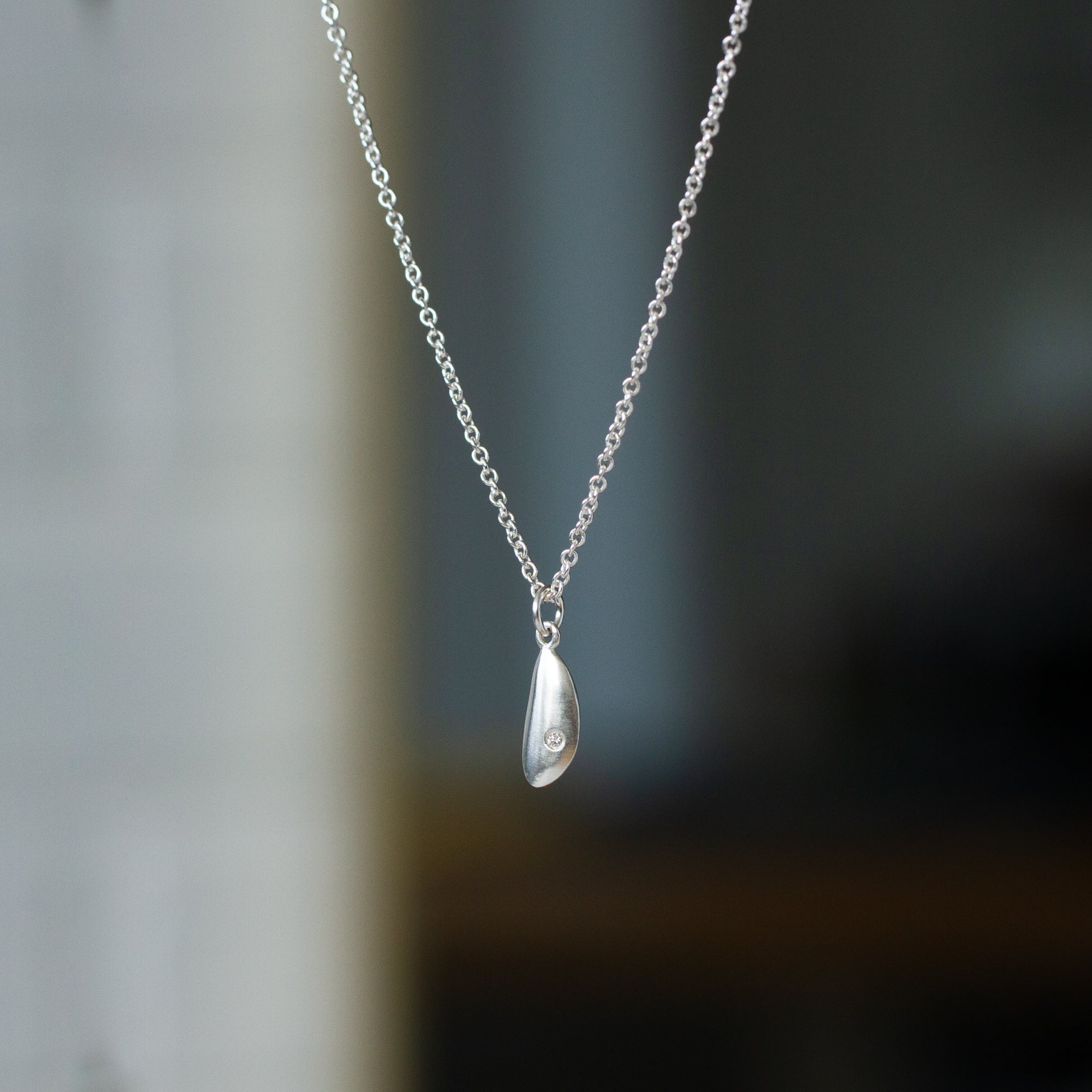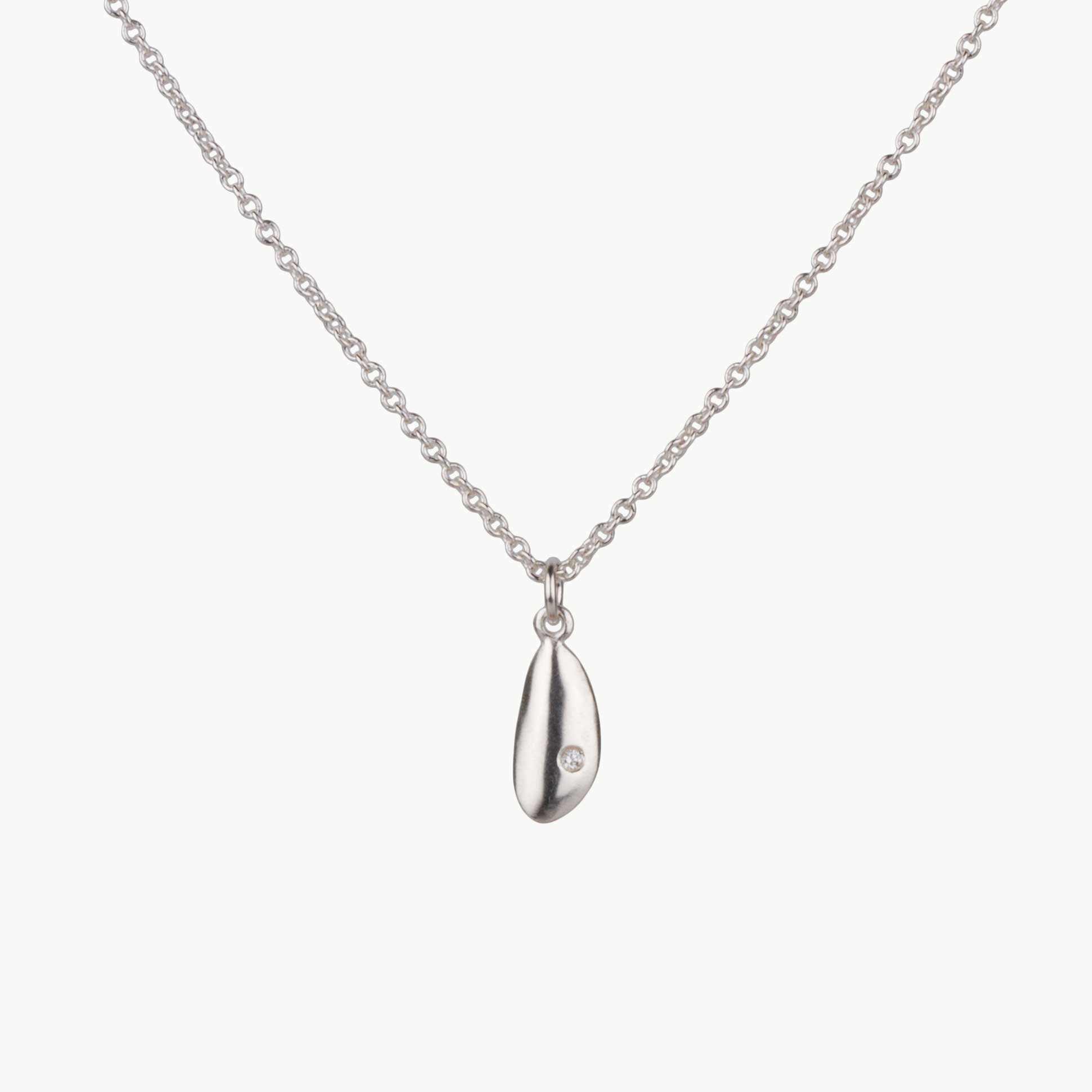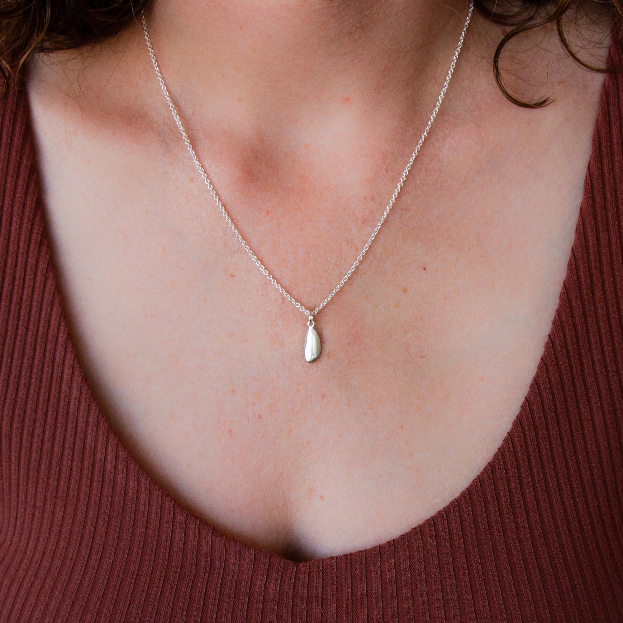 An everyday essential you'll reach for again and again, the hand-carved Pebble Necklace features the perfect organic shape that mirrors a stone polished smooth by flowing water. A single recycled diamond adds just the right touch of sparkle, while the classic cable chain with adjustable length options allows it to layer beautifully with other pieces or stand alone as a quiet statement. Choose between 16 or 18 inches to find your perfect fit. From morning meetings to evening plans, this timeless pendant brings the serene beauty of nature's artistry to your daily style.