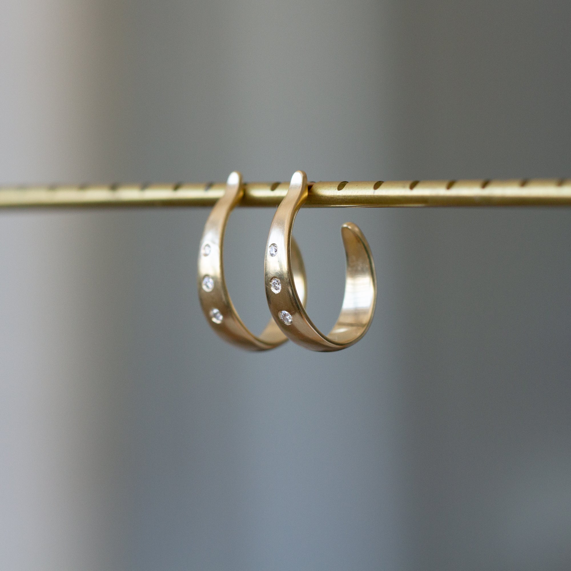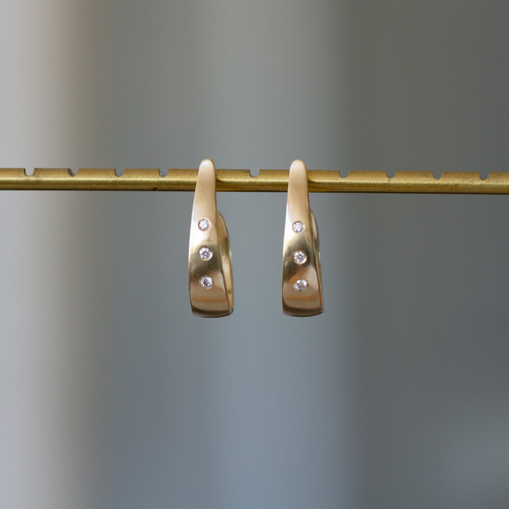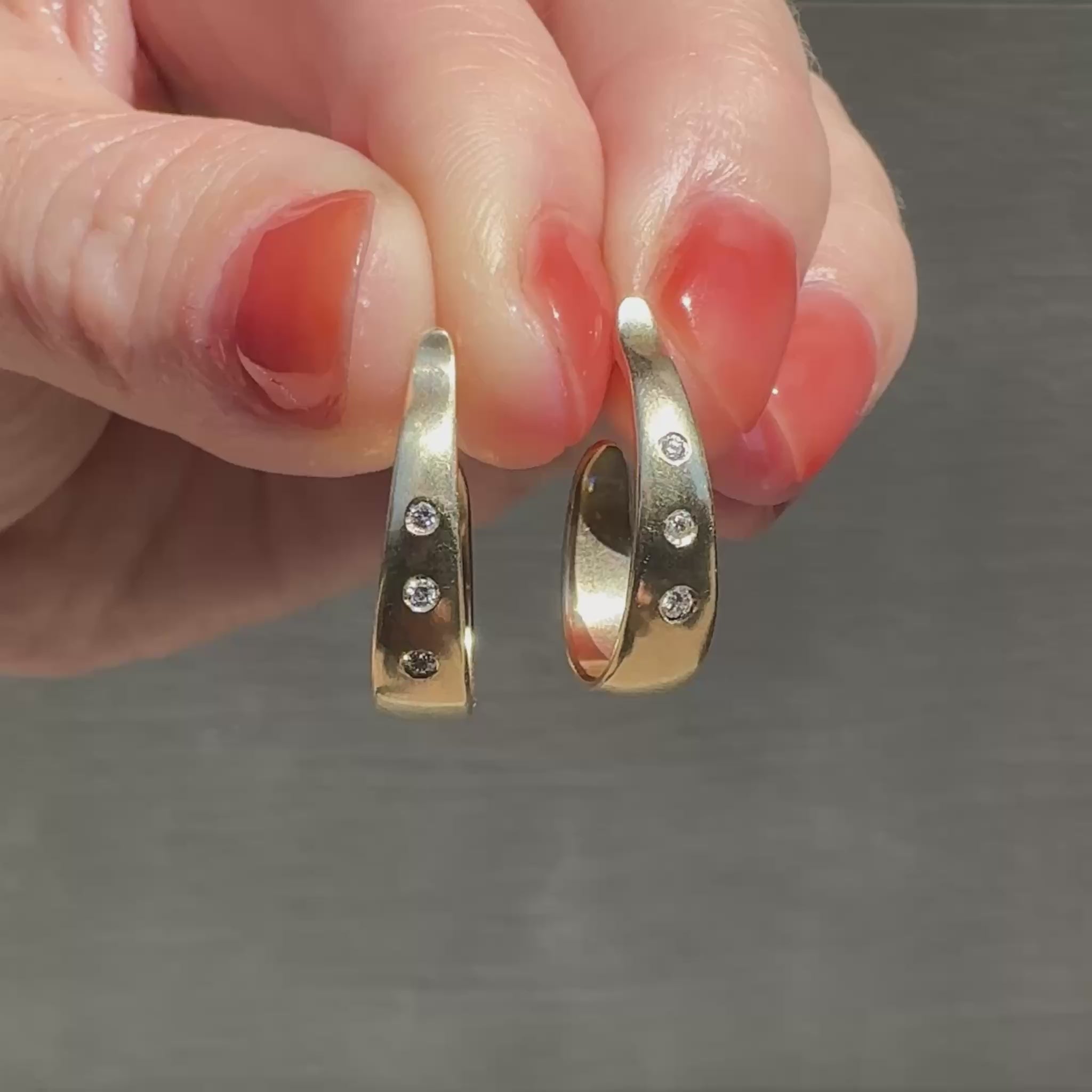 These hand-carved 14k gold Plunge Hoops embrace the sleek elegance of water cascading down a waterfall. The oblong, tapered silhouette creates a sophisticated alternative to traditional round hoops, while three Canadian diamonds on each hoop sparkle like droplets caught in golden sunlight. The graduated stones flow from smaller to larger, mimicking the natural rhythm of falling water. Their streamlined shape sits close to your ear, making them perfect for everyday luxury without the weight or bulk of larger hoops. The secure post and friction back closure ensures they stay put through busy days and celebratory evenings. These refined hoops bring luminous beauty to your most treasured jewelry pieces.