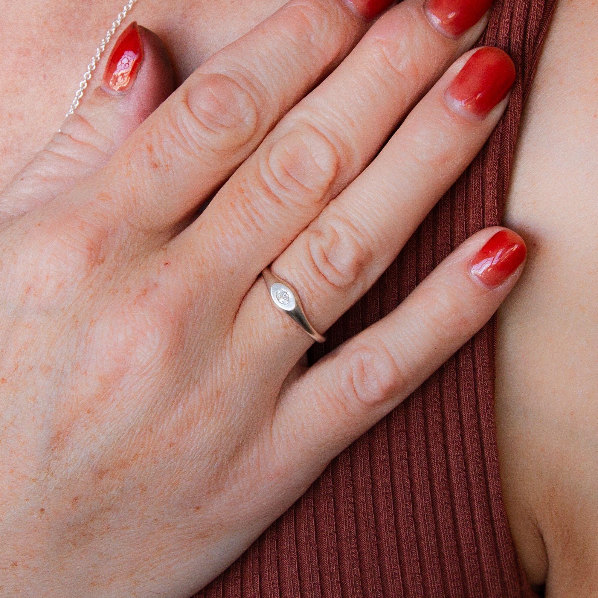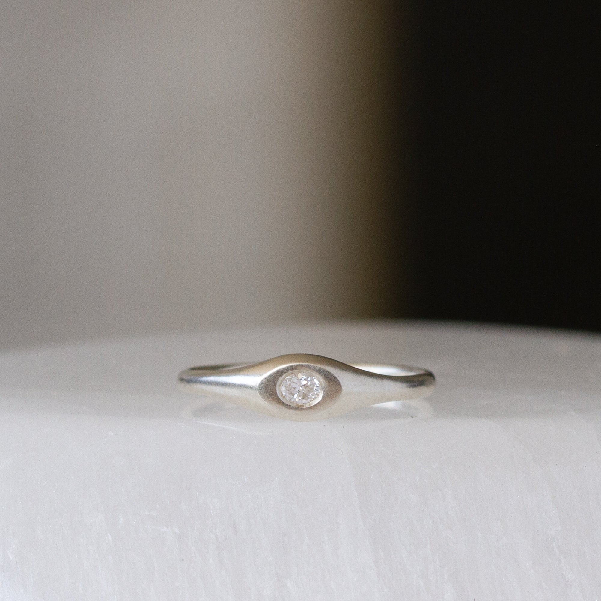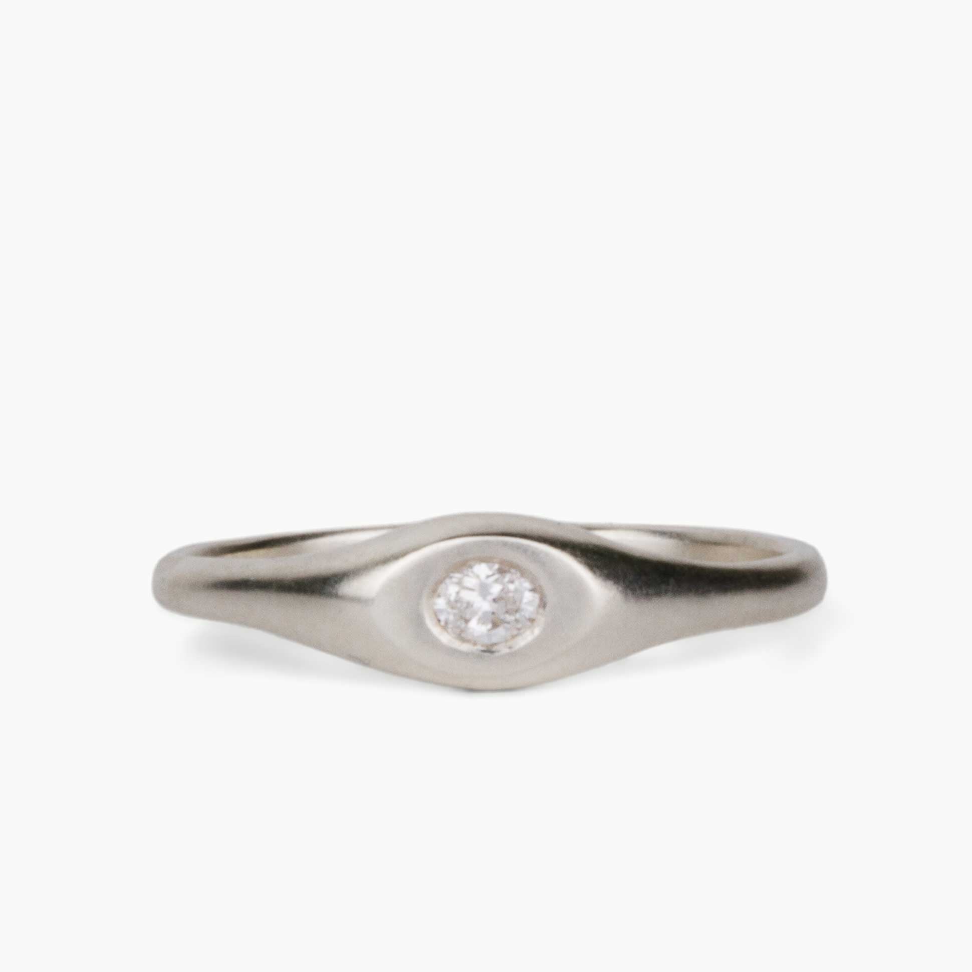 This darling Pebble Signet is our take on a classic, comfortable signet style with all smooth edges you'll savor on an everyday ring. The oval face mirrors the shape of a perfect river stone, centered with a flush-set lab-grown diamond that sparkles like a dewdrop on water-polished granite. The gentle matte texture feels wonderful against your skin, and its versatile size works beautifully on any finger—it's an excellent choice for a pinky signet. The soft curves and organic form are perfect for daily wear, creating understated elegance wherever you choose to wear it.