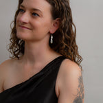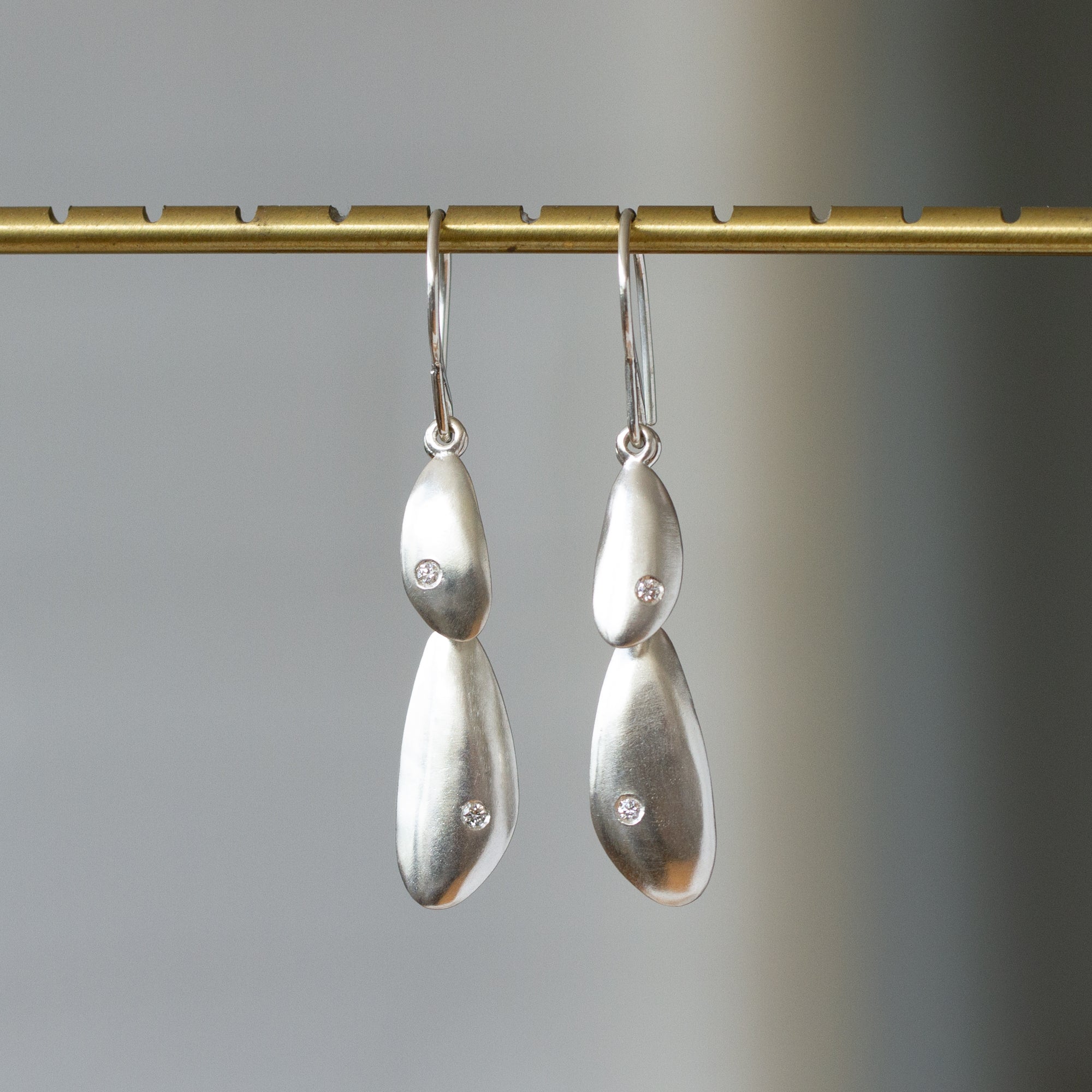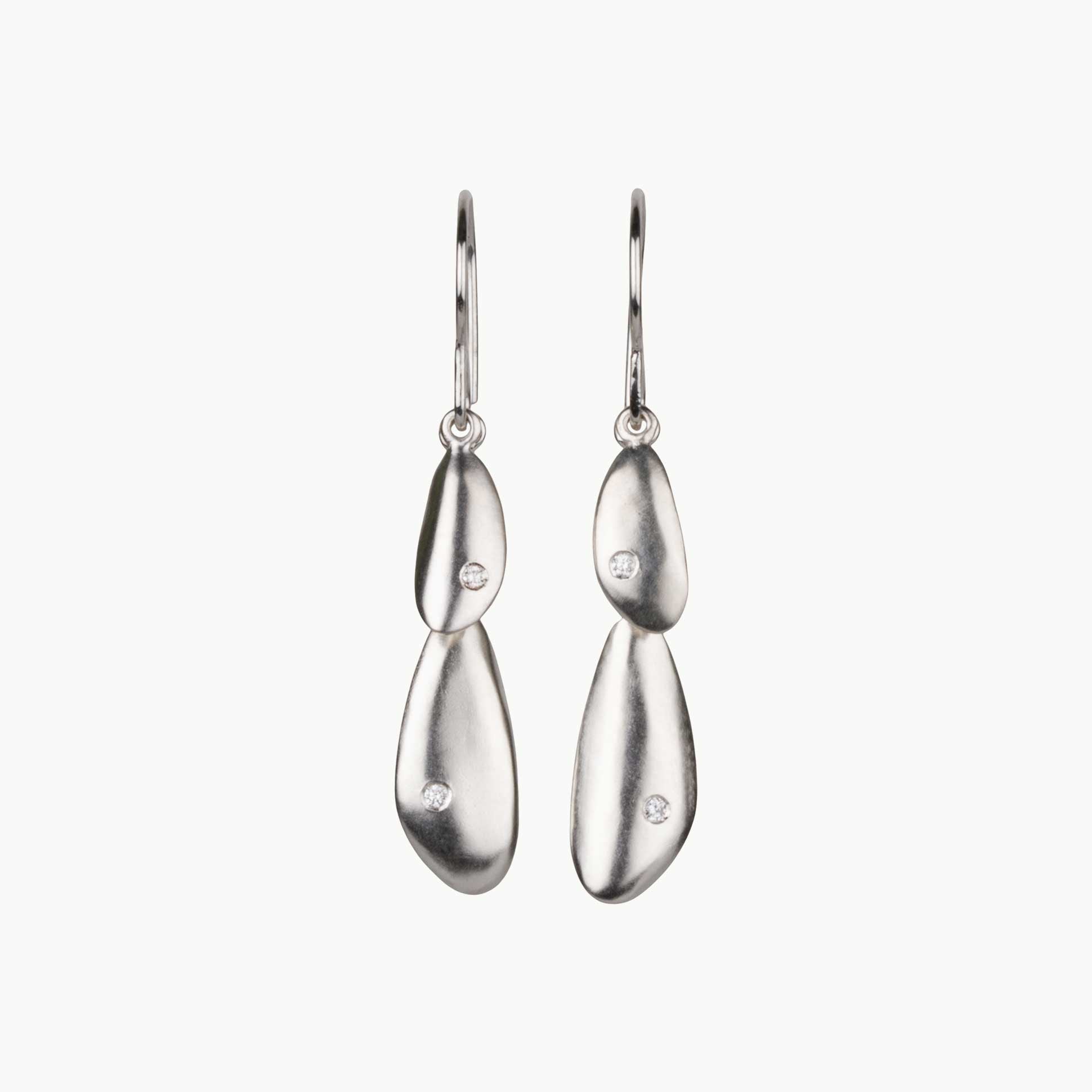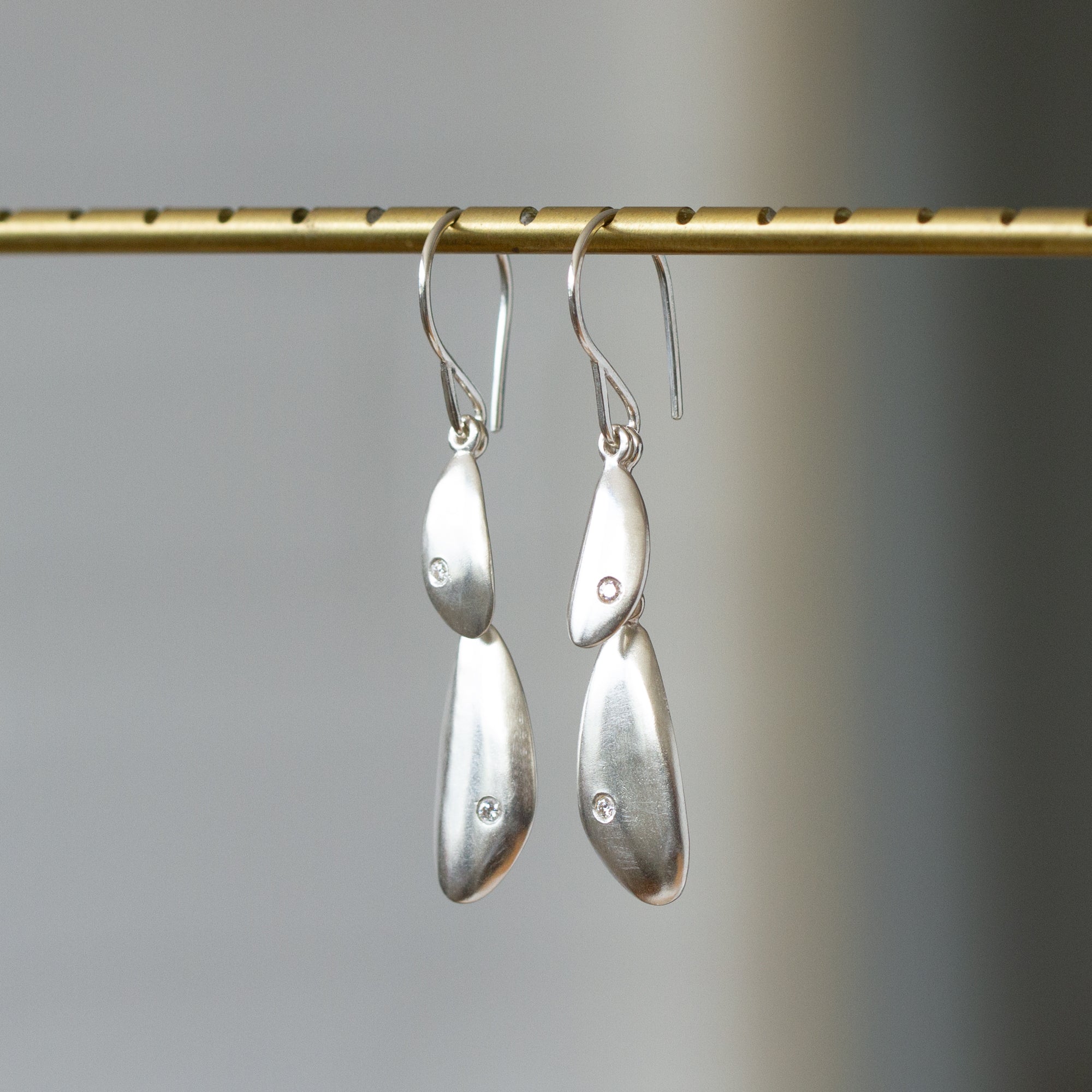 These hand-carved Stacked Pebble earrings dance with every movement, layering our signature river stone forms in a playful cascade. Two organic pebbles overlap gracefully, each dotted with a flush-set recycled diamond that catches the light at different angles as you move. Their fluid motion mimics the way stones tumble in flowing water, creating an ever-changing display of sparkle and shadow. Perfect for adding gentle movement to your look at gallery openings or dinner with friends. The overlapping forms create visual depth while maintaining the tactile quality that makes you want to reach out and touch them.