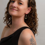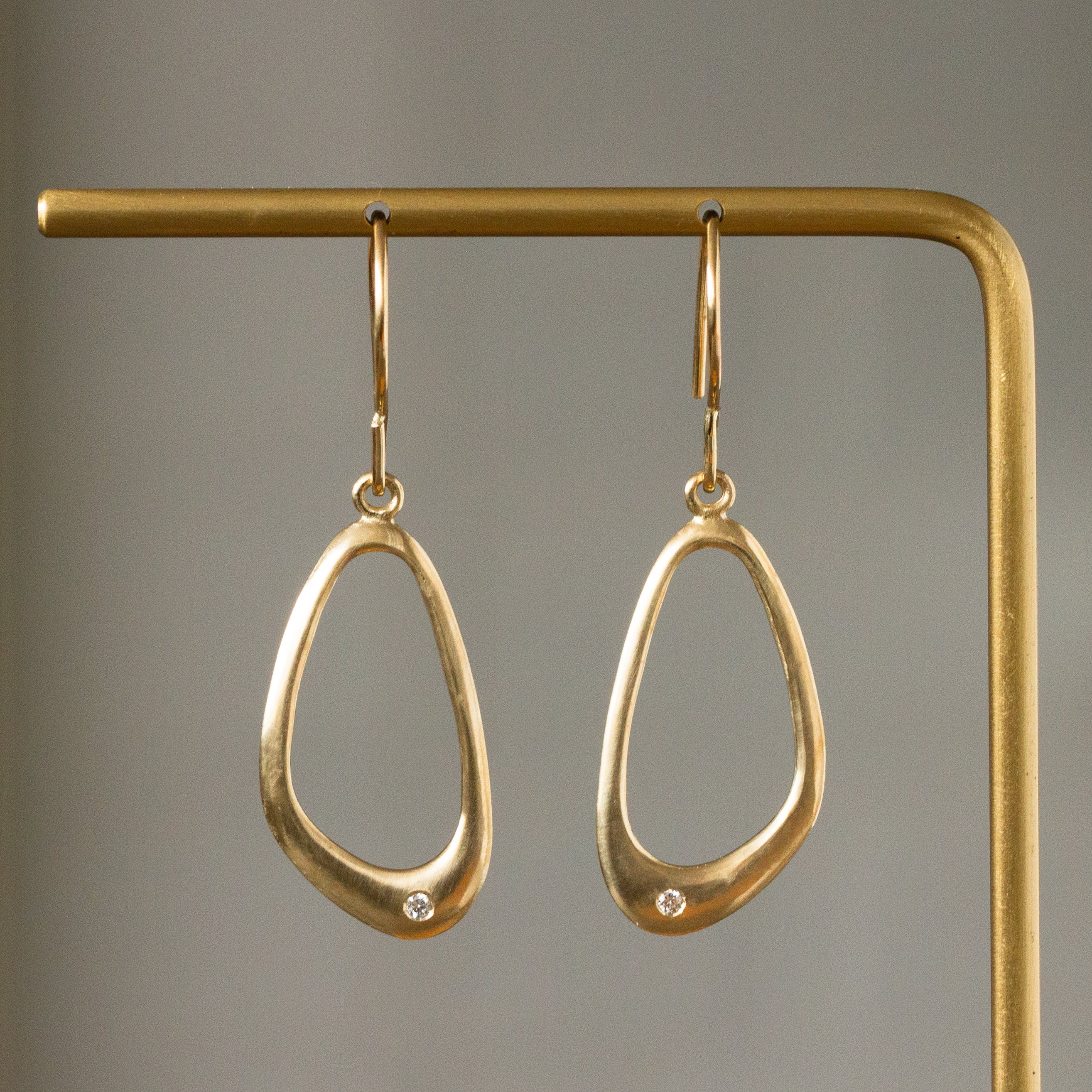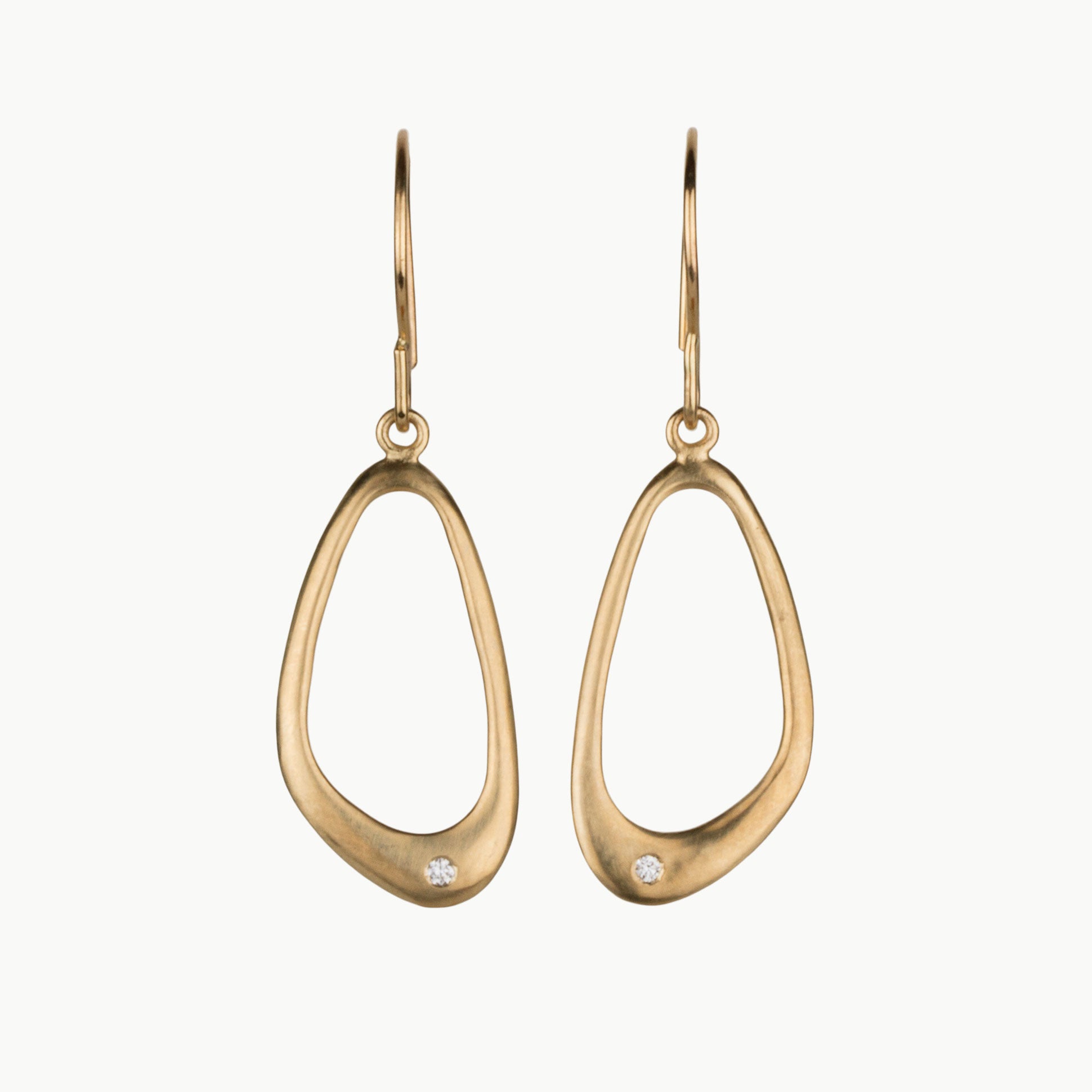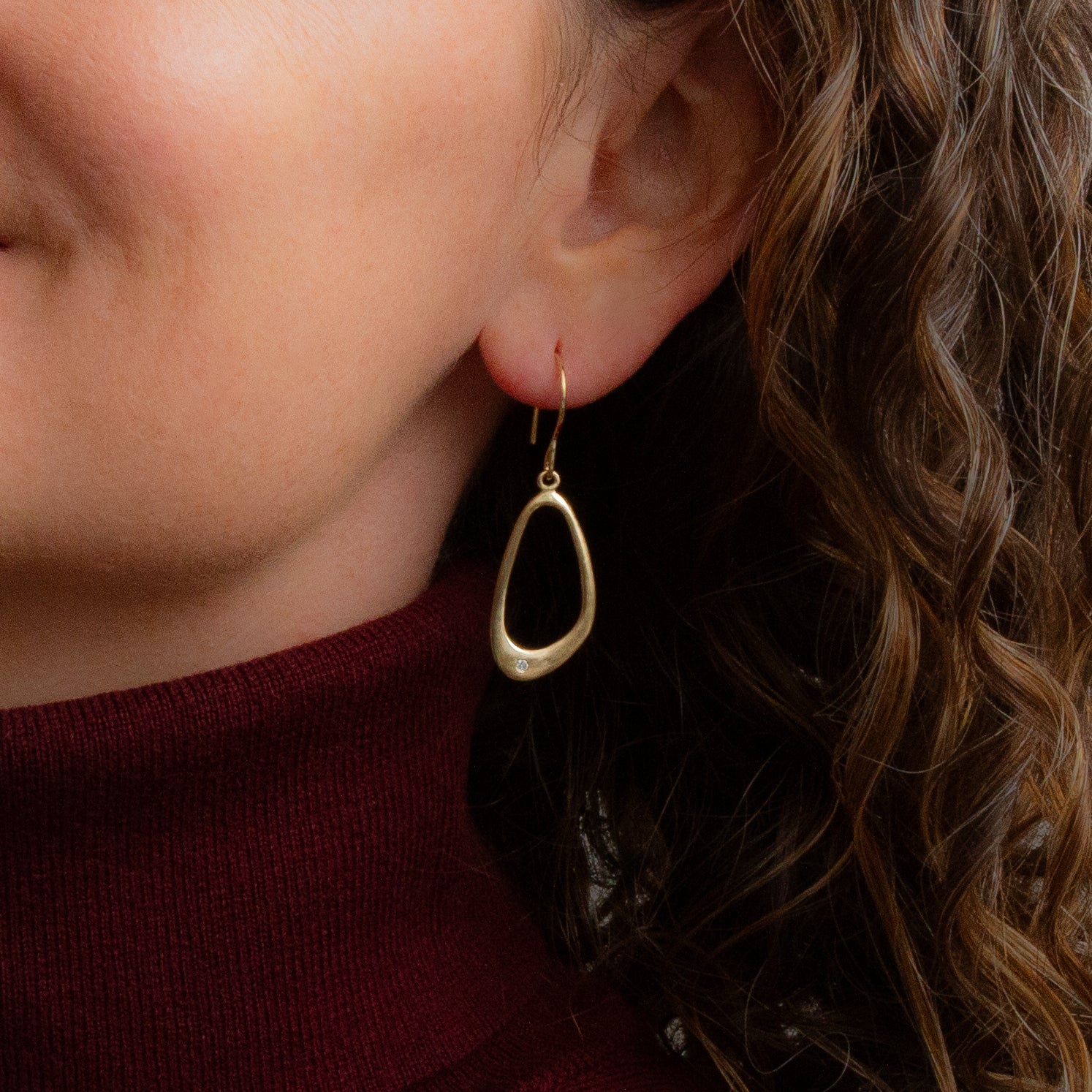 These hand-carved Wake earrings capture the ripple left when a stone skips across still water. Each open, amorphous form moves gently as you walk, mimicking the ripples that spread outward from a single point of contact. A recycled diamond sits like a dewdrop within the curved silhouette, catching light at unexpected angles. The hollow design feels surprisingly light against your ear while creating beautiful negative space that draws the eye. From gallery walks to garden parties, these sculptural earrings bring the poetry of water in motion to your most thoughtful looks.