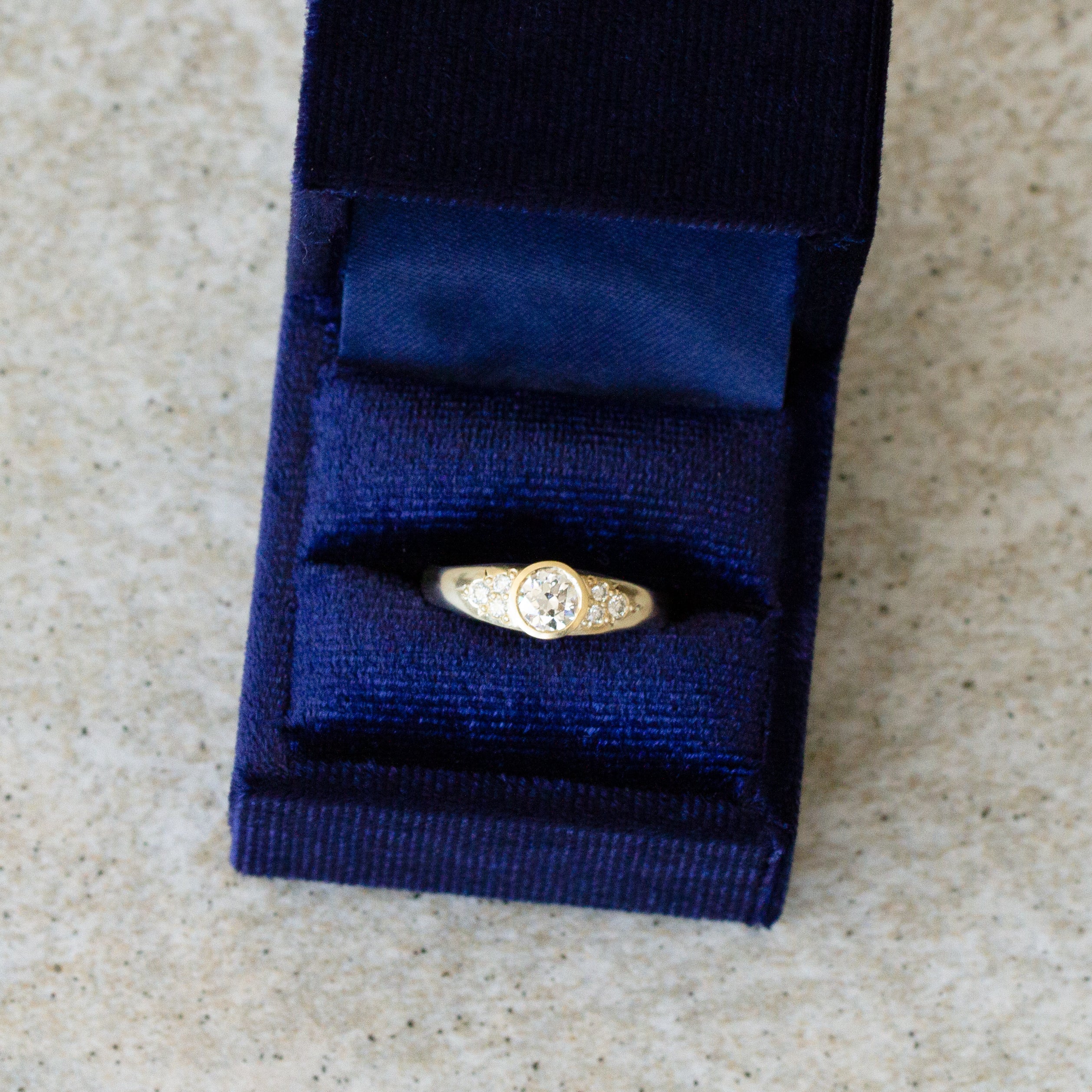 Each stone is carefully bezel-set for everyday durability, while the thoughtful hidden shelf design allows your future wedding band to stack flush against it. It's old-world romance meets contemporary craftsmanship, perfect for someone who appreciates the story that antique stones whisper through their facets.