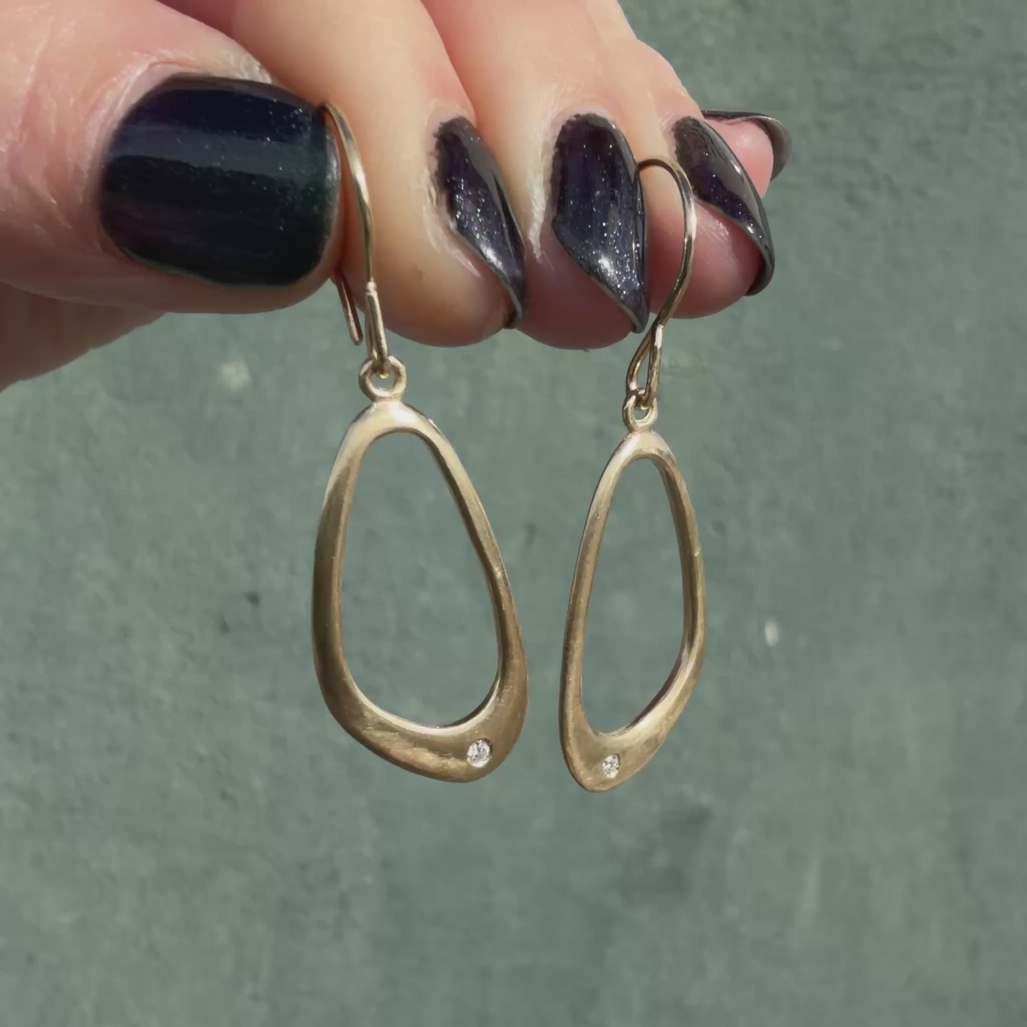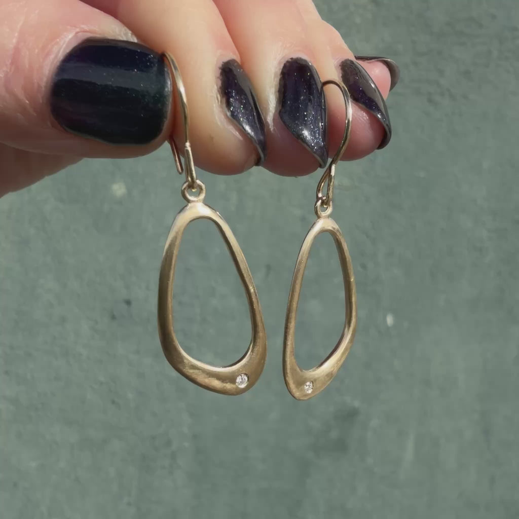 These hand-carved Wake earrings capture the ripple left when a stone skips across still water. Each open, amorphous form moves gently as you walk, mimicking the ripples that spread outward from a single point of contact. A recycled diamond sits like a dewdrop within the curved silhouette, catching light at unexpected angles. The hollow design feels surprisingly light against your ear while creating beautiful negative space that draws the eye. From gallery walks to garden parties, these sculptural earrings bring the poetry of water in motion to your most thoughtful looks.