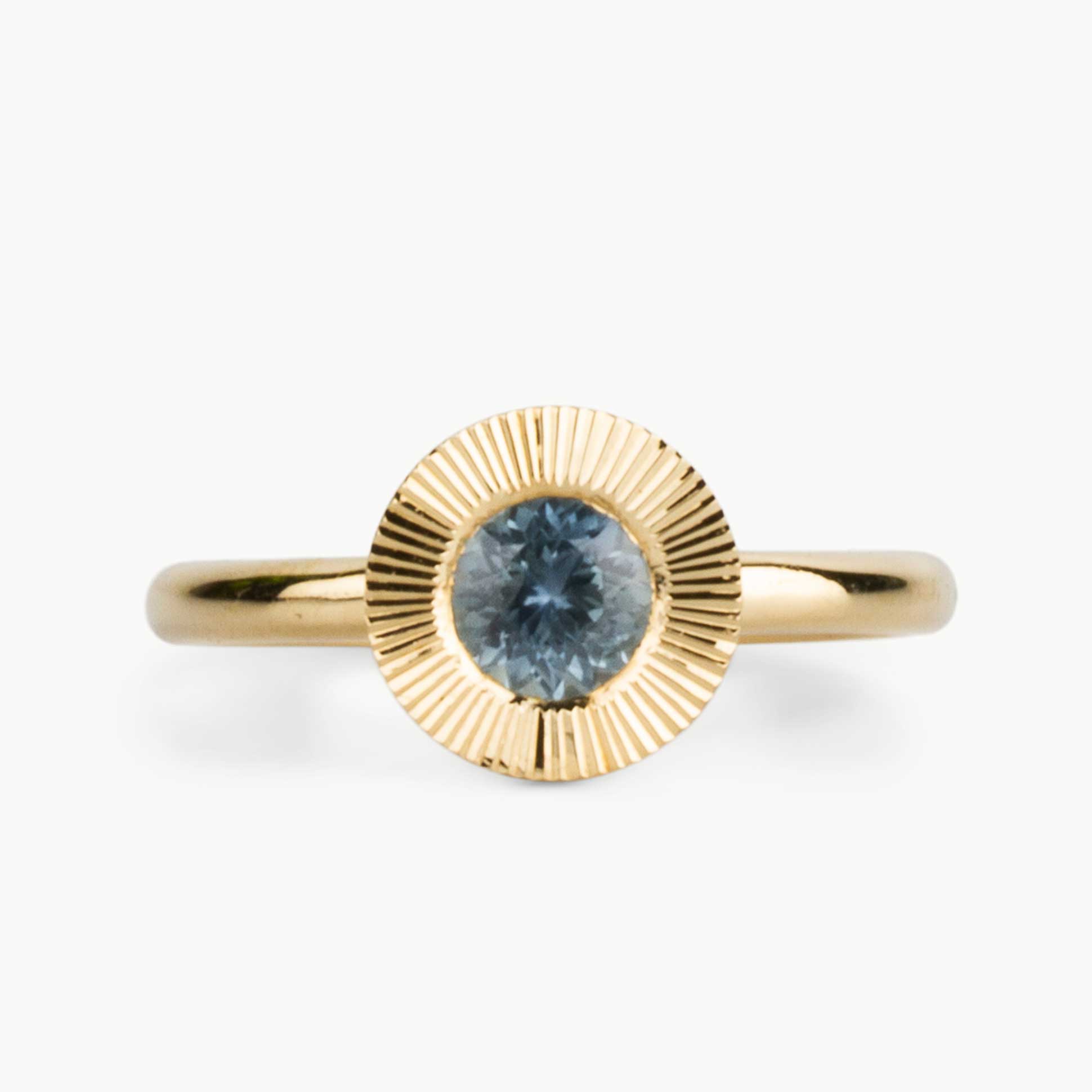Our signature Aurora design showcases a captivating .62ct Montana sapphire, nestled within hand-engraved rays that shimmer like sunbeams. The artful radial pattern in warm 14k gold creates an elegant frame for this round gem, while the elevated setting allows light to dance through the stone from all angles.