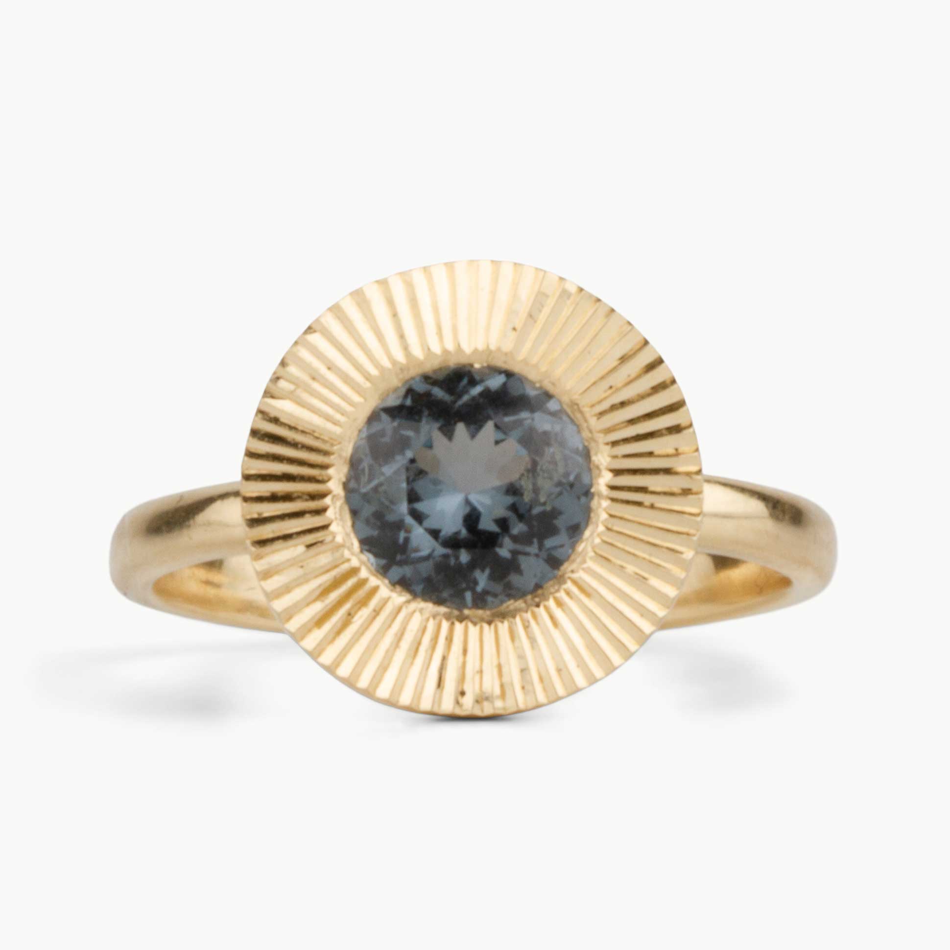 Our signature Aurora design showcases a mesmerizing 1.24ct Mozambique spinel in an enchanting blue-purple hue, nestled within hand-engraved rays that shimmer like sunbeams. The artful radial pattern in warm 14k gold creates a striking contrast with the moody center stone, while the elevated setting allows light to dance through the gem from all angles.