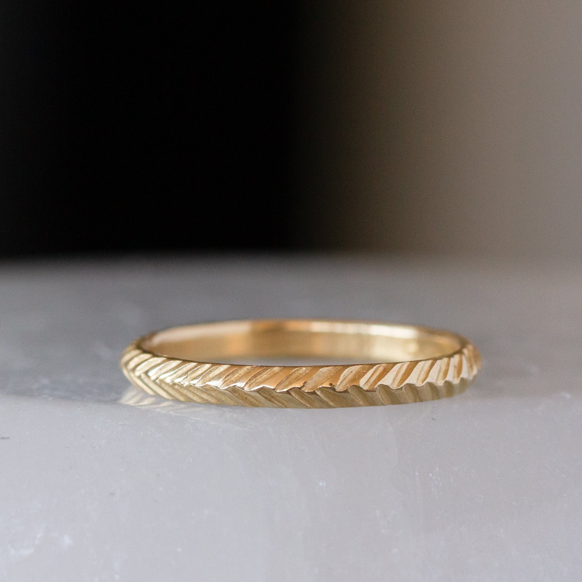 The Herringbone Stacking Band features a hand-carved pattern that creates both visual and tactile texture across its surface. At 2mm wide with a peaked profile, this ring adds architectural interest to any stack while remaining delicate enough for everyday wear.