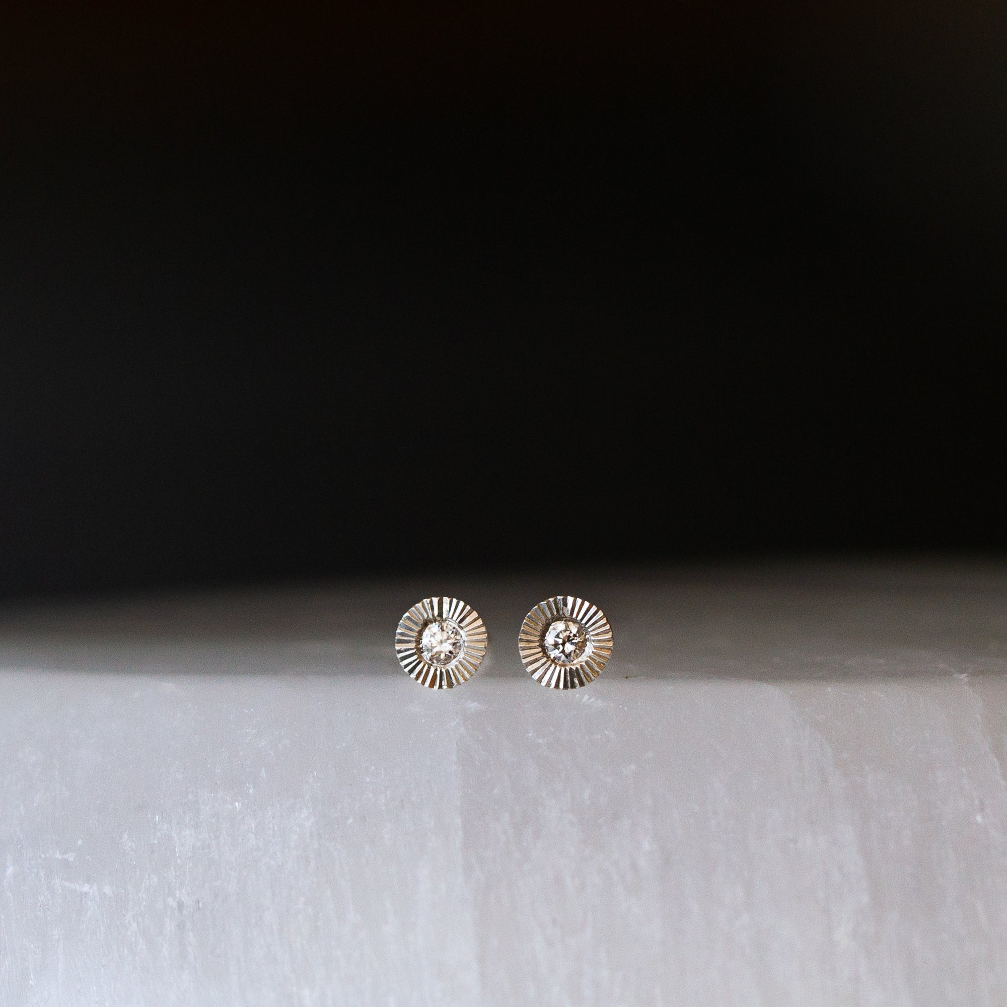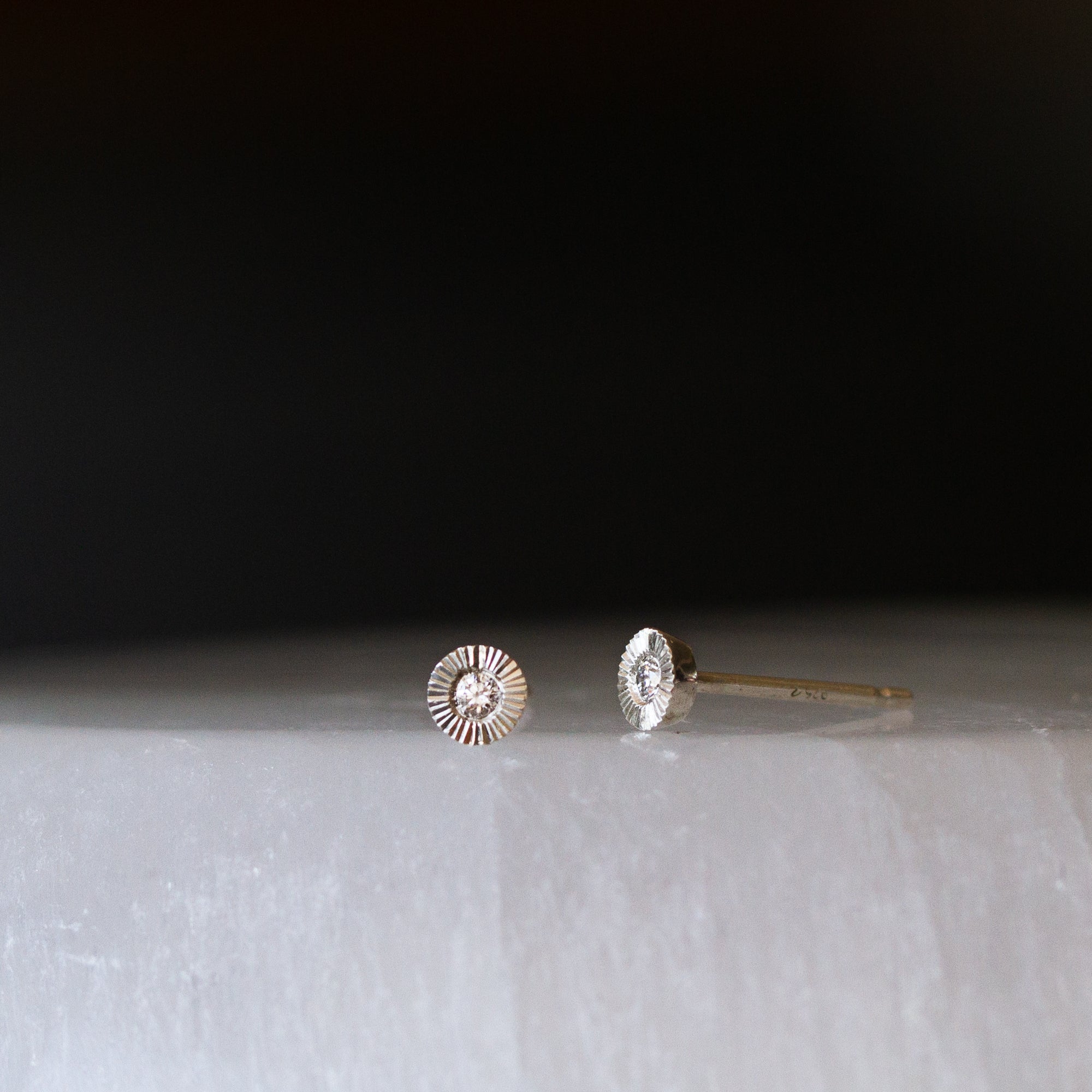 Our signature Aurora design, scaled to its most delicate size, features sparkling recycled diamonds nestled within hand-engraved rays that shimmer like sunbeams. These petite studs strike a perfect balance between elegance and simplicity. The artfully engraved sunburst pattern catches and reflects light with every movement, creating a captivating display.