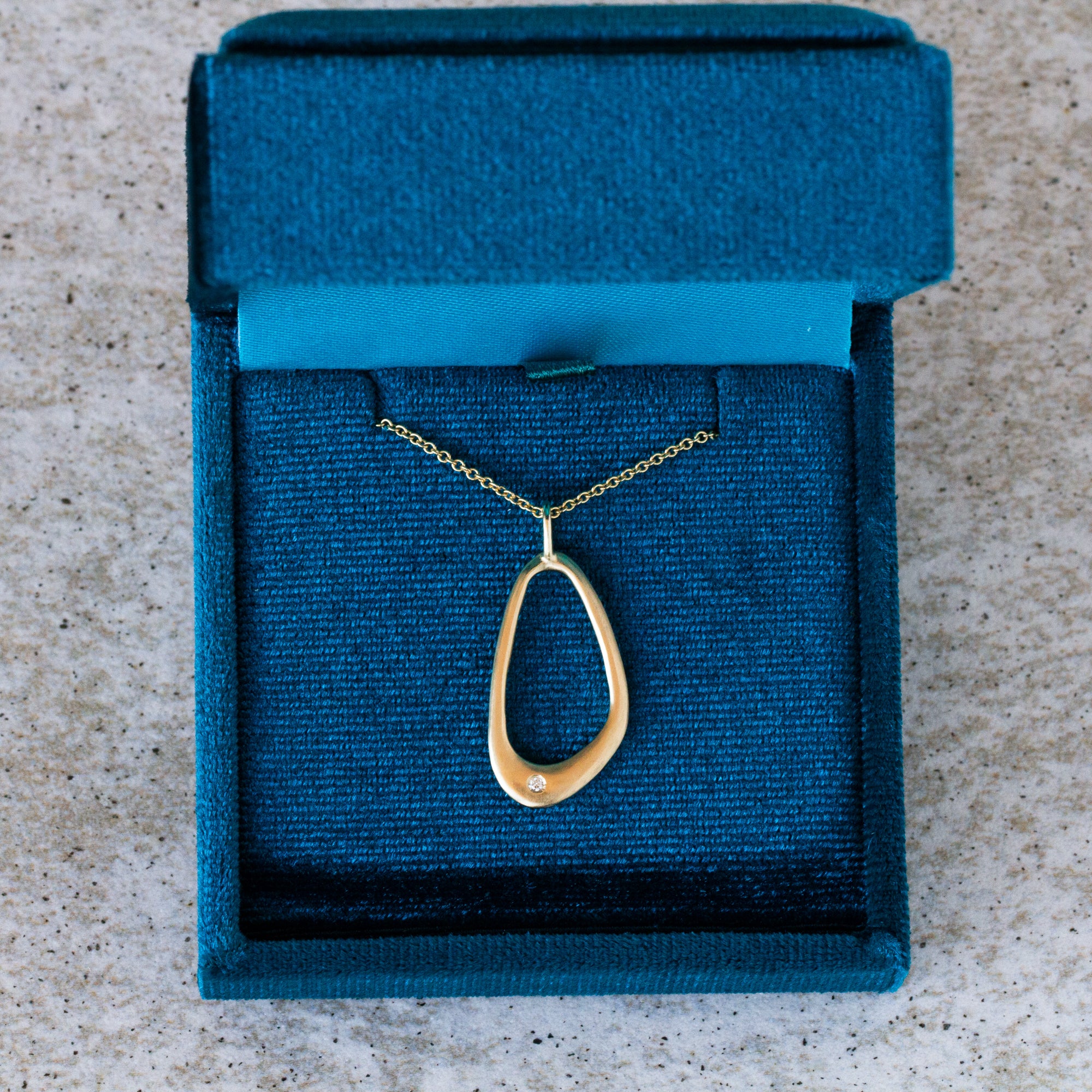 Capturing the ripple of a stone dropping in water, the hand-carved Wake Necklace features an open, sculptural form that moves gently as you wear it. Beautiful negative space draws the eye, while a single recycled diamond sits within the curved silhouette like a dewdrop caught in the wake's ripples. Suspended from a classic cable chain with adjustable length options, it works beautifully for both casual days and special occasions. This artistic pendant brings the poetry of water in motion to your collection of meaningful jewelry.