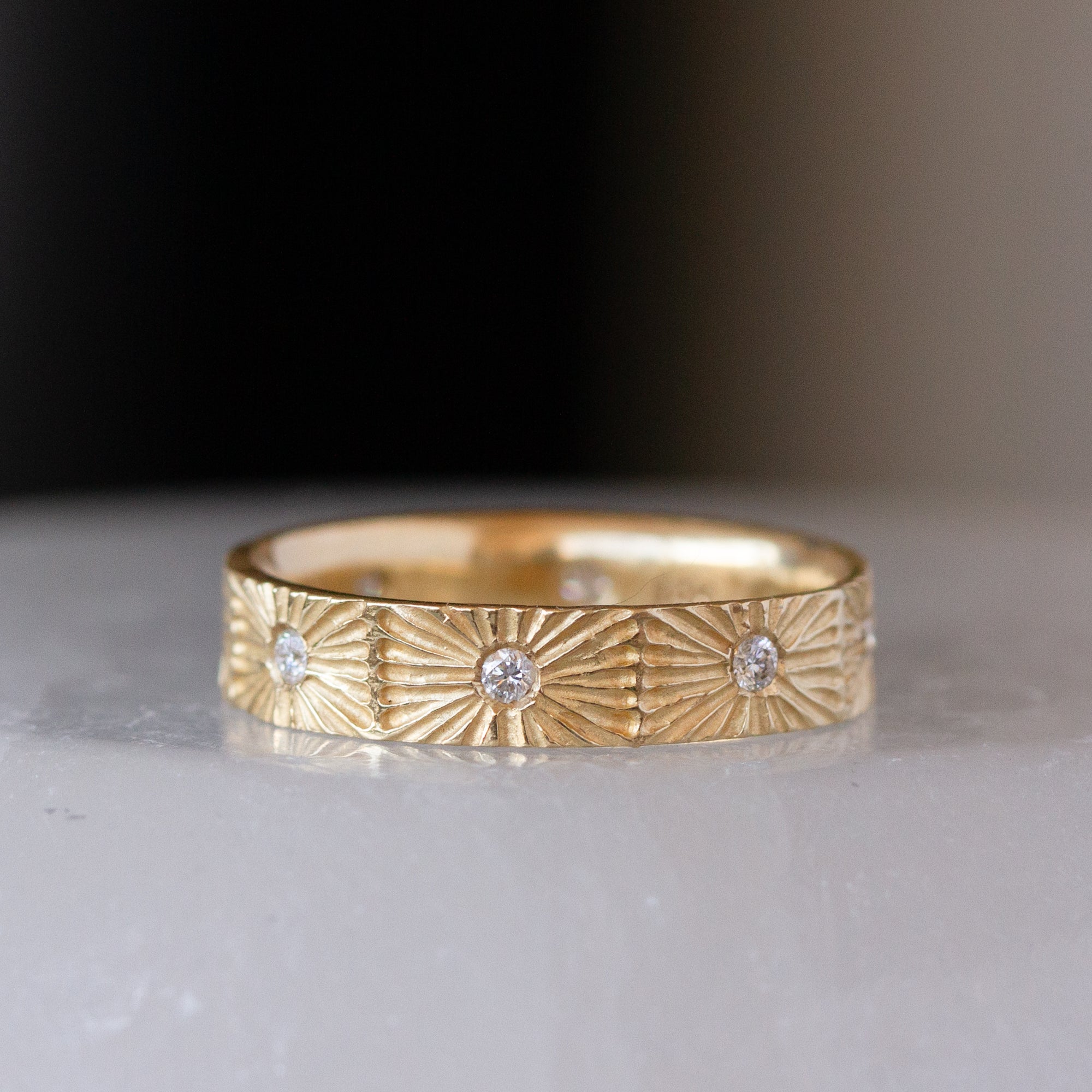 The Nova Eternity Band features eight twinkling Canadian diamonds, each nestled within its own hand-carved sunburst pattern. These organic, energetic rays radiate across the entire 4.5mm wide band, creating a ring that sparkles from every angle. Each artfully integrated diamond adds to the total weight of .16 carats.