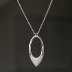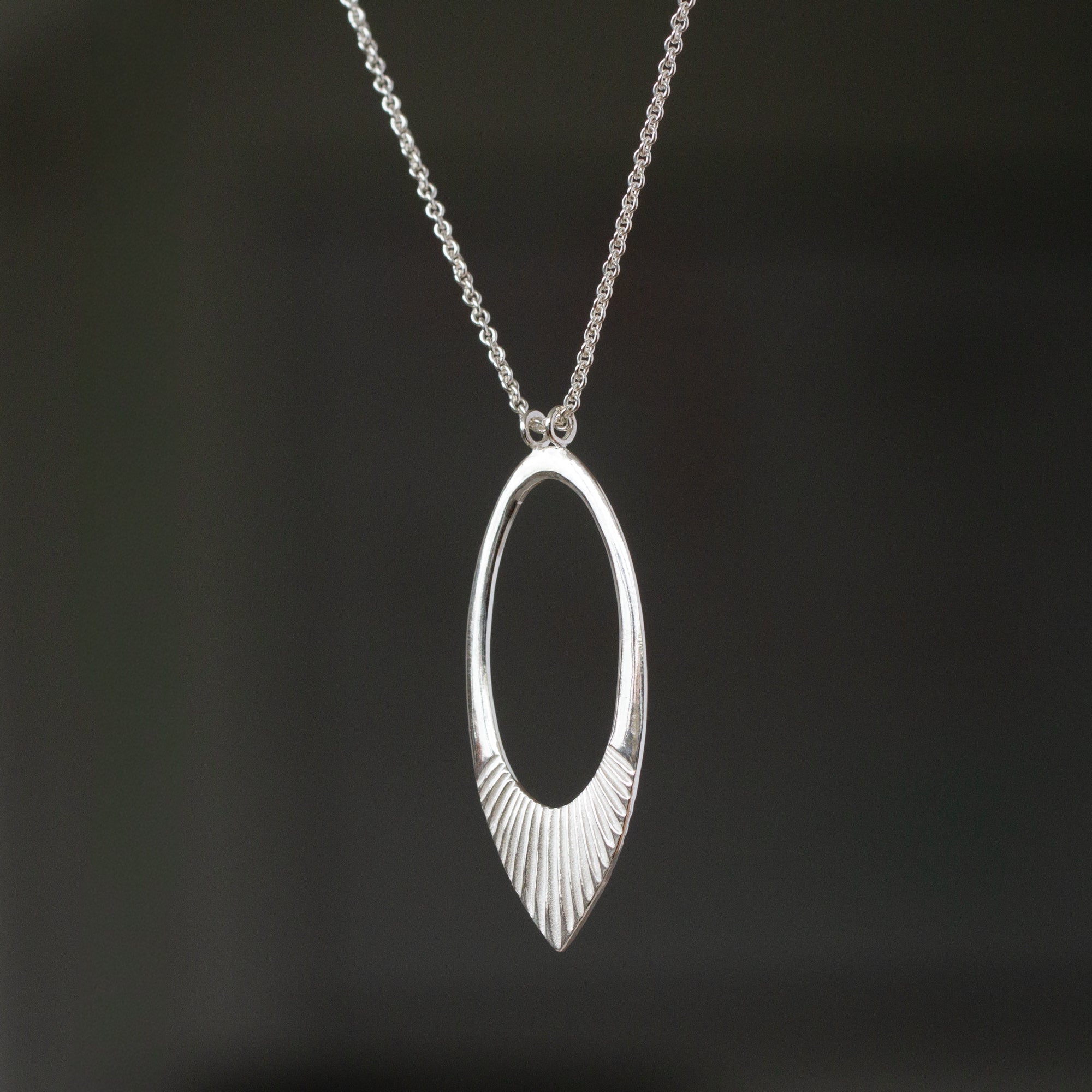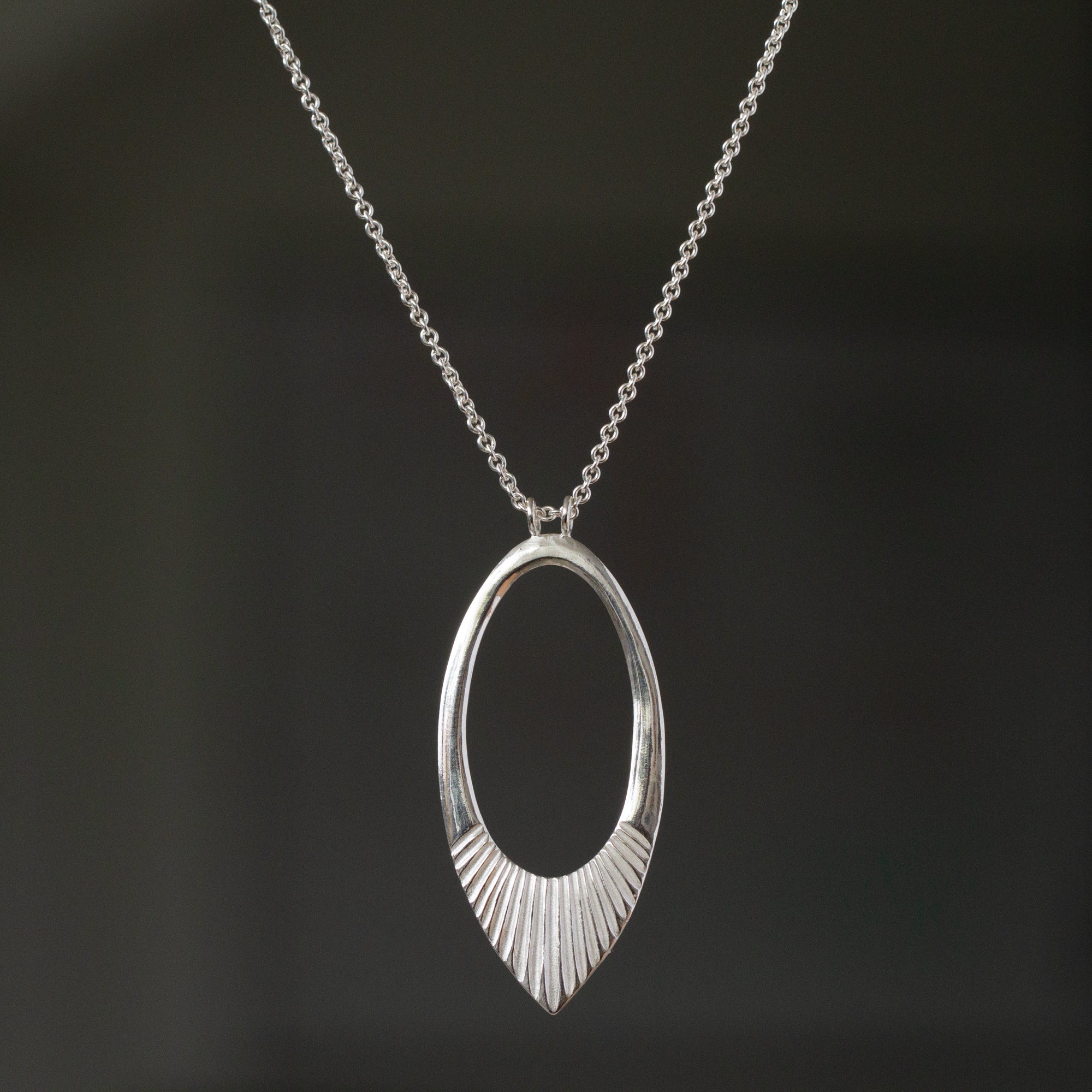 This elegant pendant features a modern petal silhouette with an oval opening at its center. Across the bottom, hand-carved rays radiate outward, contrasting with the polished upper arch. Thanks to its 26" chain, this statement piece layers beautifully over sweaters and turtlenecks. Expect this to become your favorite necklace in your winter wardrobe.