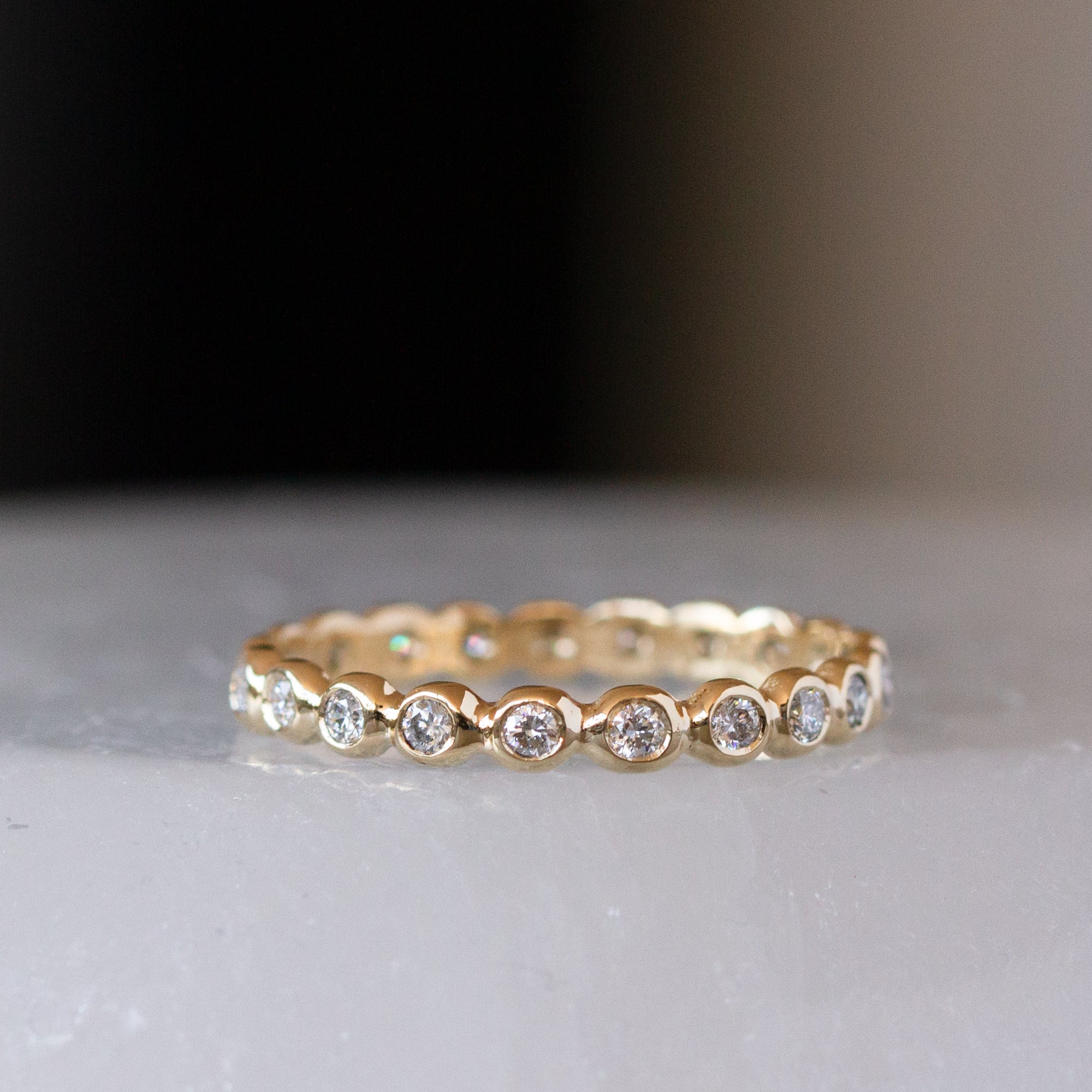 Our Diamond Droplet Band pairs everyday comfort with elegant sparkle. A continuous circle of smooth, plump golden bezels cradles sparkling Canadian diamonds, creating a design that's both sophisticated and refined. The thoughtful spacing between each setting provides a beautiful rhythm of light and shadow around the band.