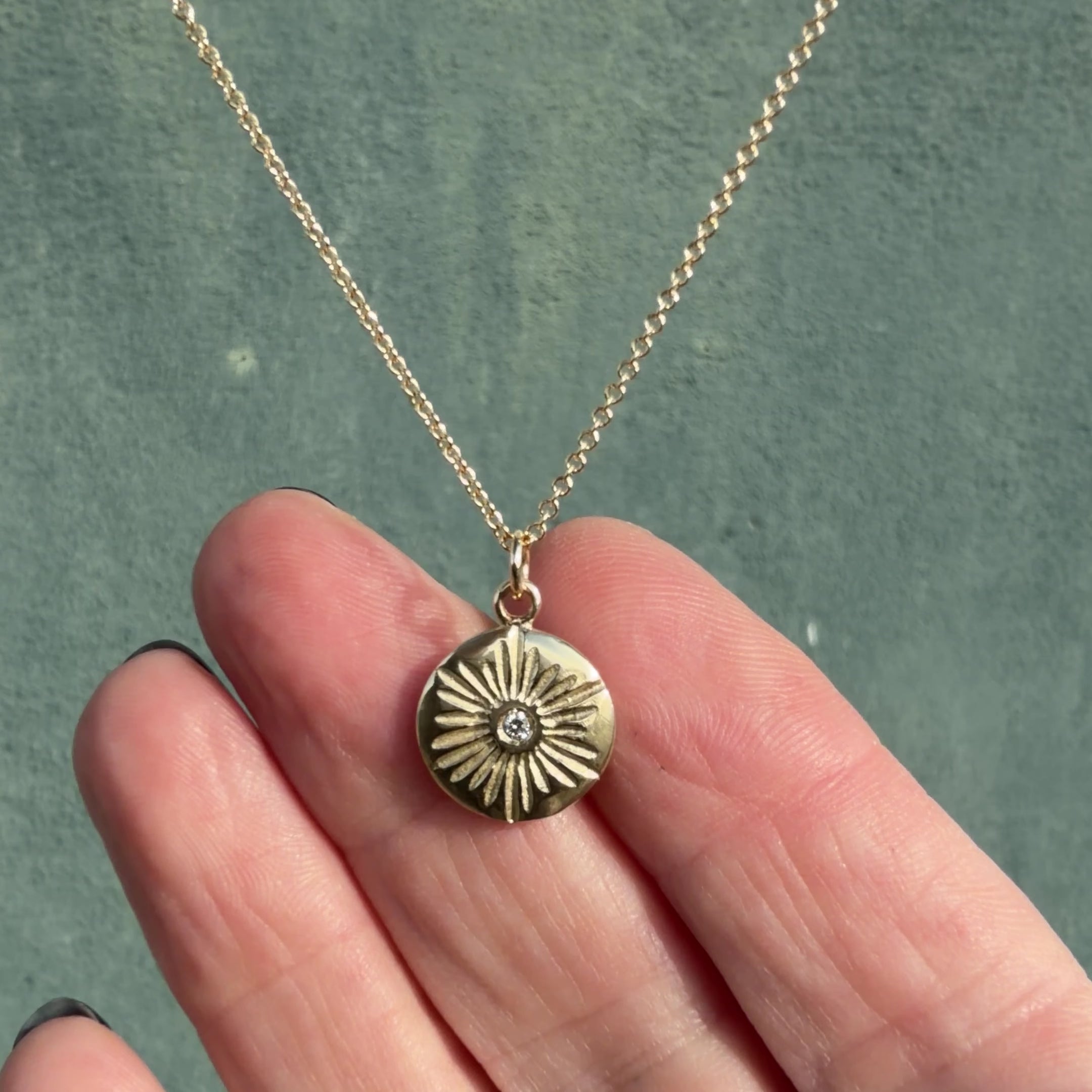 The Large Lucia Necklace commands presence with its thoughtfully hand-carved sunburst pattern radiating from a brilliant Canadian diamond center. This medallion makes an elegant statement at a sophisticated 5/8" width while remaining versatile enough for everyday wear. The adjustable cable chain lets you customize your look at 16" or 18", perfect for layering or wearing alone. Each carved line catches and reflects light, creating a mesmerizing play of shadows across the polished gold surface. Whether paired with a blazer or casual tee, this piece effortlessly elevates any look.