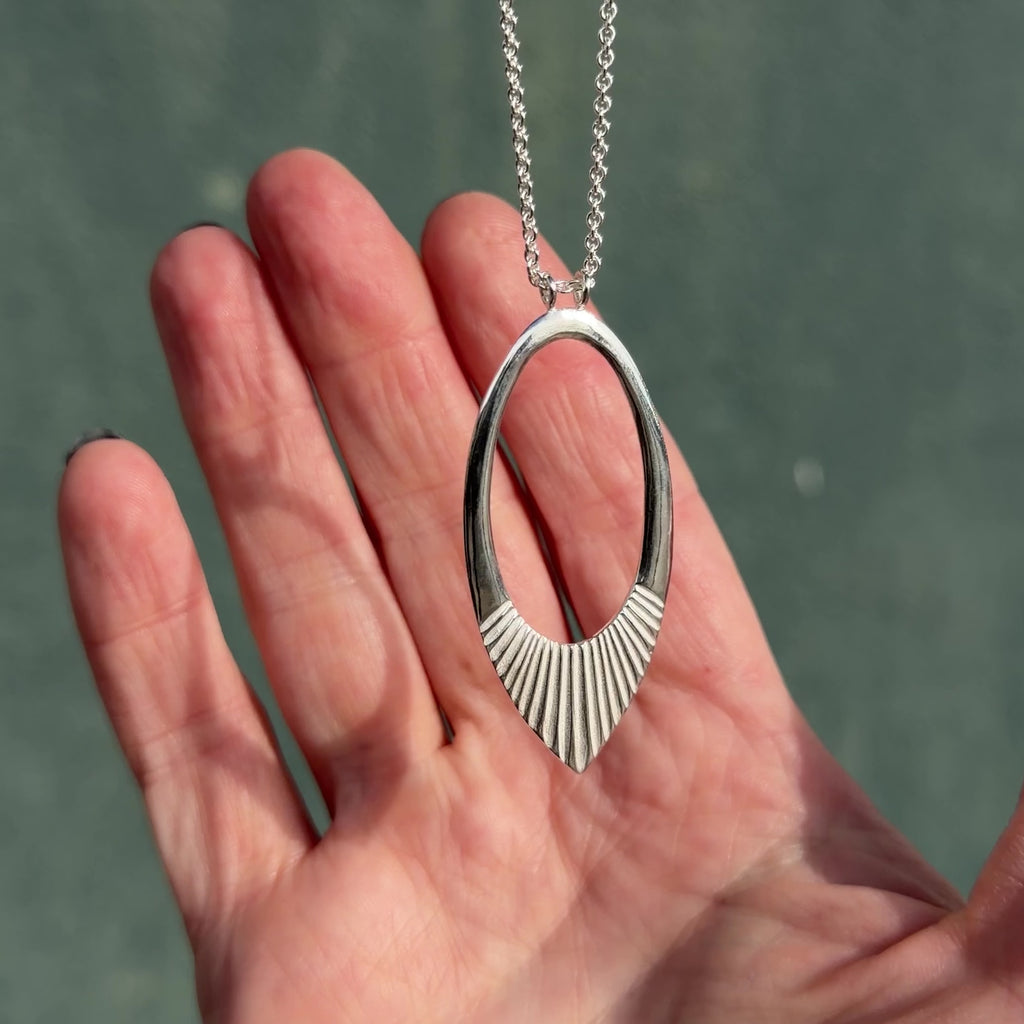 This elegant pendant features a modern petal silhouette with an oval opening at its center. Across the bottom, hand-carved rays radiate outward, contrasting with the polished upper arch. Thanks to its 26" chain, this statement piece layers beautifully over sweaters and turtlenecks. Expect this to become your favorite necklace in your winter wardrobe.