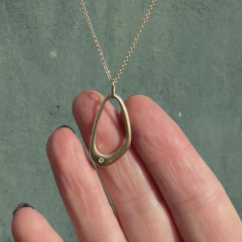 Capturing the ripple of a stone dropping in water, the hand-carved Wake Necklace features an open, sculptural form that moves gently as you wear it. Beautiful negative space draws the eye, while a single recycled diamond sits within the curved silhouette like a dewdrop caught in the wake's ripples. Suspended from a classic cable chain with adjustable length options, it works beautifully for both casual days and special occasions. This artistic pendant brings the poetry of water in motion to your collection of meaningful jewelry.