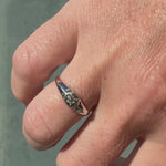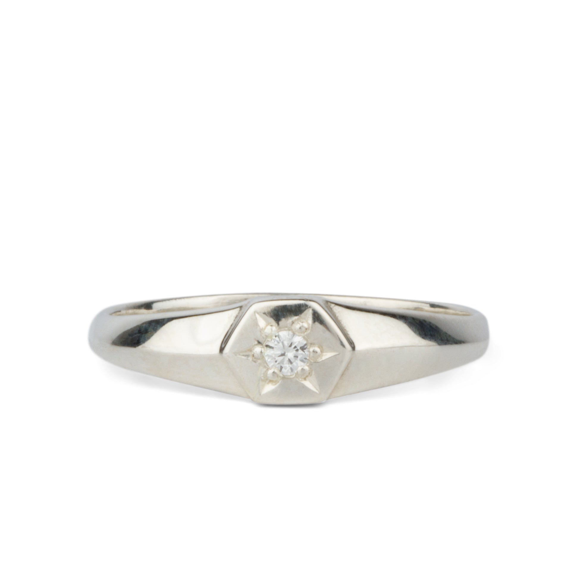 The Astra signet ring features a sparkling 2mm recycled white diamond star-set within a hexagonal top. A modern interpretation of the classic signet style, this ring combines a knife-edge band with a sleek 3/16" wide face for an elegant low profile. Each six-pointed star setting is hand-carved to create a perfect frame for the center stone.