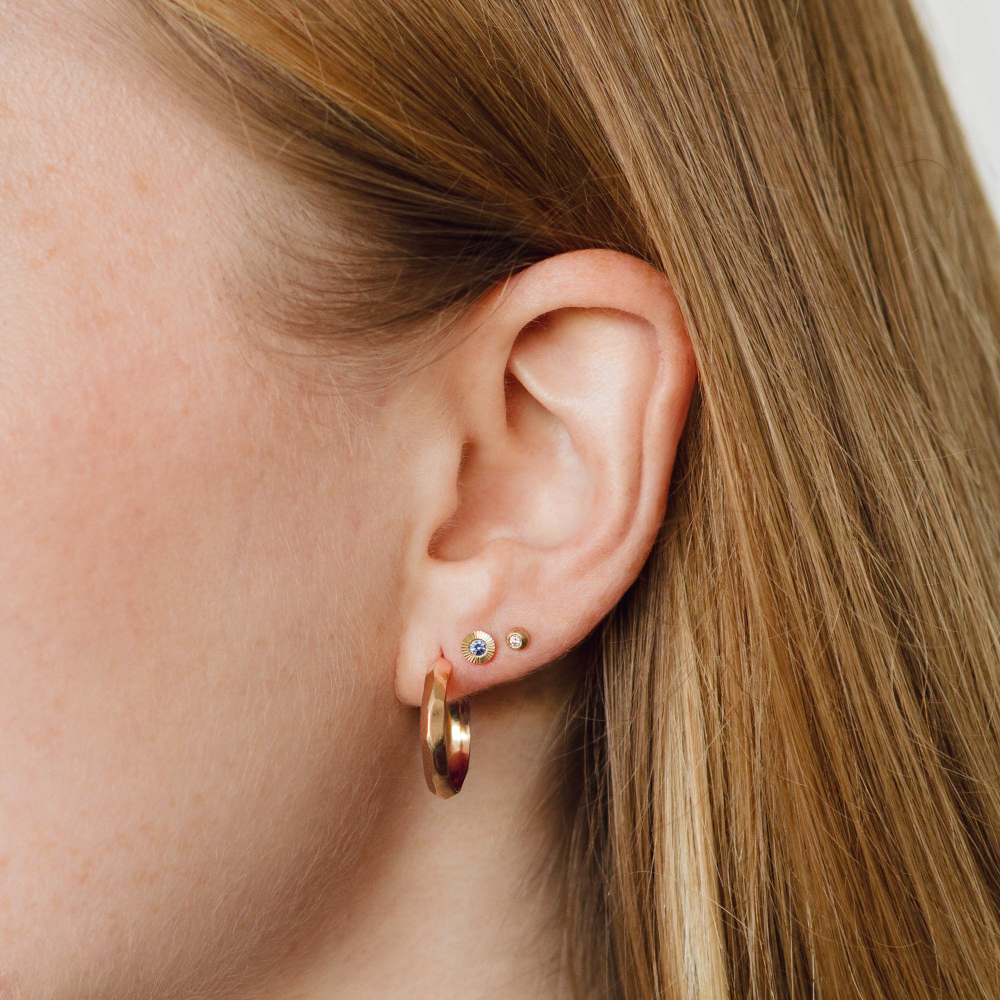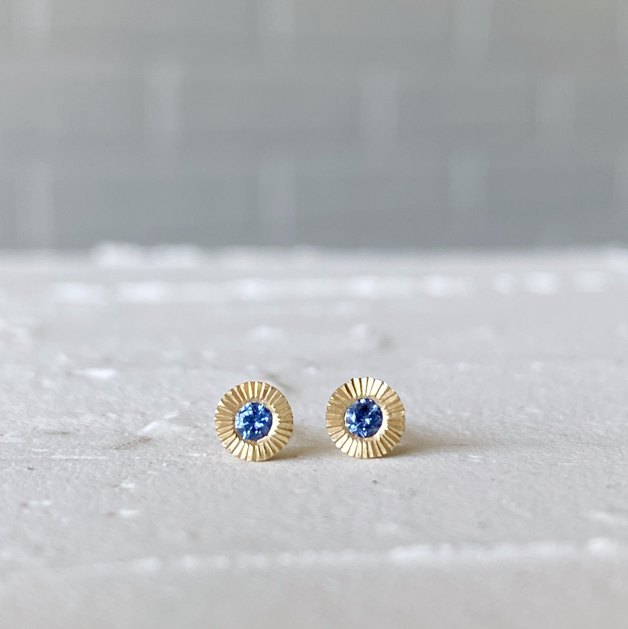 Our signature Aurora design features rare Yogo sapphires at its center. A step up from our micro size, these hand-engraved rays create an elegant sunburst pattern that catches and reflects light with every movement. The minimal scale offers a sophisticated sparkle while maintaining an effortless presence.