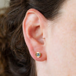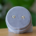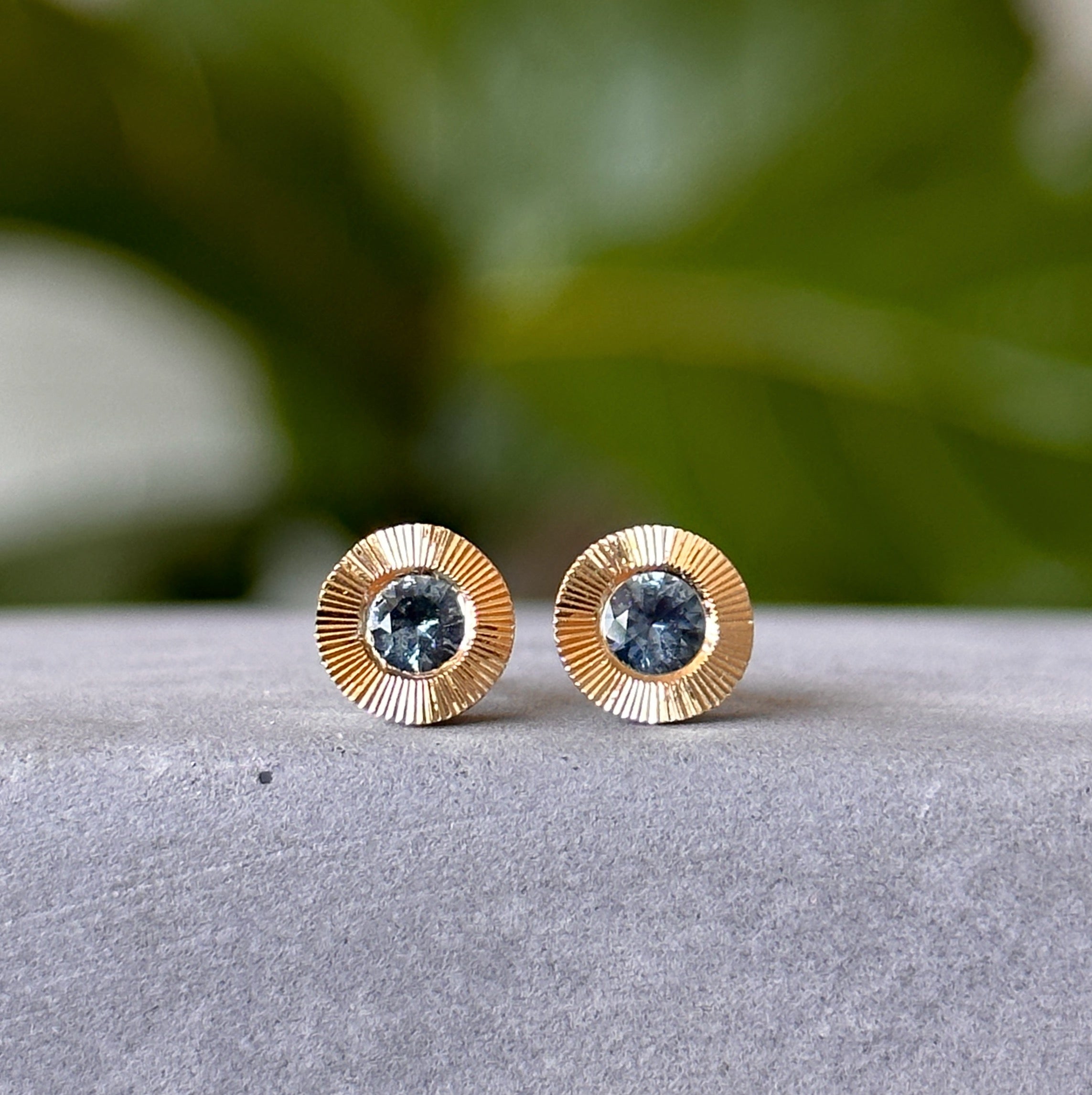 The most luxurious size of Aurora stud earrings. These large solid gold studs feature a pool of blue montana sapphire in the center and a hand-engraved halo border that glistens in the light.