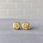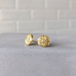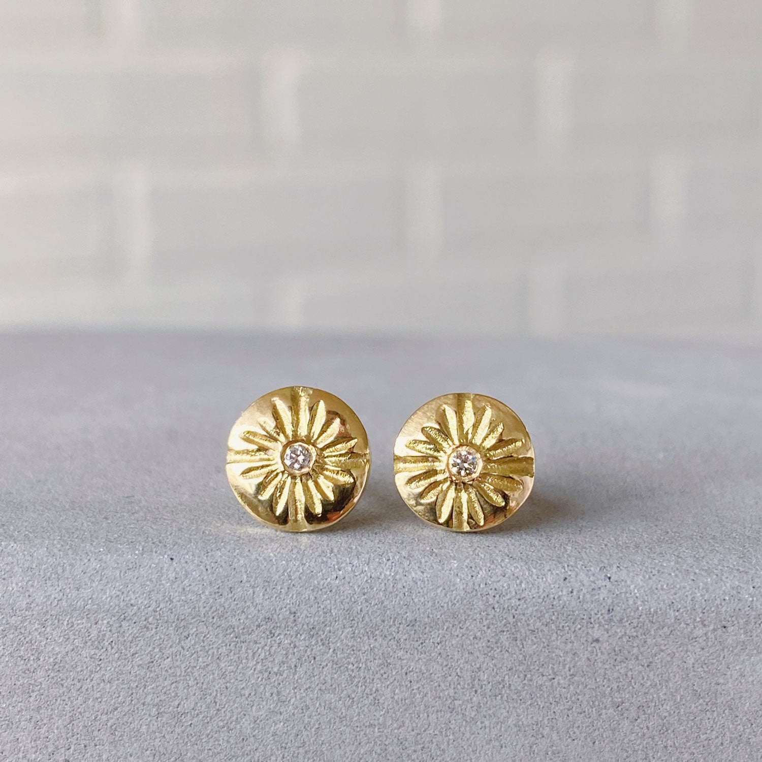 Our Small Gold Lucia Stud Earrings blend delicate detail with everyday luxury. Each hand-carved 14k yellow gold disc features an intricate sunburst pattern etched around a sparkling recycled white diamond center, creating an ethereal play of light and texture.