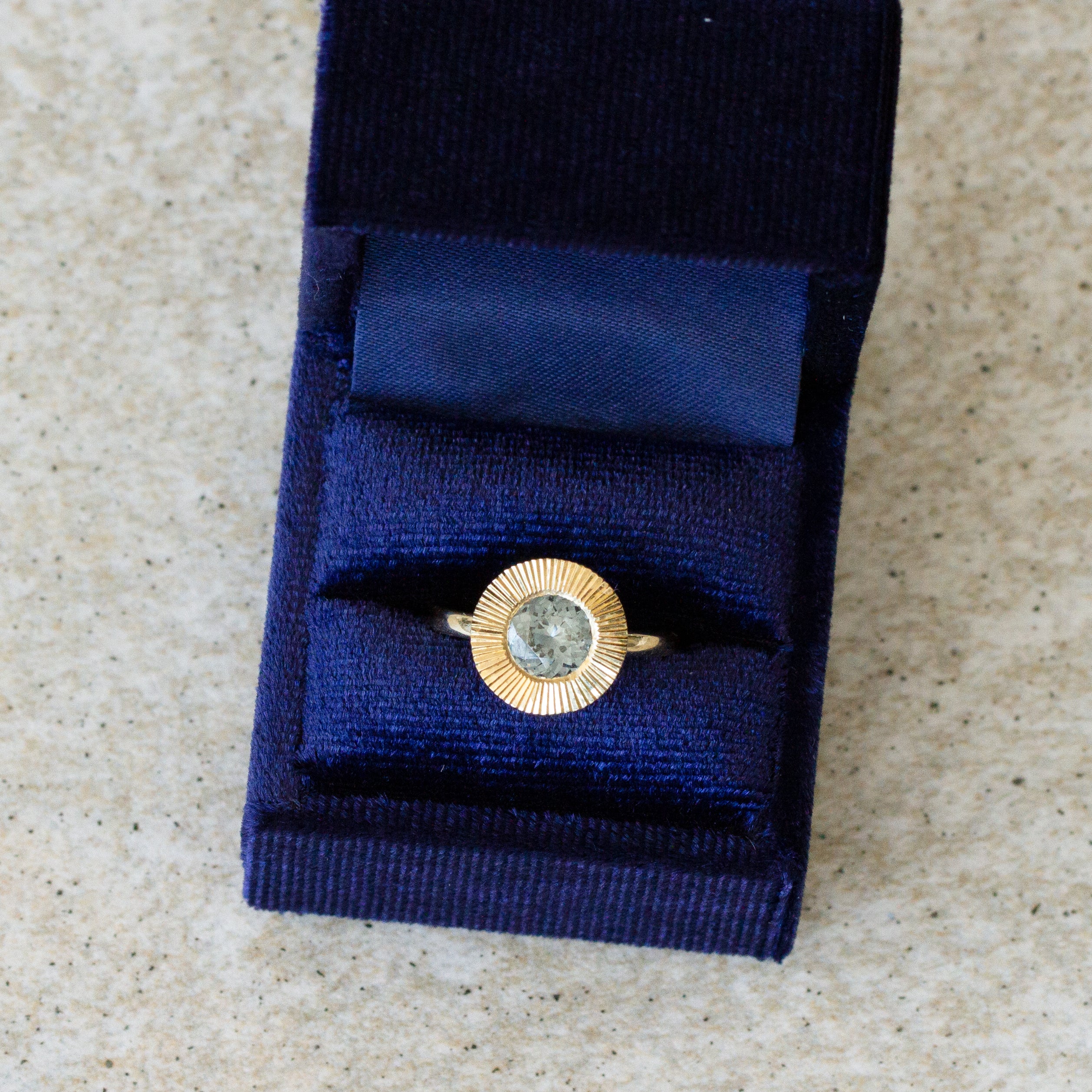 Our signature Aurora design showcases a mesmerizing 1.24ct Mozambique spinel in an enchanting blue-purple hue, nestled within hand-engraved rays that shimmer like sunbeams. The artful radial pattern in warm 14k gold creates a striking contrast with the moody center stone, while the elevated setting allows light to dance through the gem from all angles.