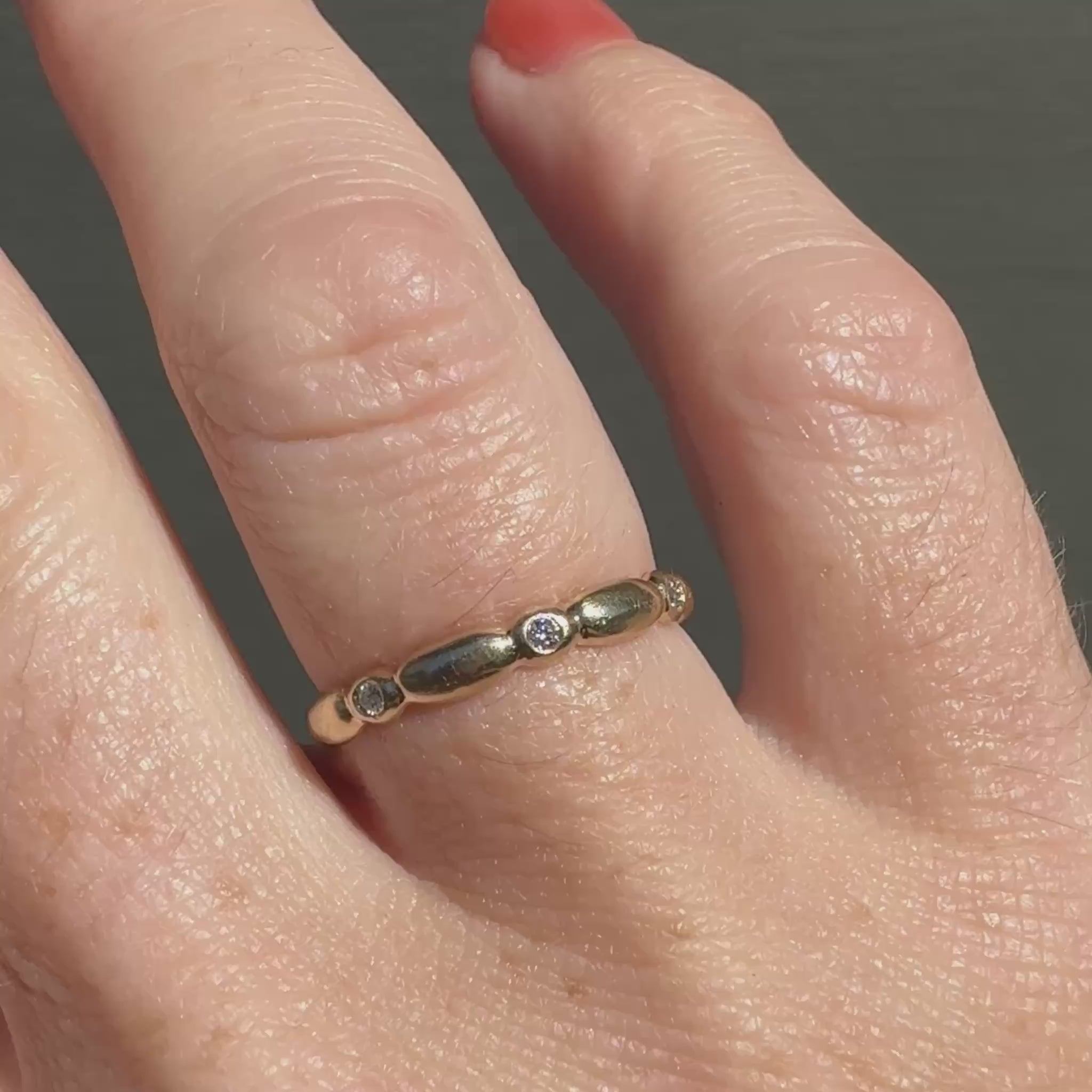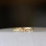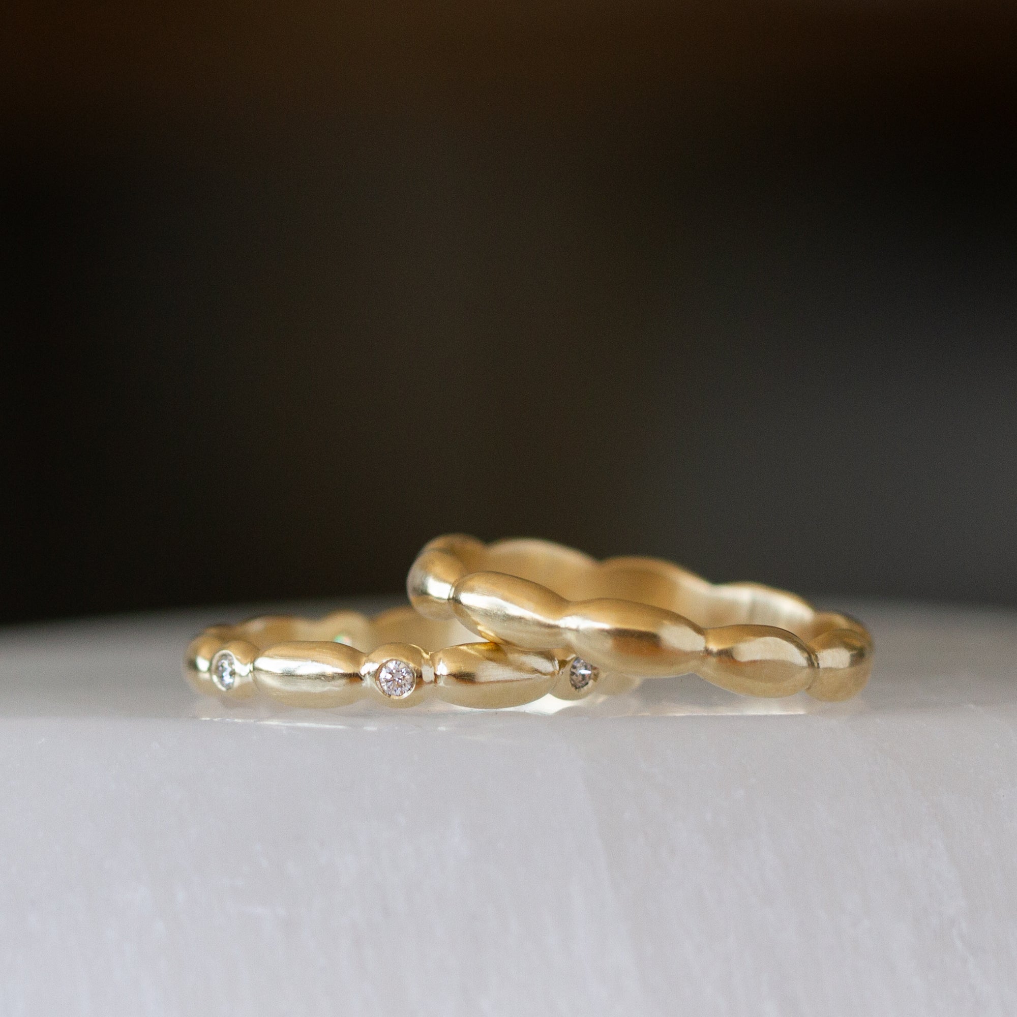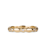 This hand-carved 14k gold Pebble Droplet Eternity Band captures the rhythm of water dancing over stones. Organic oval pebbles alternate with brilliant round droplets in an endless circle around your finger, each Canadian diamond nestled perfectly within its golden setting like dewdrops caught in morning light. The flowing, scalloped silhouette creates beautiful visual movement while maintaining the soft curves that define our Creek Collection. Whether worn as a unique wedding band or as an interesting accent in a ring stack, its comfortable 3mm width makes it perfect for daily wear. This sophisticated design celebrates both the steady flow of water and those precious moments when light catches each sparkling droplet.