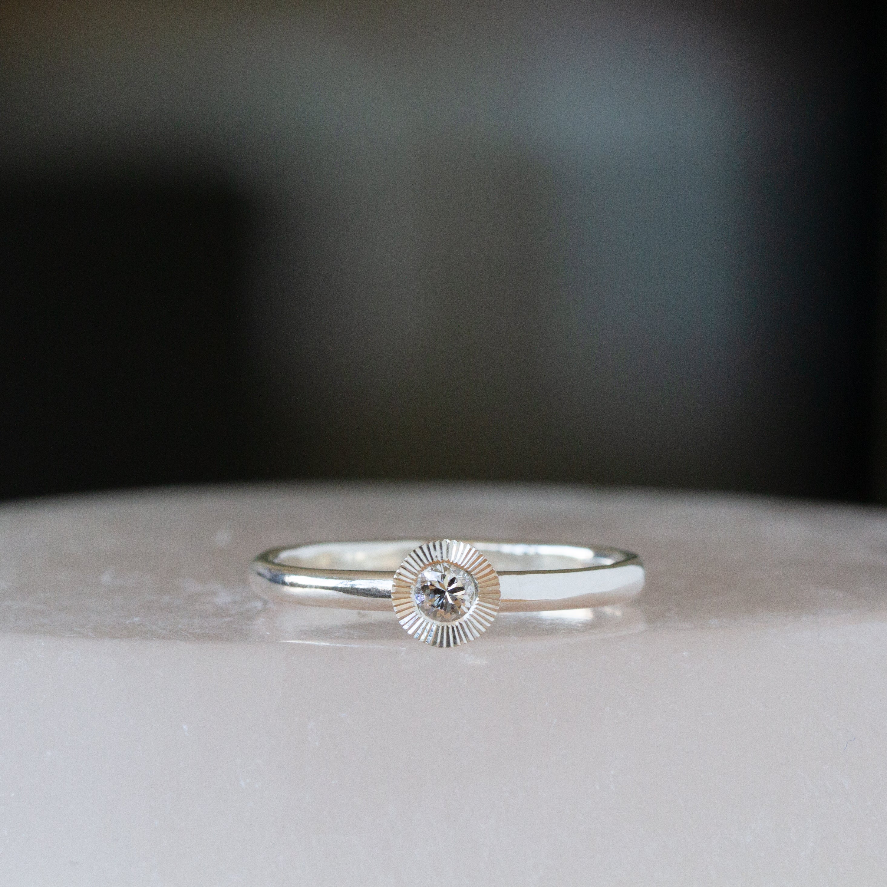 Our large Aurora style features a brilliant 3mm recycled white diamond nestled within hand-engraved rays that shimmer like sunbeams. The Aurora pattern creates a 5.5mm diameter focal point atop a comfortable 2mm round band, making it perfect for stacking with other rings in your collection.