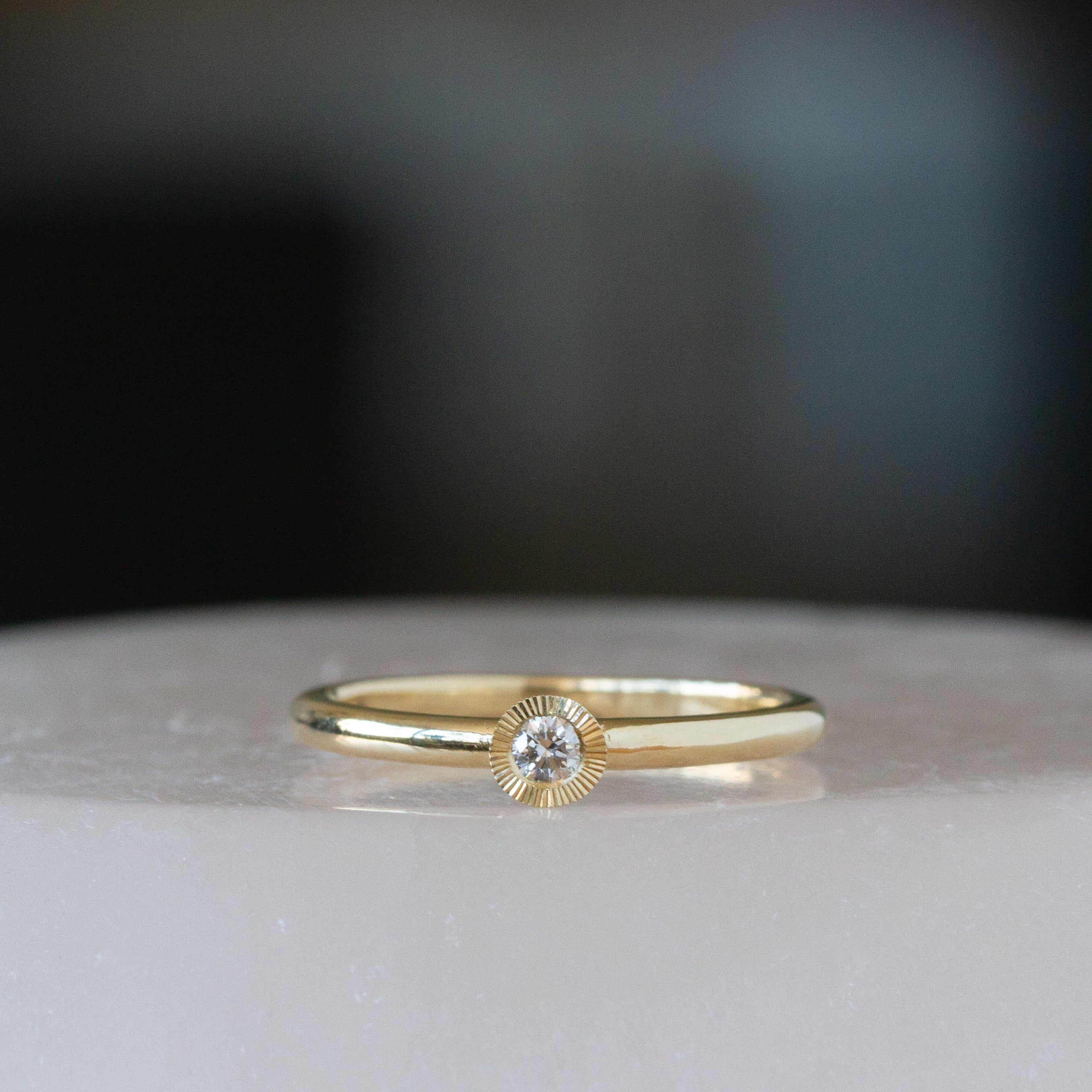Our medium Aurora stacker features a brilliant 2.5mm Canadian white diamond nestled within hand-engraved rays that shimmer like sunbeams. The Aurora pattern creates a 4.5mm diameter focal point atop a comfortable 2mm round band, making it perfect for stacking with other rings in your collection.