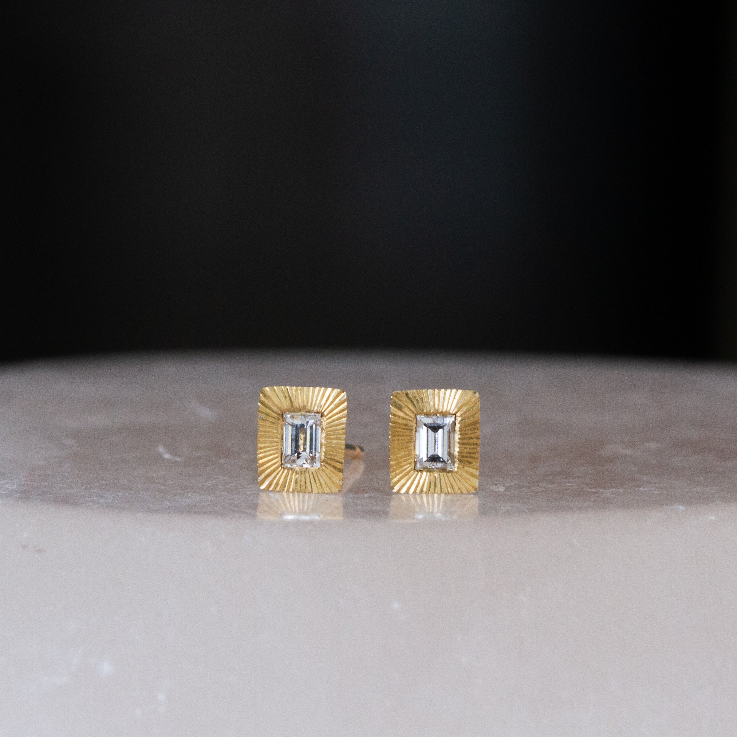 The elegant step cuts of these baguette diamonds are accented by the engraved halo border on these Aurora stud earrings.