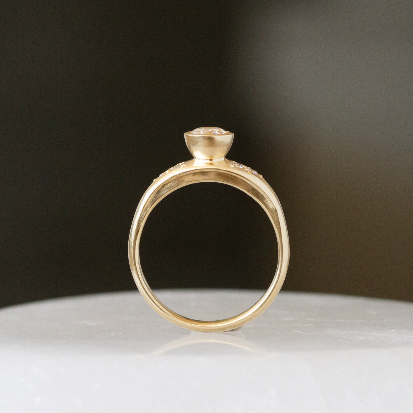 Each stone is carefully bezel-set for everyday durability, while the thoughtful hidden shelf design allows your future wedding band to stack flush against it. It's old-world romance meets contemporary craftsmanship, perfect for someone who appreciates the story that antique stones whisper through their facets.