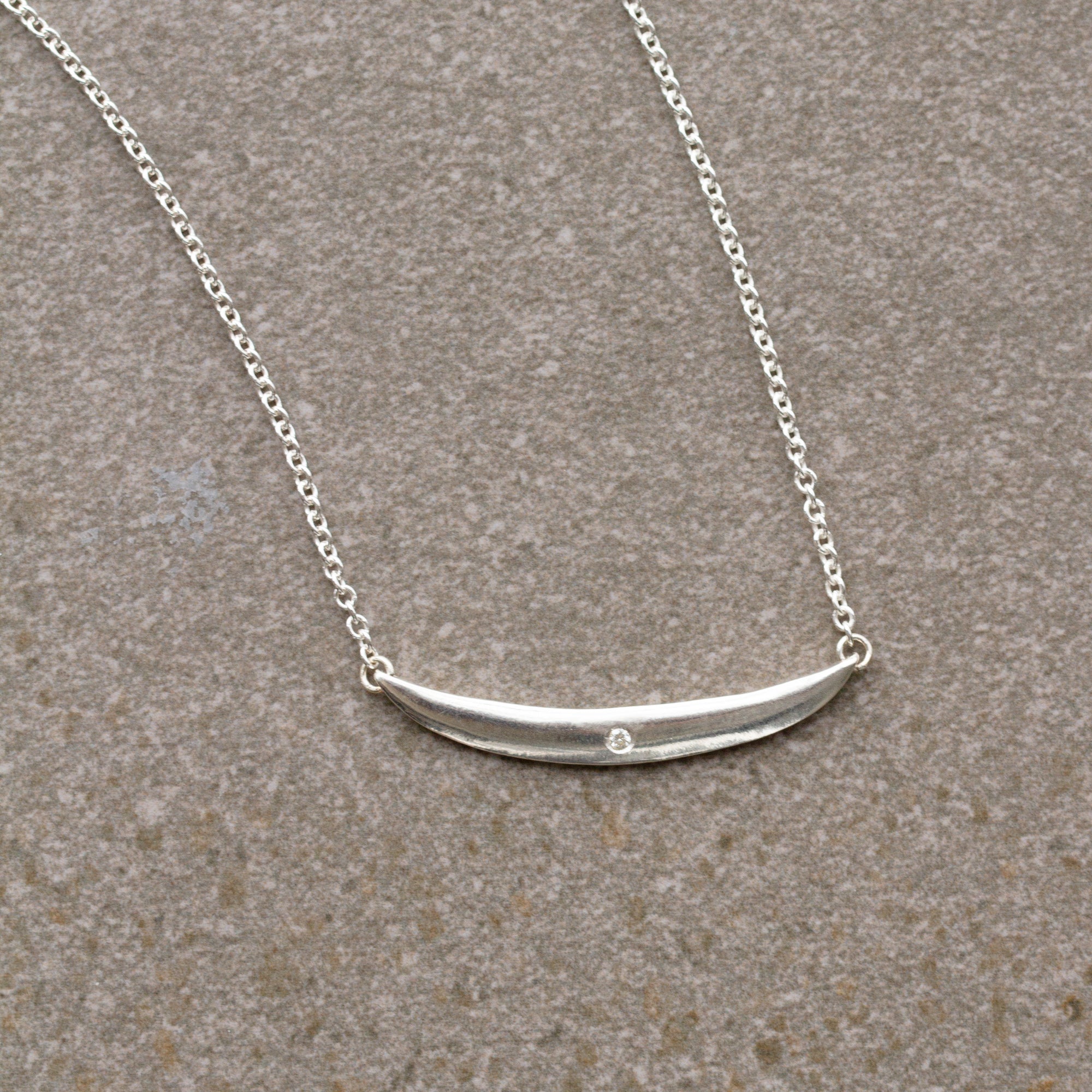 Capturing the fluid sweep of water flowing around smooth stones, the hand-carved Current Necklace moves gracefully across your neckline. Its gentle arc echoes the natural path of flowing creeks, while a single recycled diamond marks the center like a point of light reflecting off moving water. The sleek silhouette feels modern yet timeless, making it perfect for layering with other necklaces or wearing solo for understated elegance. From boardroom meetings to weekend escapes, this refined pendant is perfect for someone who is always on the move.