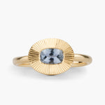 Our signature Aurora design showcases a striking .60ct Montana sapphire in a contemporary east-west orientation, nestled within hand-engraved rays that shimmer like sunbeams. The artful radial pattern in warm 14k gold creates an elegant frame for this cushion-cut gem, while the elevated setting allows light to dance through the stone from all angles.