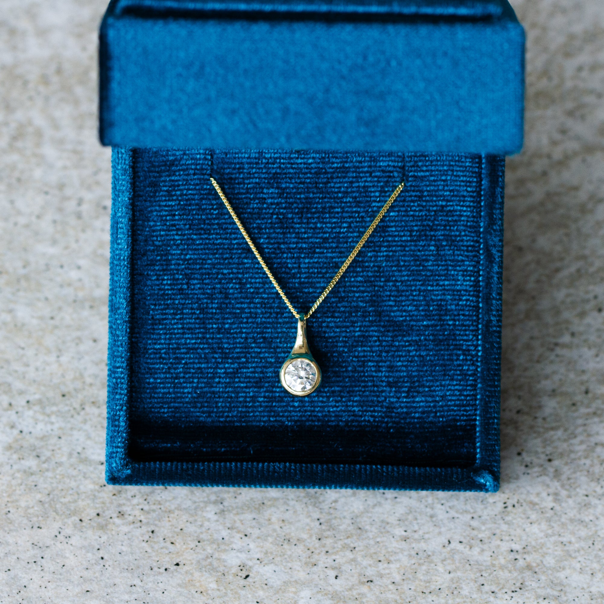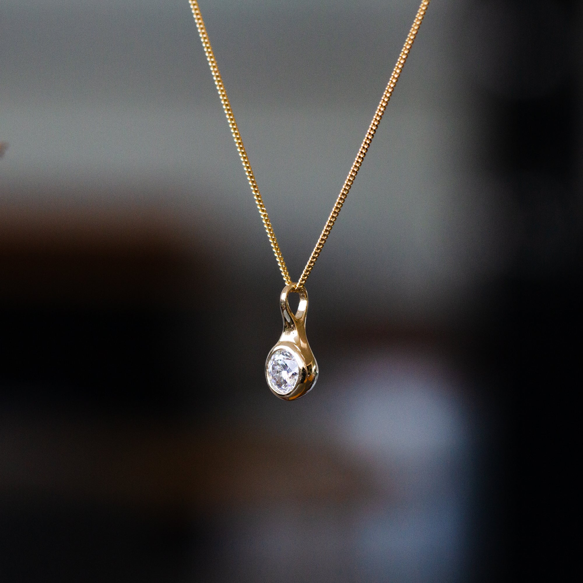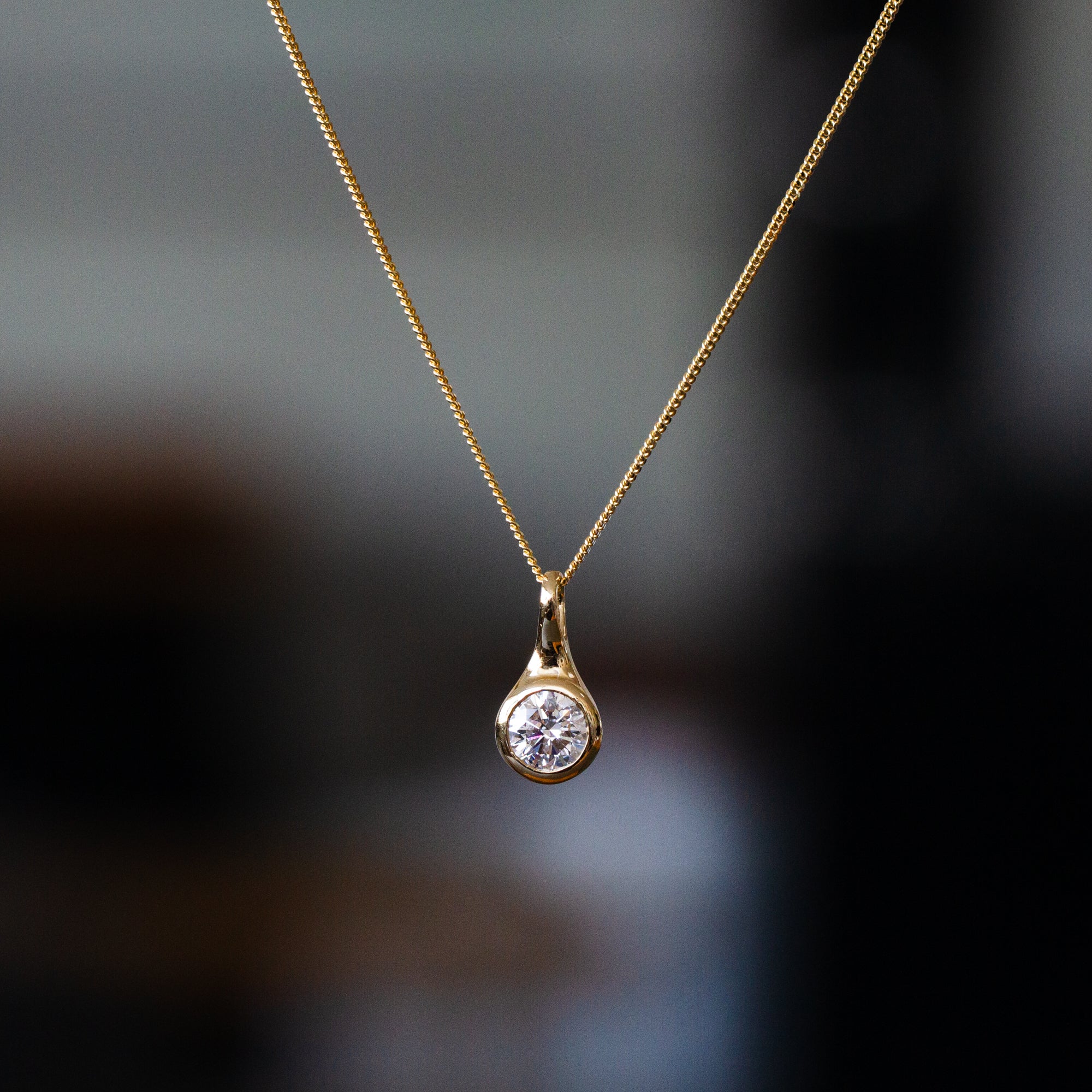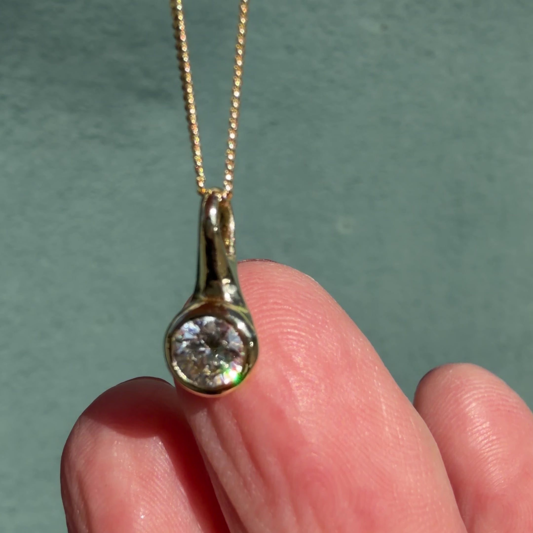 Sleek high polished drop pendant with round center gemstone. Sleek and sculptural, the hand-carved Extra Large Diamond Drip pendant is a true showstopper with its impressive .80-carat lab-grown diamond. The high-polish drop cradles the brilliant stone in its elegant form, creating dazzling sparkle that makes an unforgettable statement.