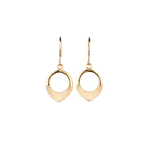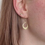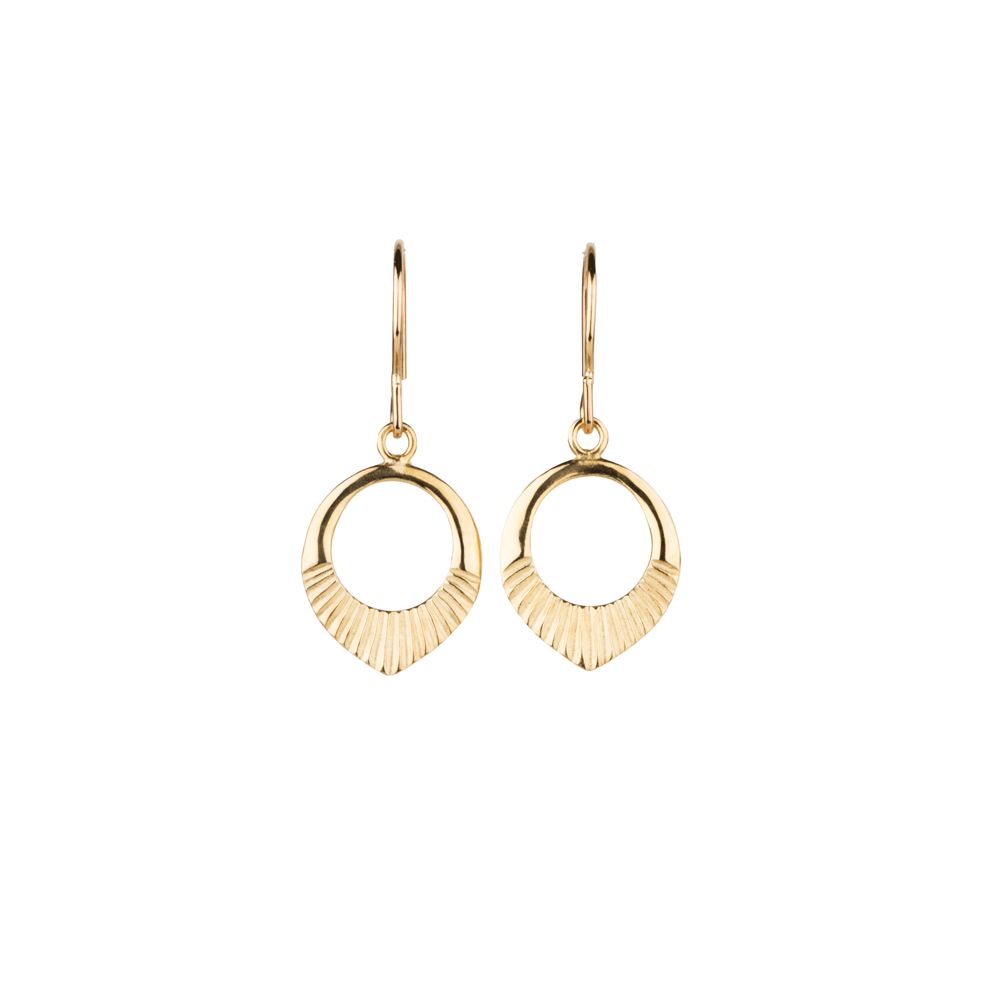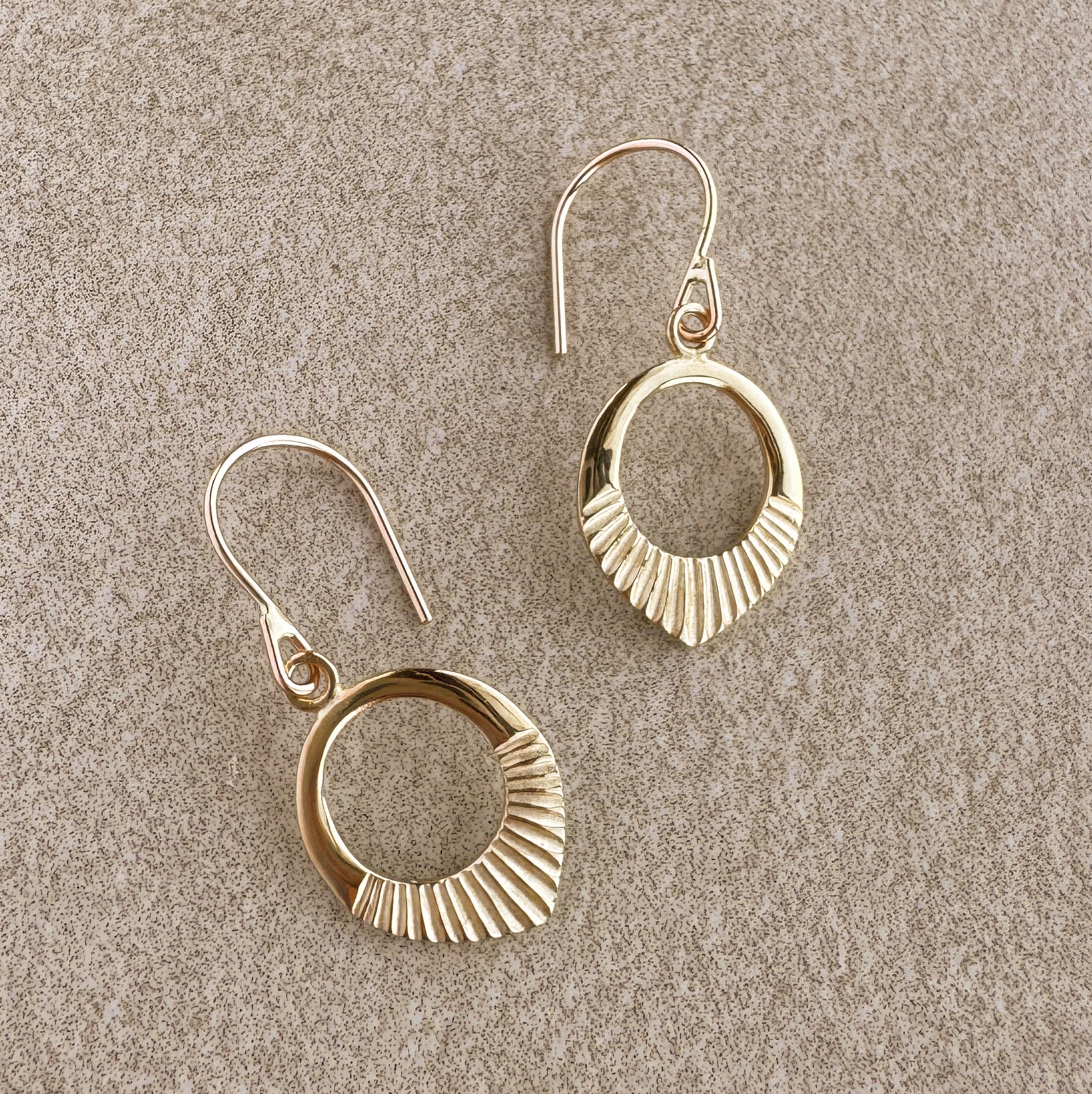 Our 14k Gold Small Helios Drop Earrings embody refined luxury in our signature design. Each hand-carved piece features a smooth, polished gold arch that gracefully curves above precisely etched rays, creating a soft petal-like silhouette that captures and reflects light beautifully.