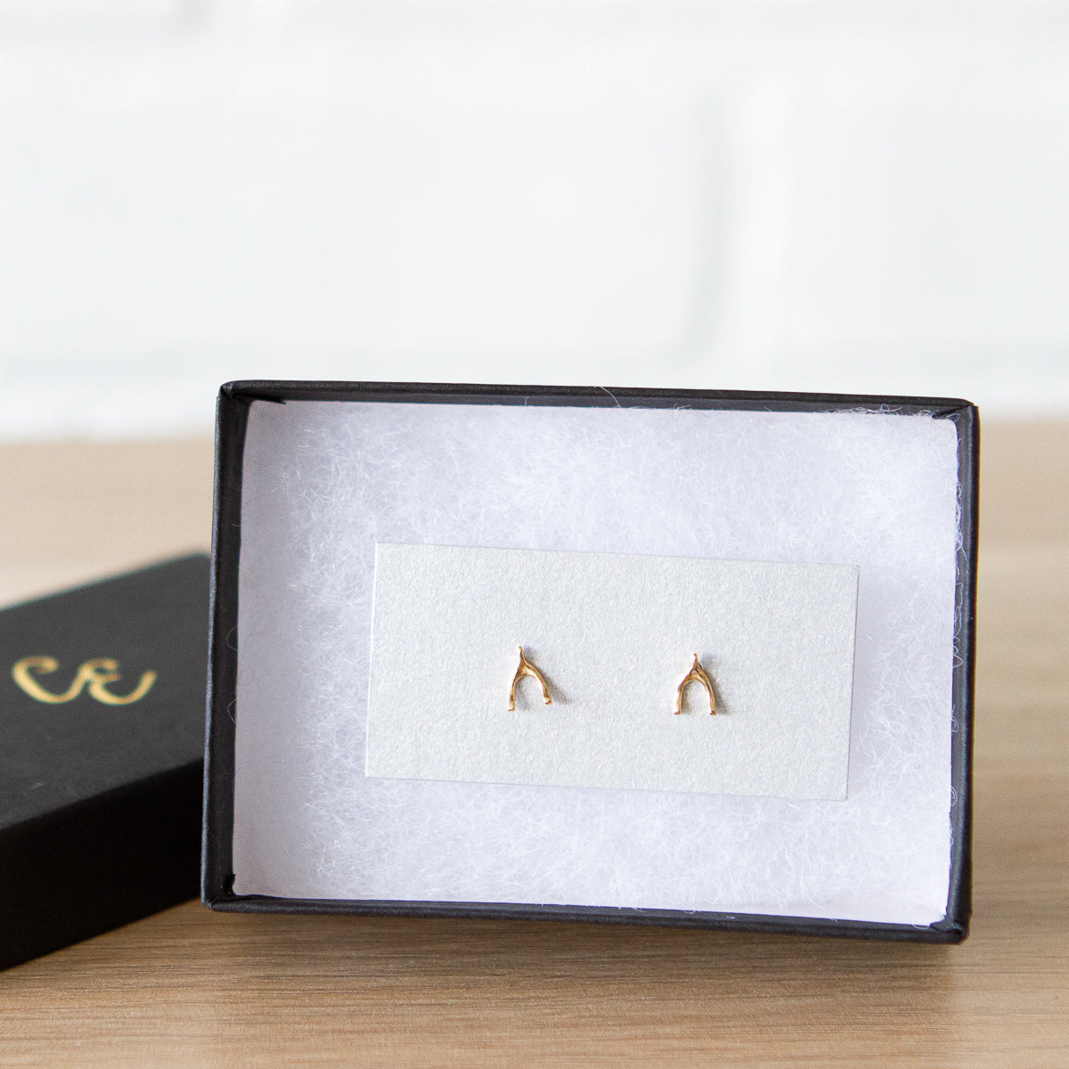 Our Gold Wishbone Studs bring a touch of whimsy and luck wrapped in luxurious warmth. These delicate 14k yellow gold earrings capture the classic wishbone symbol in a clean, modern design that sits comfortably against the earlobe.