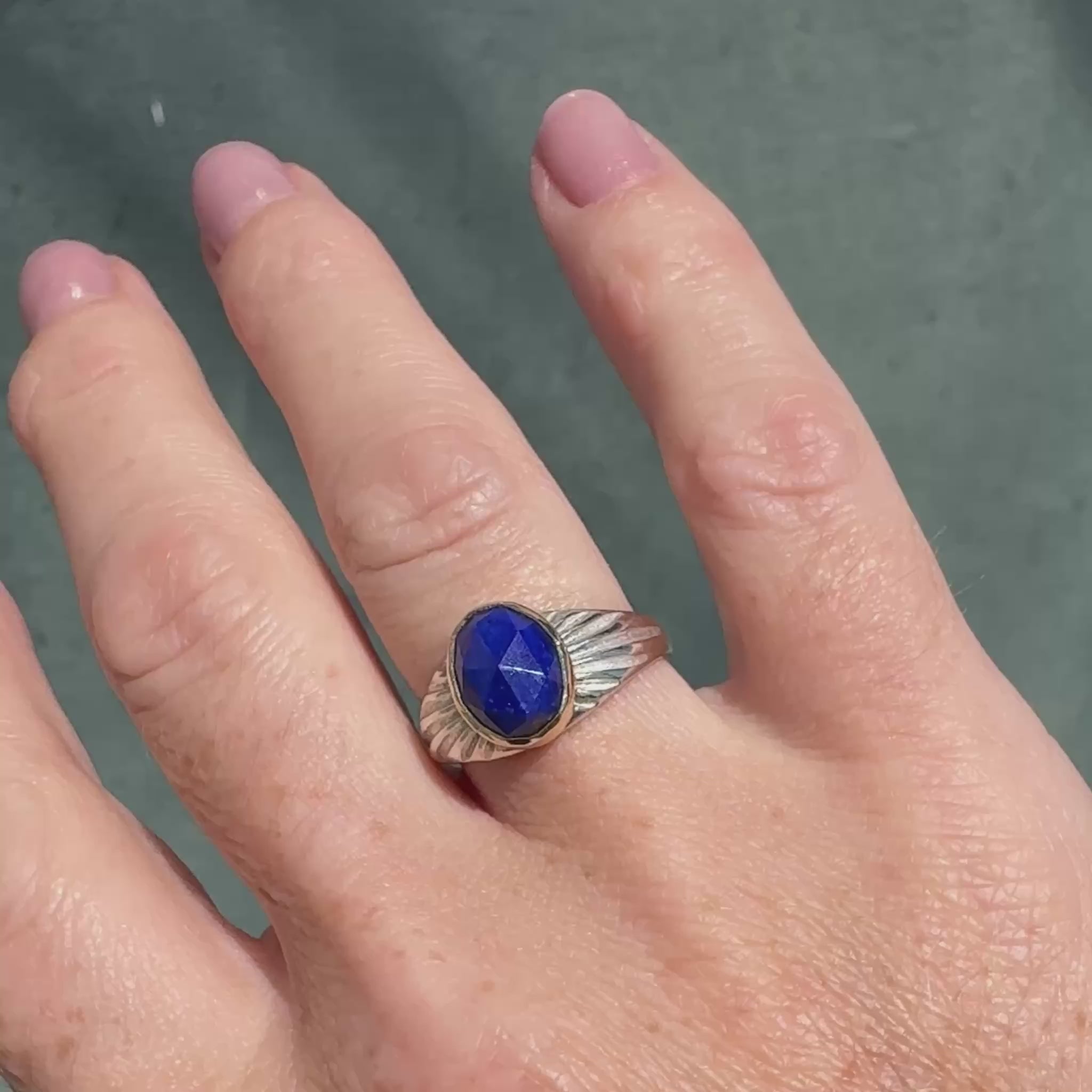 A rich cobalt rose cut lapis is embraced in a yellow gold bezel, surrounded by hand-carved sunburst rays on a tapered silver band.