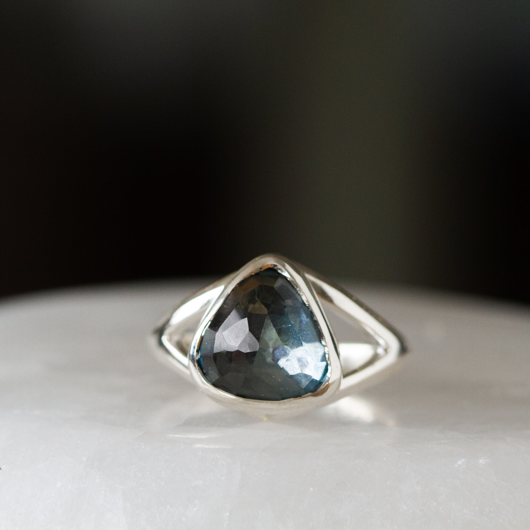 This striking statement ring showcases a magnificent 4.42-carat triangle rose cut London Blue Topaz in a smooth sterling silver bezel setting. The geometric silhouette of the Cleo design creates clean, modern lines that let the deep oceanic blue of the topaz take center stage. Its substantial presence feels both bold and elegantly refined, perfect for the woman who appreciates distinctive design. The triangle cut adds an unexpected contemporary edge while the rich blue hue evokes the depths of California's coastal waters.