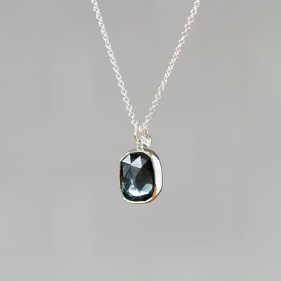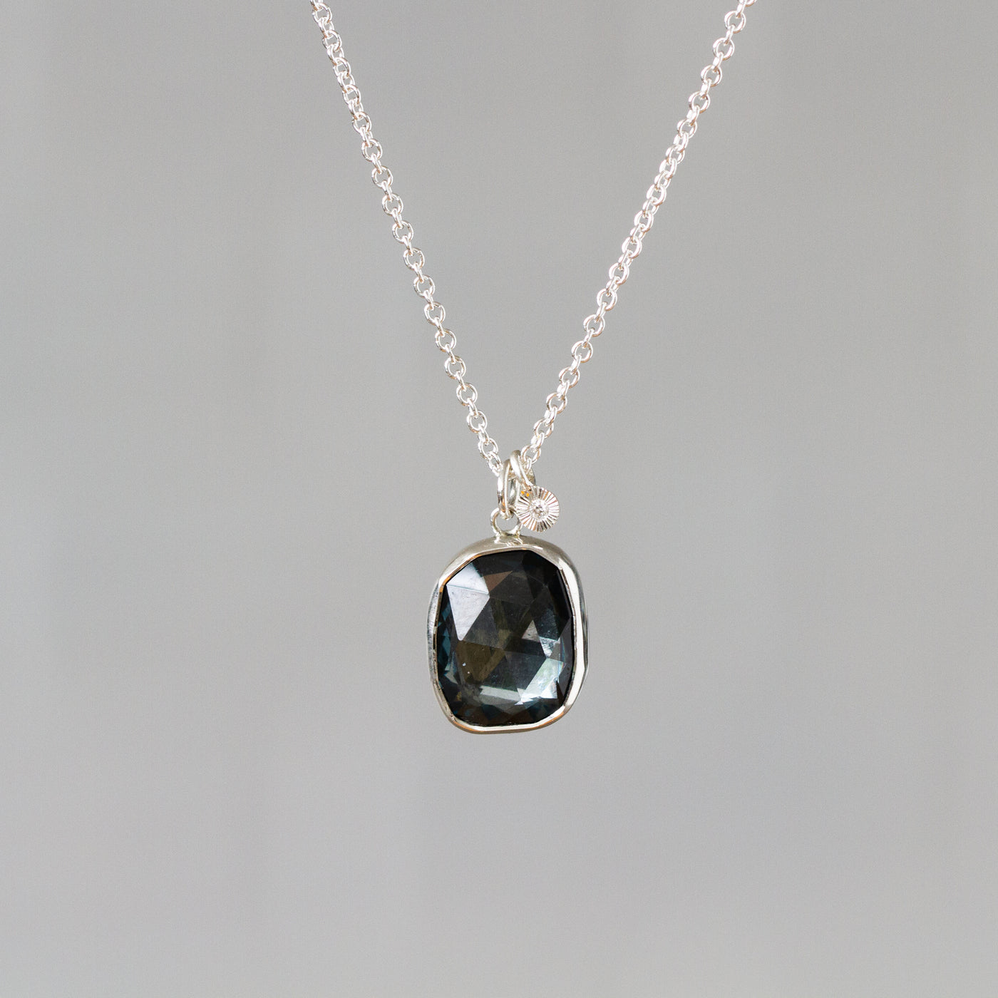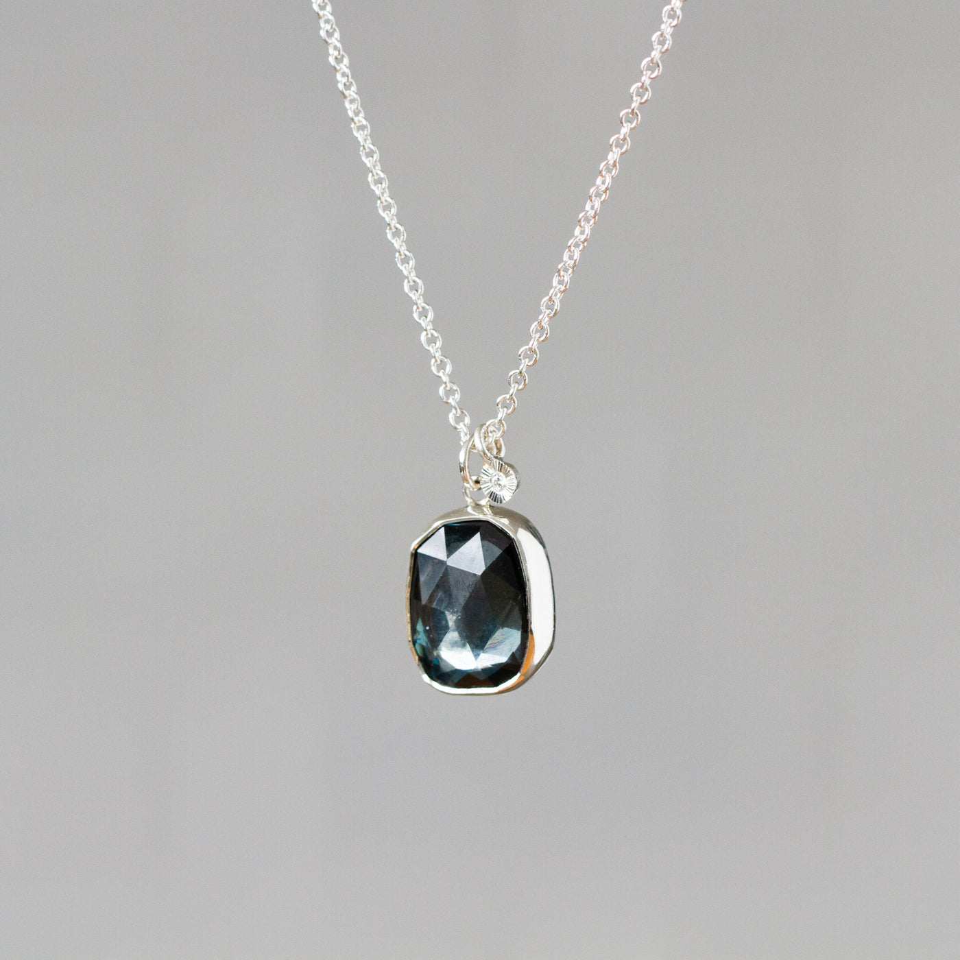 This regal gemstone pairing showcases the deep oceanic beauty of a 6.83-carat rose cut London Blue Topaz with my signature rise pendant—a sterling silver sun drop featuring a twinkling diamond center surrounded by hand-engraved sunburst rays. The rich blue topaz, reminiscent of California's deepest coastal waters, catches light from every angle in its smooth silver bezel setting. Together, these sterling silver elements create a conversation starter that feels both modern and timeless. Suspended on an 18-inch sterling silver cable chain.