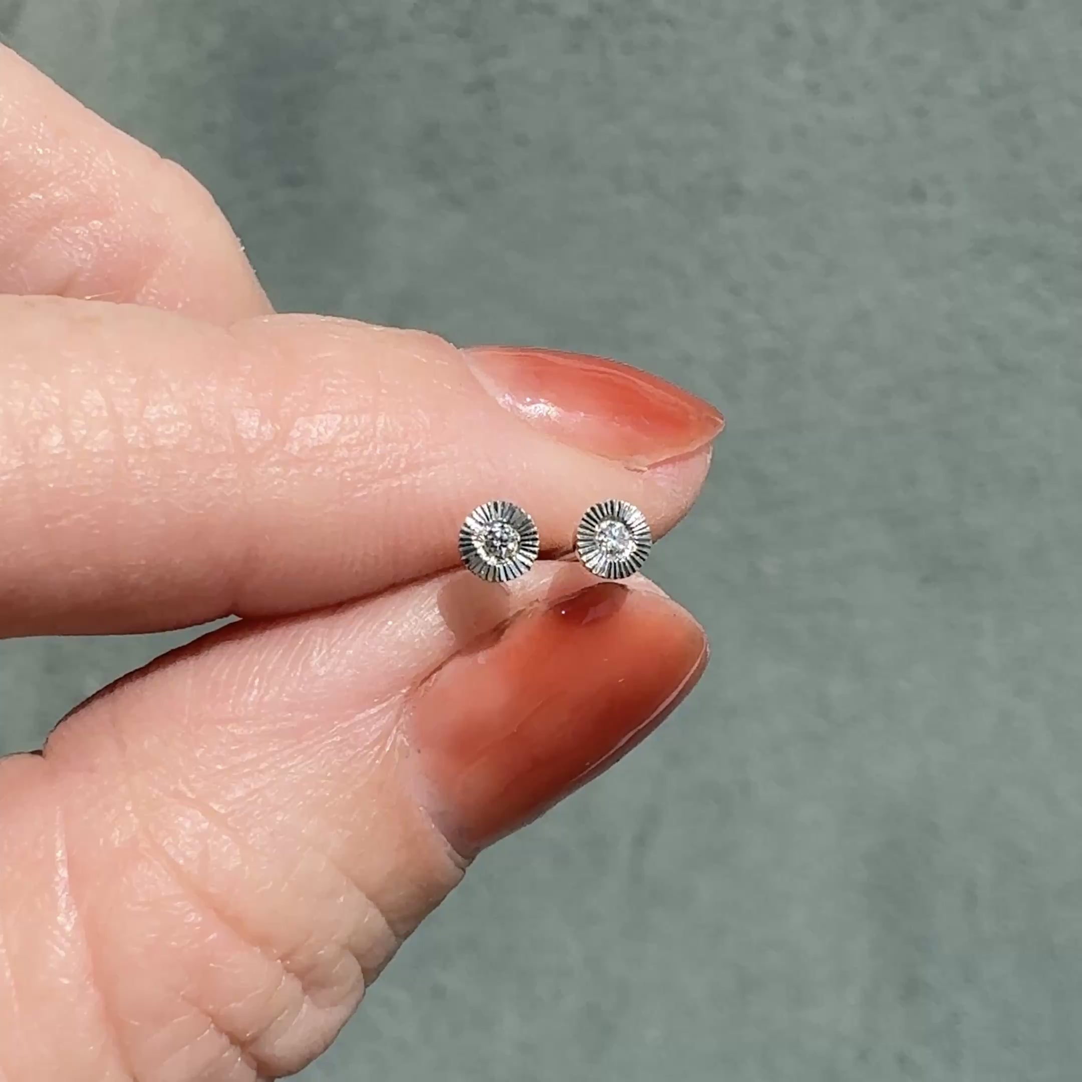 Our signature Aurora design, scaled to its most delicate size, features sparkling recycled diamonds nestled within hand-engraved rays that shimmer like sunbeams. These petite studs strike a perfect balance between elegance and simplicity. The artfully engraved sunburst pattern catches and reflects light with every movement, creating a captivating display.